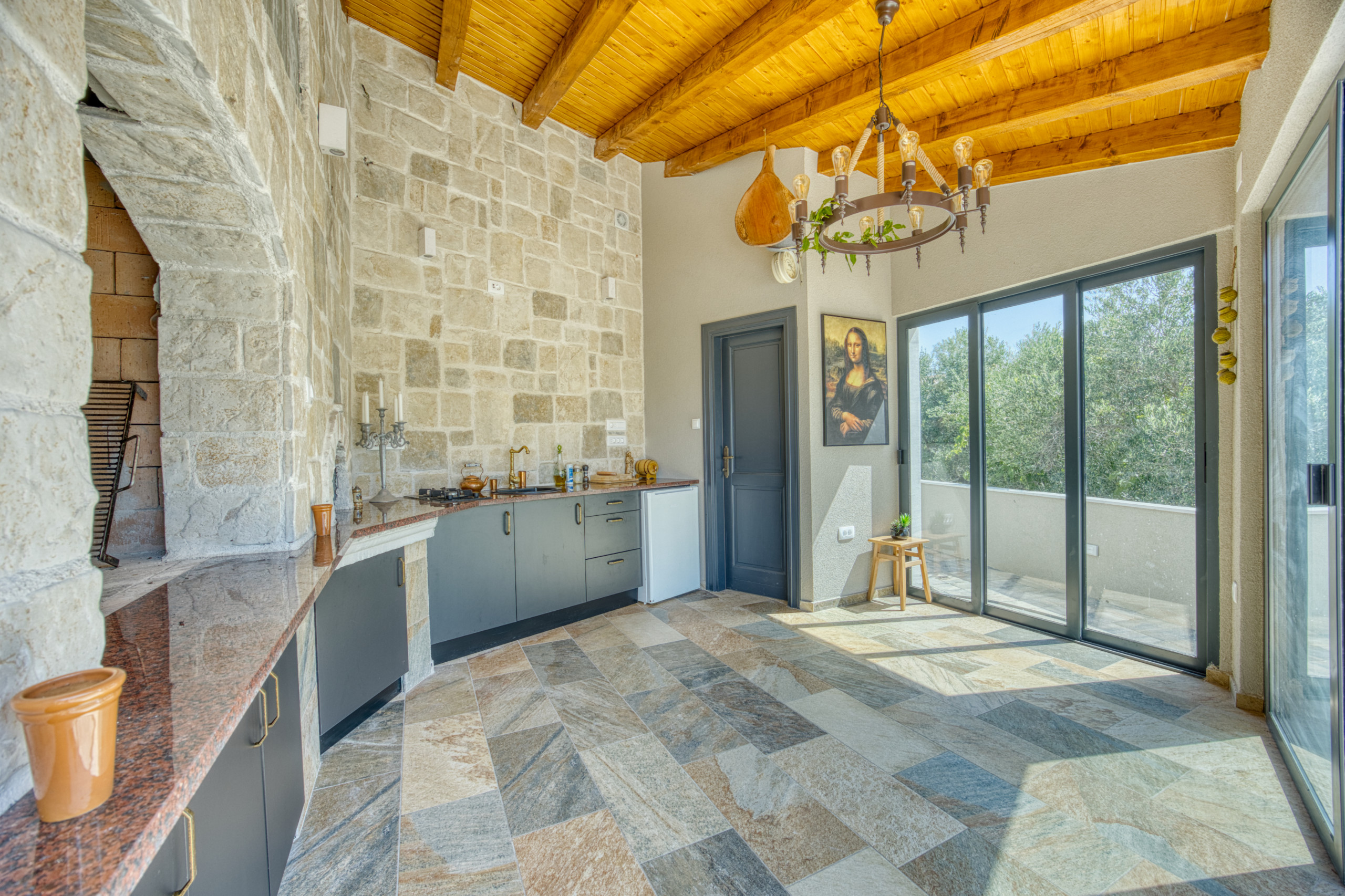 Die Außenanlage des Ferienhauses verfügt über einen Swimmingpool mit Sonnenliegen und Sonnenschirmen, einen Kinderspielbereich und ein nicht zu übersehenes Detail: die fantastische Grillanlage. Der Grillbereich verfügt über eine Küche und einen offenen Kamin zum Zubereiten von Familienmahlzeiten.