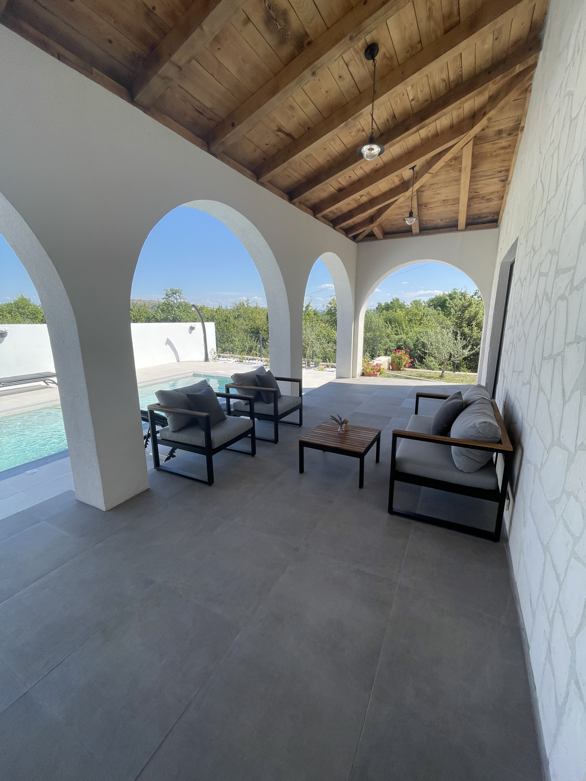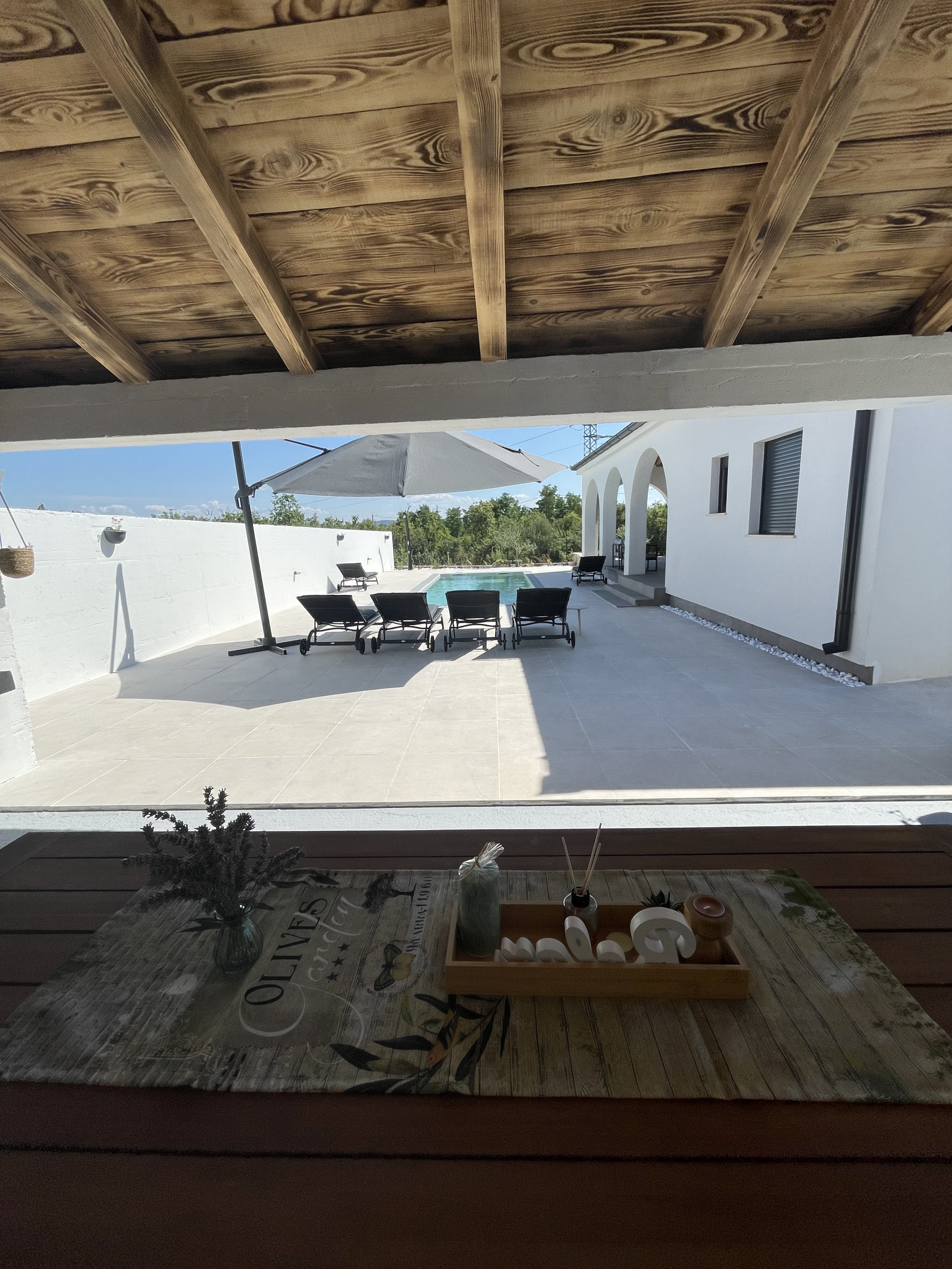 Das Anwesen liegt auf einem großen, vollständig eingezäunten Grundstück, das Privatsphäre und Sicherheit garantiert. Im Außenbereich befinden sich zwei großzügige Terrassen, ein Pool mit Sonnenliegen und Sonnenschirmen, eine Außendusche, ein Esstisch im Freien sowie ein gemauerter Grill für die Zubereitung von Speisen unter freiem Himmel. Für Kinder steht ein Spielplatz zur Verfügung, und ein separates WC im Außenbereich sorgt für zusätzlichen Komfort.