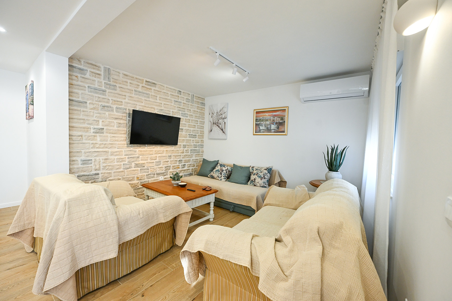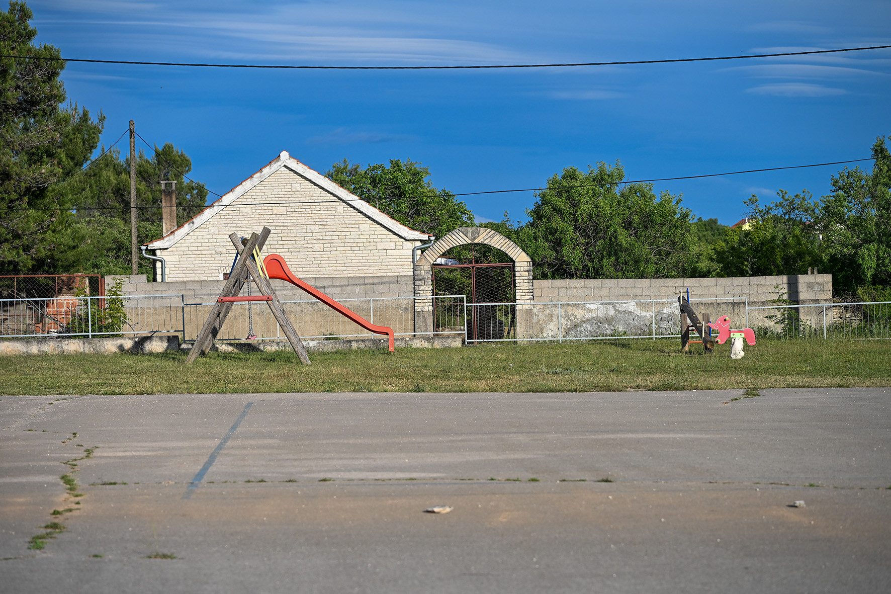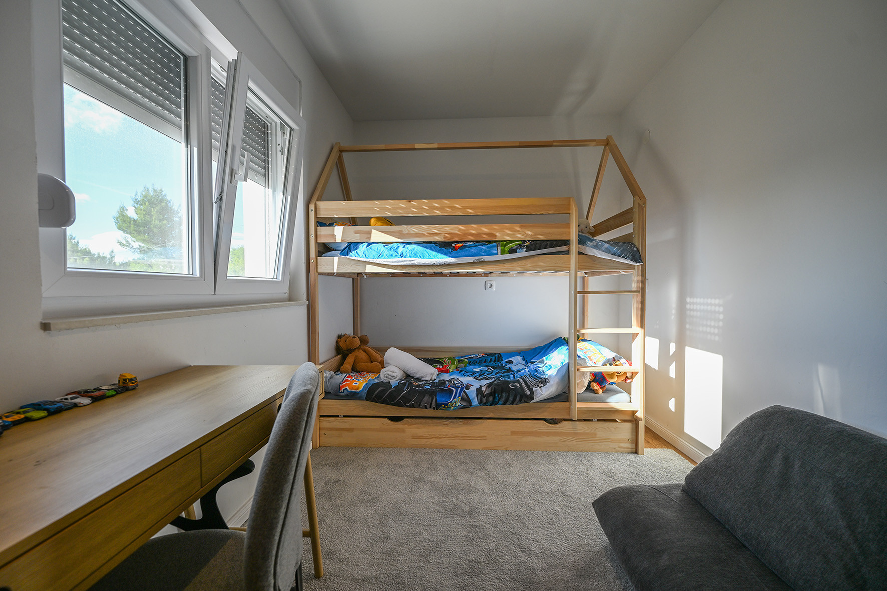 Das Haus bietet zwei Badezimmer mit Duschen, eine voll ausgestattete Küche, einen Essbereich mit Esstisch und ein geräumiges Wohnzimmer mit Fernseher. Das gesamte Haus wird über Fußbodenheizung beheizt, während das Wohnzimmer und ein Doppelschlafzimmer klimatisiert sind. Direkt neben dem Haus befindet sich ein großer Kinderspielplatz mit einem Fußballtor und einem Spielhaus mit Schaukeln, einer Wippe und einer Rutsche, was diese Immobilie besonders für Familien mit Kindern geeignet macht.