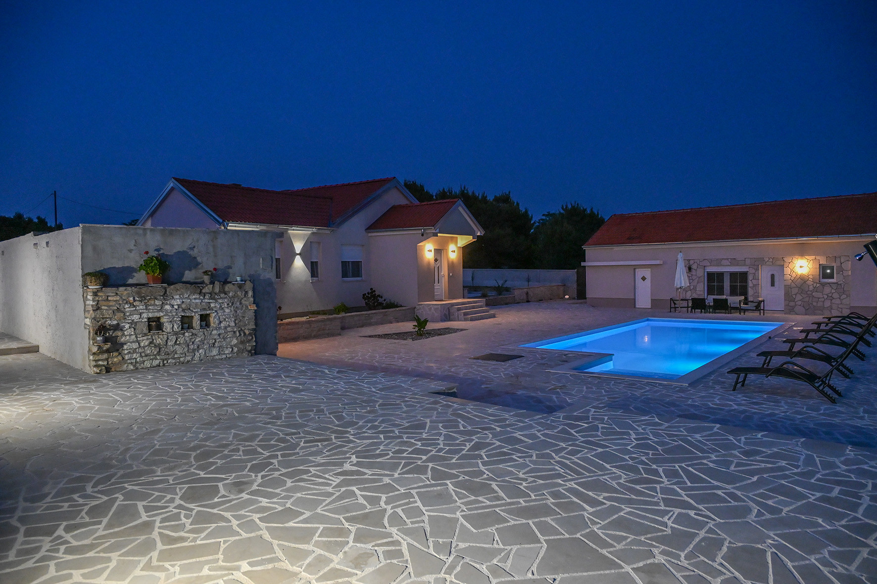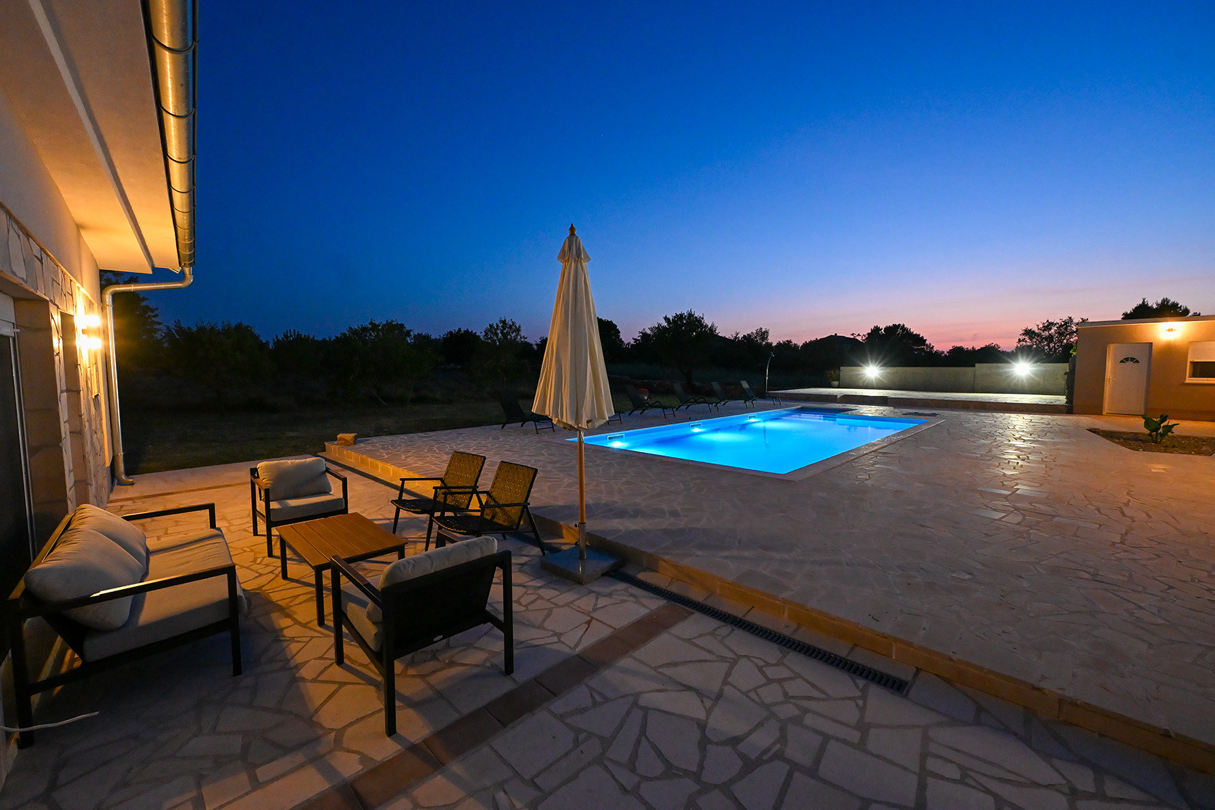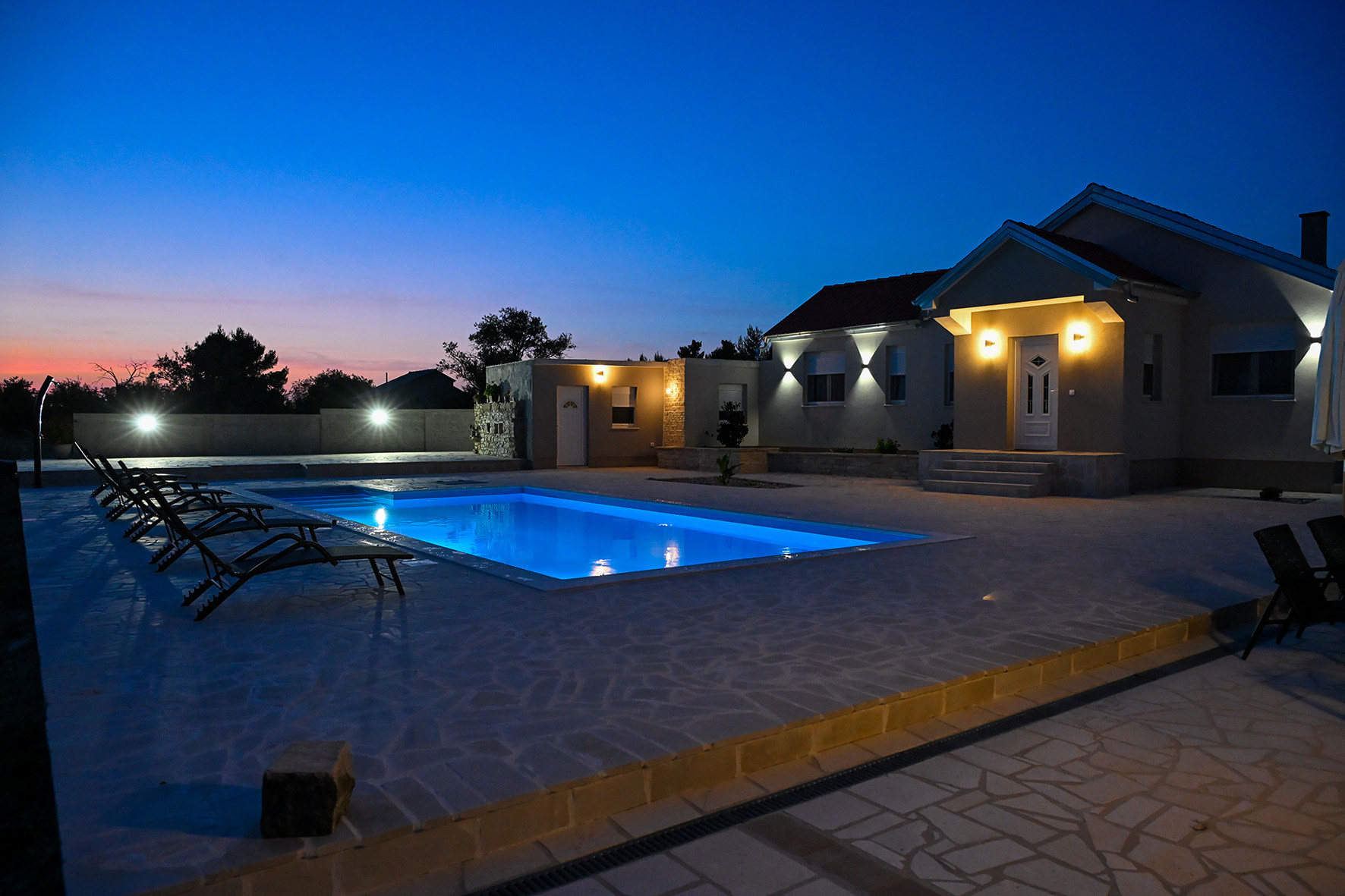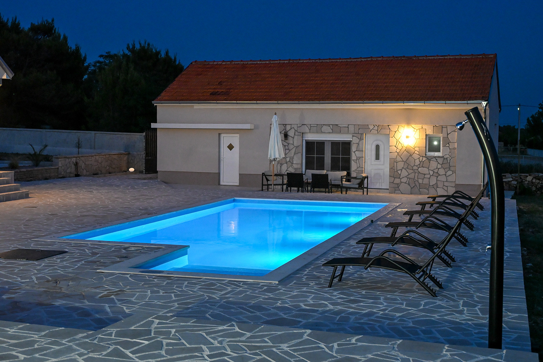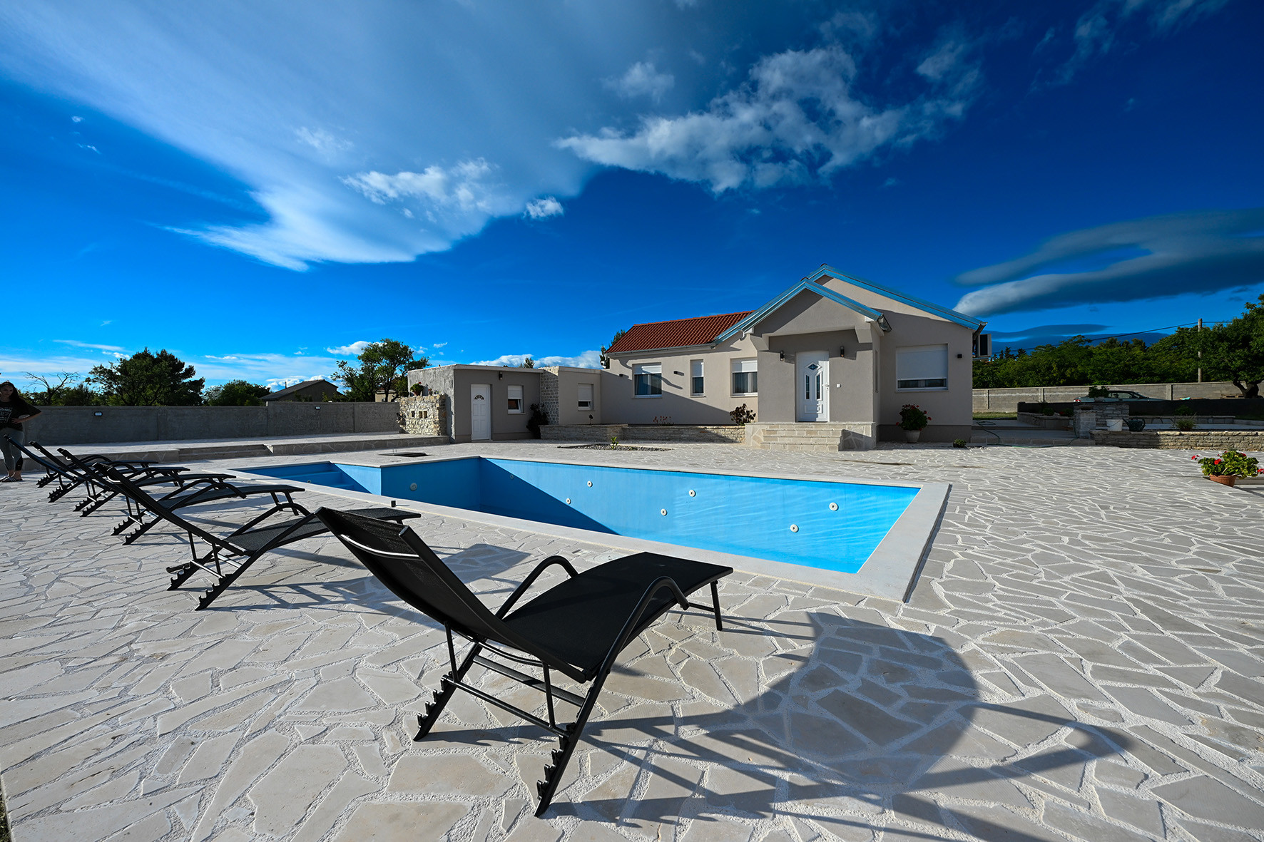 Gäste können einen 12 m x 5 m großen Swimmingpool mit integrierter Hydromassage, Sonnenliegen und einer Außendusche genießen. Das Anwesen liegt auf einem geräumigen Grundstück von 3.500 m². Eine große Terrasse mit Outdoor-Sitzmöbeln ist perfekt zum Entspannen im Freien. Zusätzlich zu einem Garagenparkplatz stehen drei weitere Parkplätze im Hof zur Verfügung.