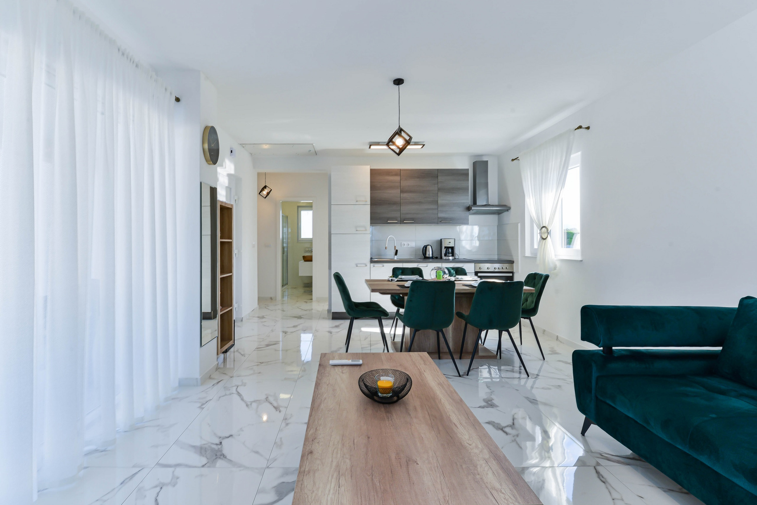 Im Inneren finden Sie einen offenen Wohnbereich mit Wohnzimmer, Esszimmer und Küche mit direktem Ausgang zur Terrasse. Es gibt 2 Schlafzimmer mit Doppelbetten und einem aufklappbaren Doppelsofa für maximal 6 Gäste. Ein Badezimmer mit Dusche ist vorhanden. Das Haus verfügt über 2 Parkplätze auf dem Grundstück, Kabel-TV, WLAN im gesamten Gebäude und 3 individuell regulierbare Klimaanlagen.