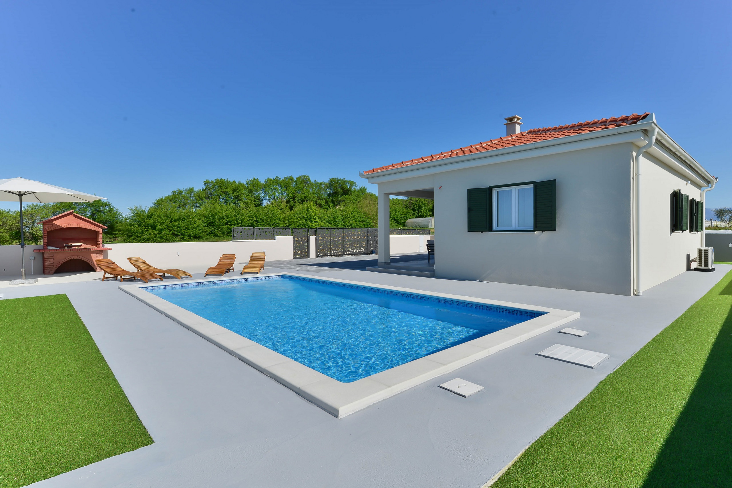 Auf dem 400 m2 großen Grundstück befindet sich ein Swimmingpool mit Sonnenliegen, ein BBQ-Bereich, sowie eine mit Gartenmöbeln ausgestattete überdachte Terrasse. Der Grundstücksgarten ist nur ein kleines Stück Grün, da das Haus von Natur umgeben ist.