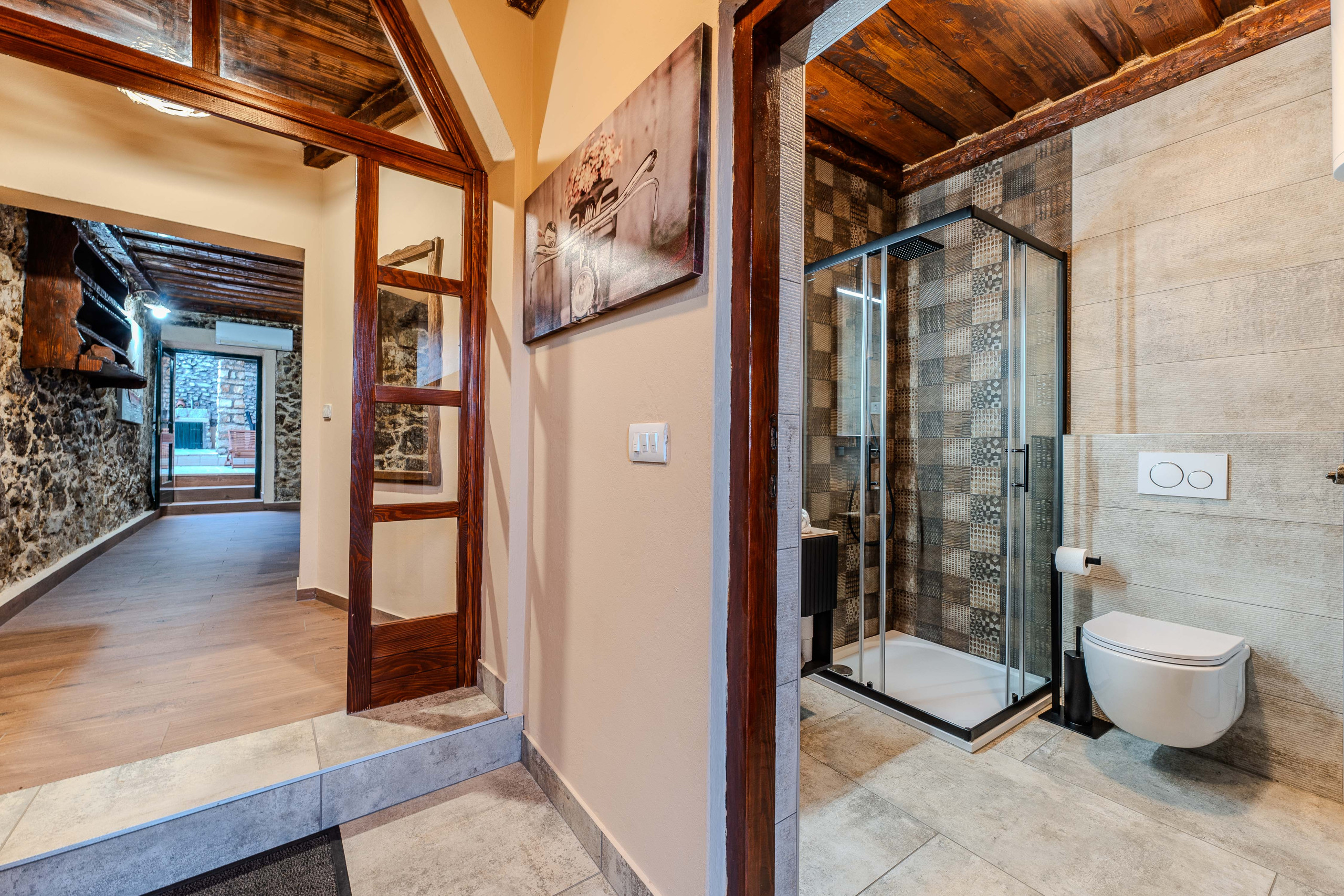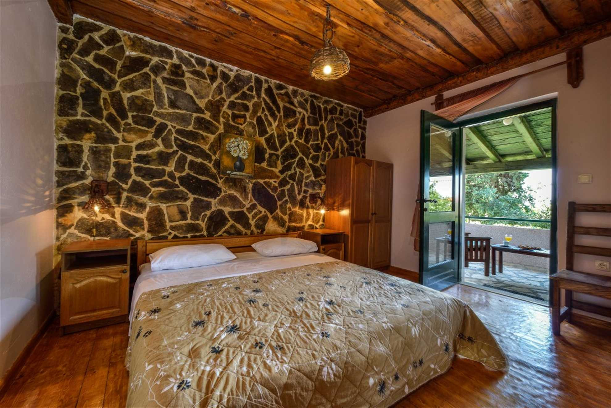 Die 120 m² große Villa bietet Platz für bis zu 6 Personen. Sie verfügt über zwei Schlafzimmer mit Doppelbetten, ein gemütliches Wohnzimmer mit Kamin und Schlafsofa sowie eine voll ausgestattete Küche, ideal für gemeinsame Mahlzeiten. Das Interieur ist im rustikalen Stil mit viel Stein und Holz gestaltet und schafft eine warme und einladende Atmosphäre. WLAN und SAT-TV stehen den Gästen zur Verfügung.
