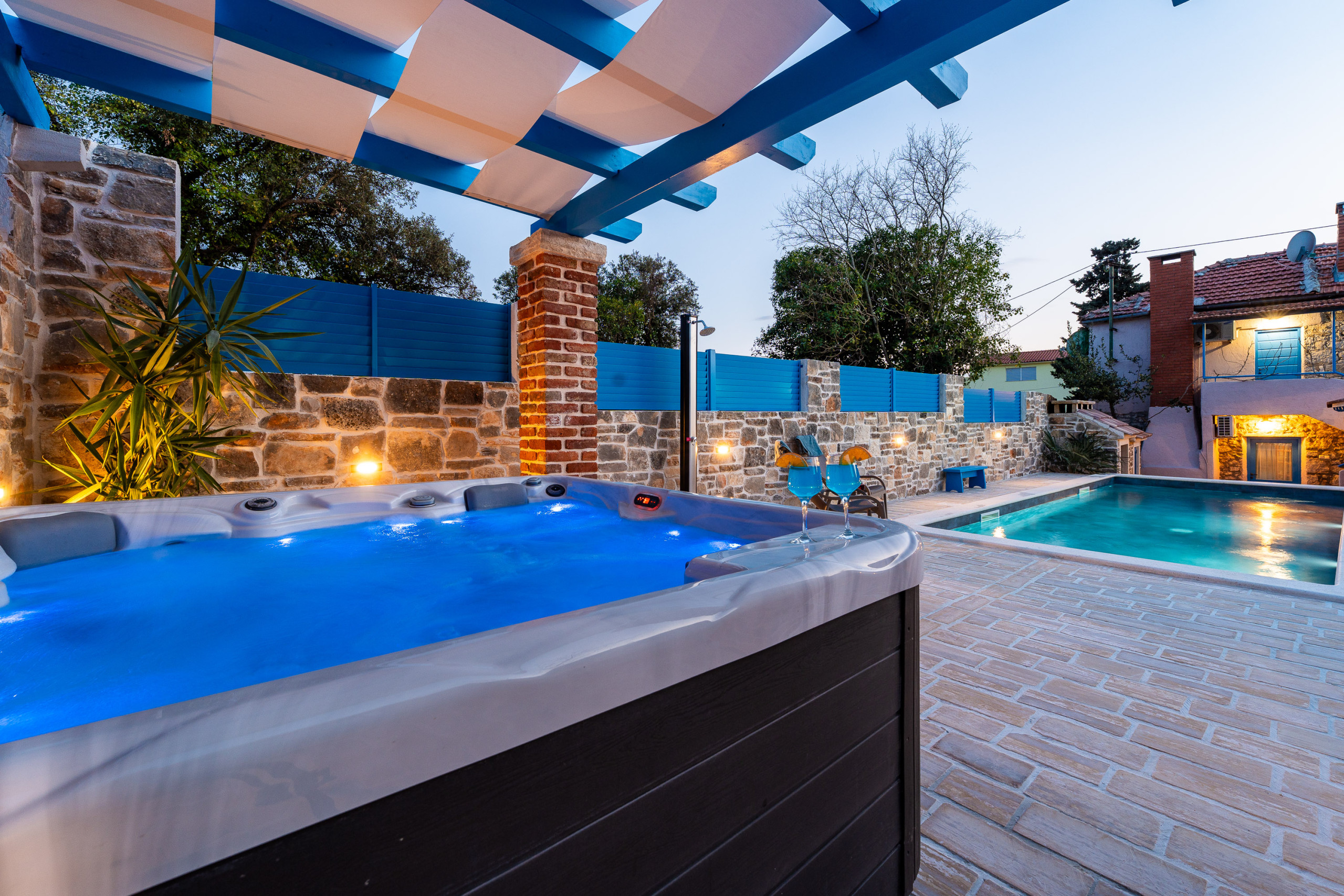 Der vollständig umzäunte Außenbereich garantiert absolute Privatsphäre und lädt zum Entspannen ein. Im Garten hinter dem Haus befinden sich ein beheizter Swimmingpool, ein Jacuzzi, Sonnenliegen sowie eine überdachte Terrasse mit Essbereich im Freien. Ein traditioneller Steingrill rundet das mediterrane Ambiente perfekt ab und sorgt für unvergessliche Sommerabende.