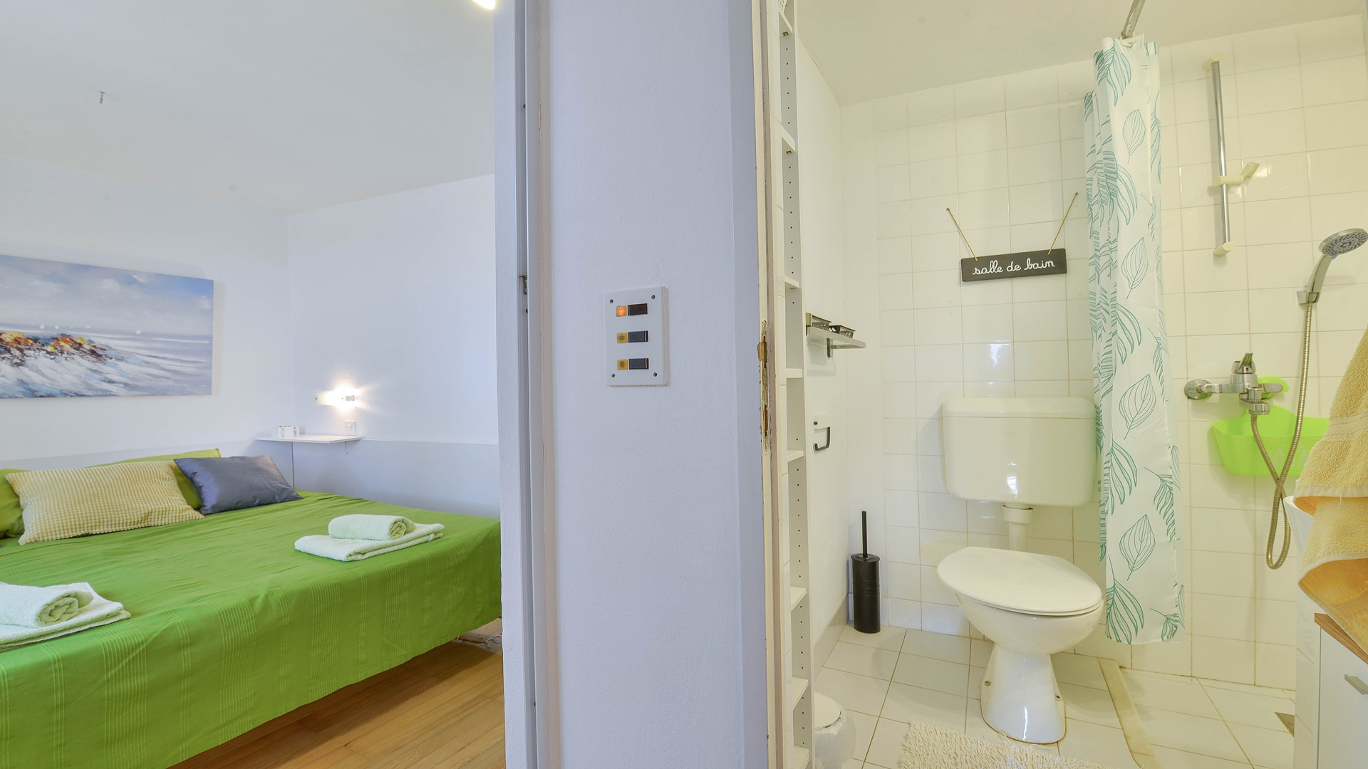 Im Obergeschoss befinden sich ein Doppelzimmer mit Balkon und herrlichem Meerblick sowie ein Schlafzimmer mit zwei Einzelbetten. Im Erdgeschoss gibt es ein Badezimmer mit Badewanne, und im ersten Stock bietet das Doppelzimmer Zugang zu einem zusätzlichen WC.