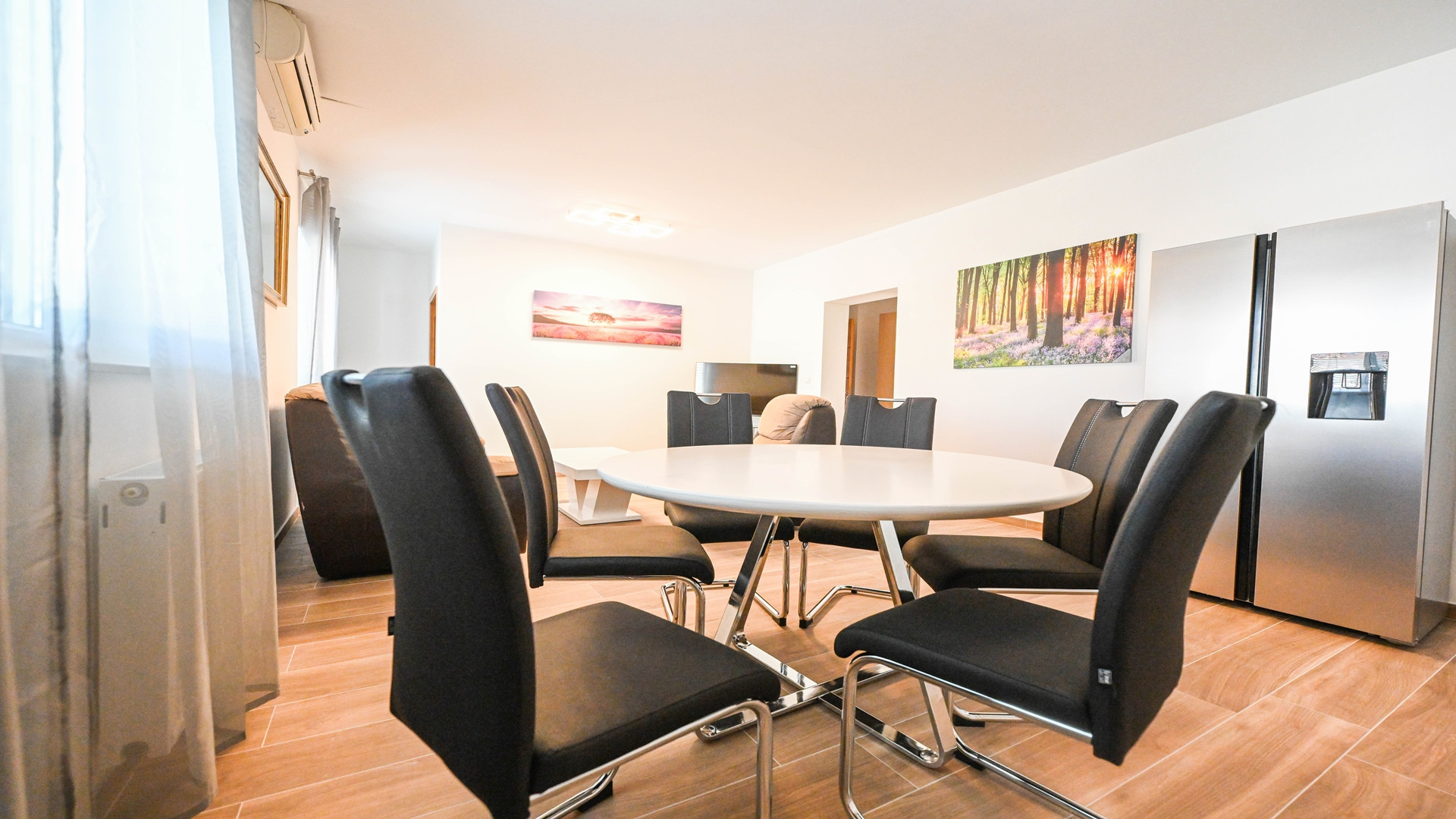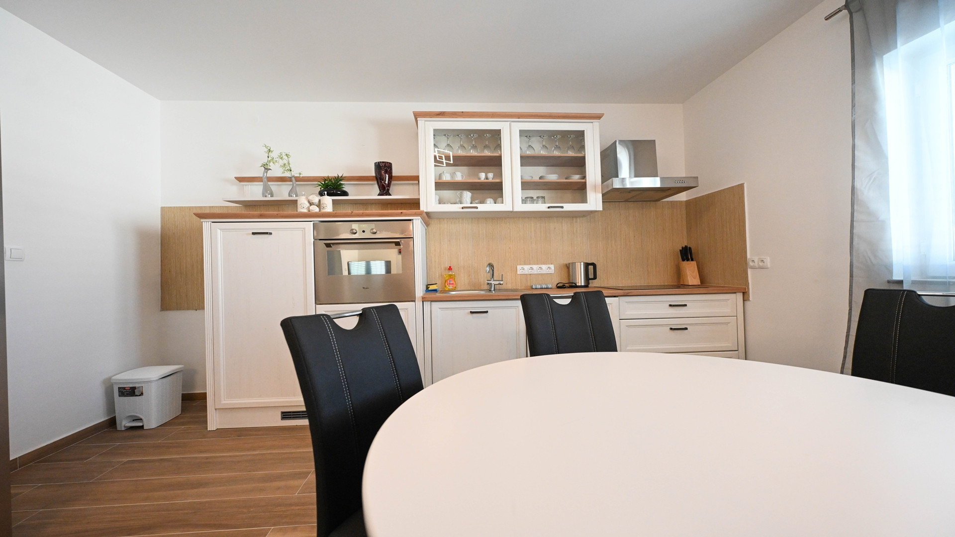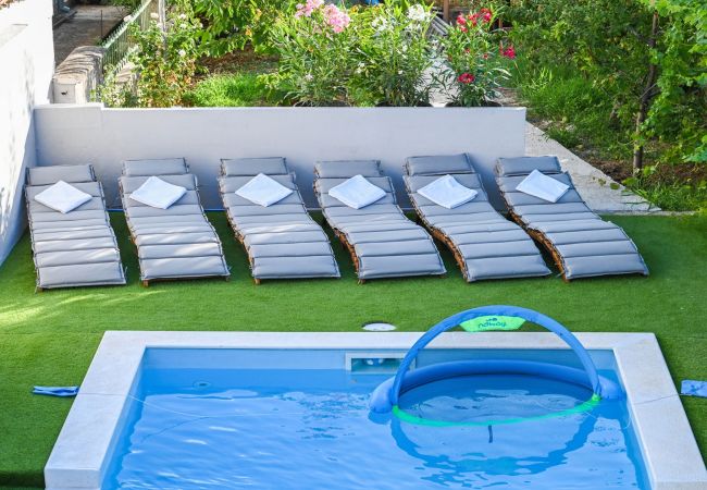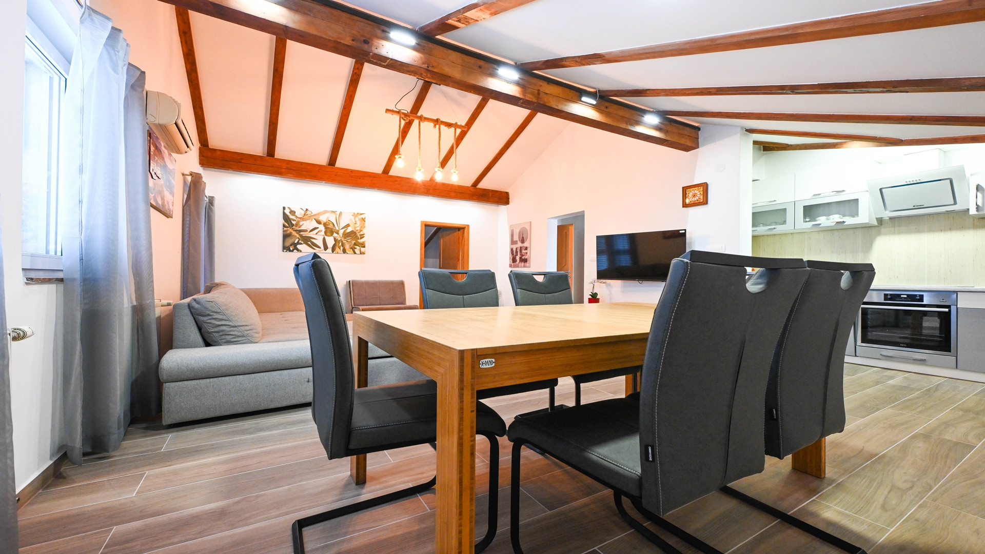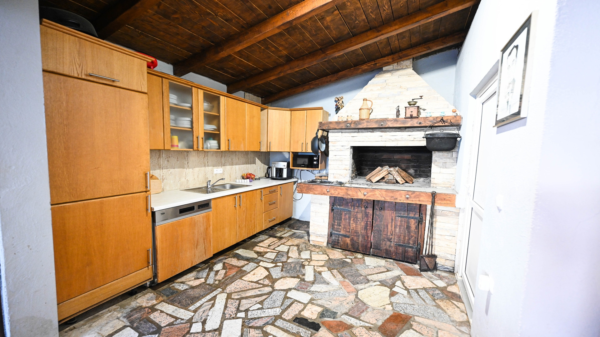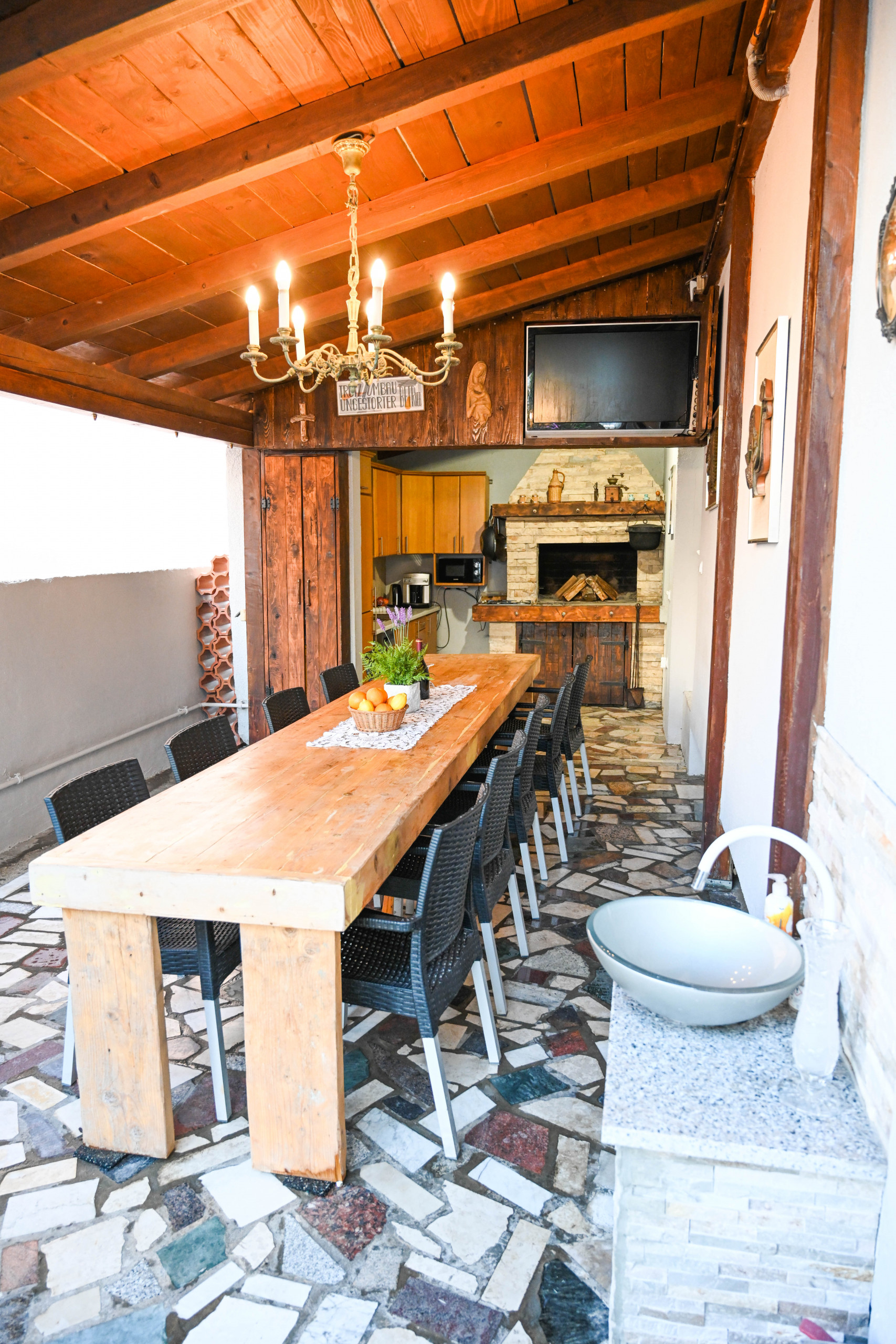 Wenn Sie sich im schönen Poolbereich vergnügen, schwimmen oder sonnenbaden, können Sie alle auf einer bezaubernden Terrasse im dalmatinischen Tavernendekor zusammenkommen. Gemeinsam Mahlzeiten zubereiten, mit Familie und Freunden speisen oder einfach abends in vertrauter Gesellschaft ein Glas Wein trinken – darum geht es.