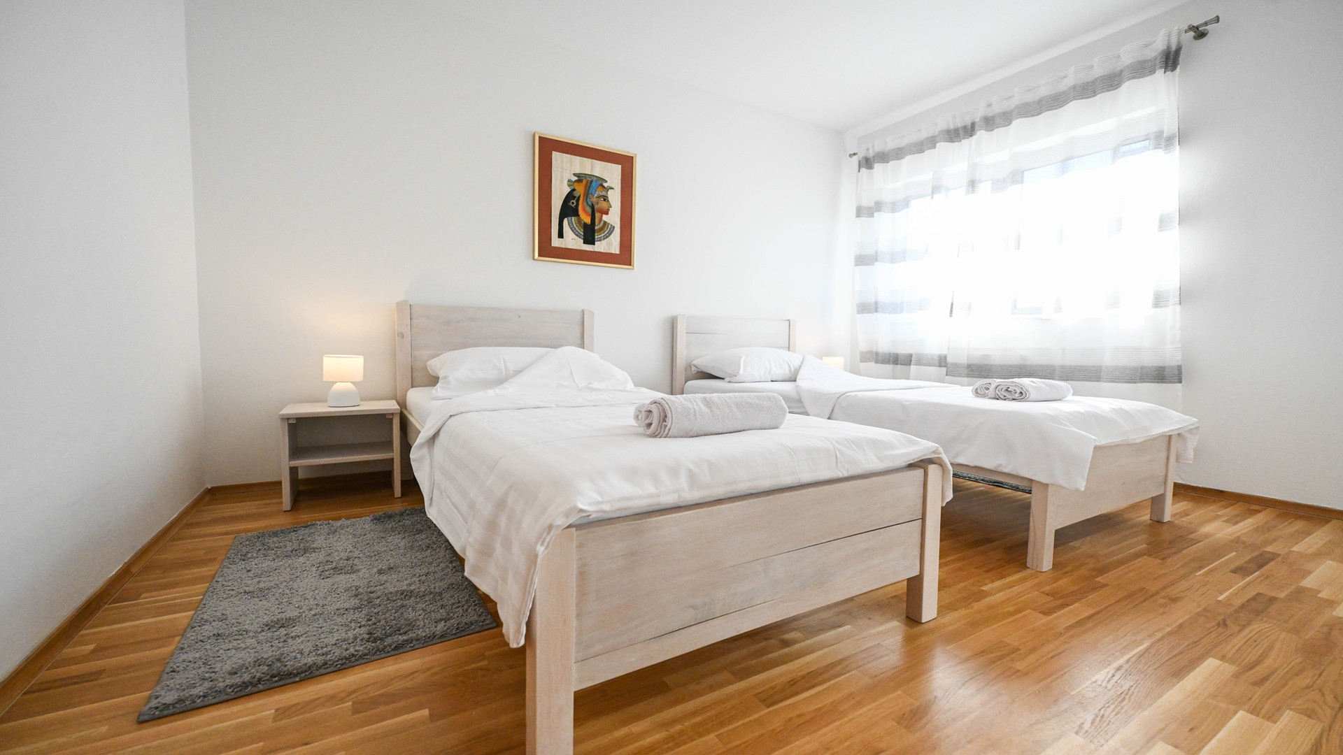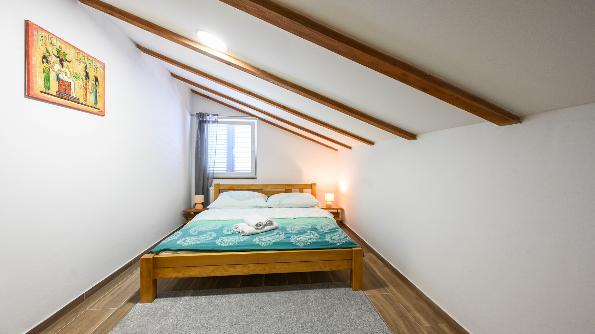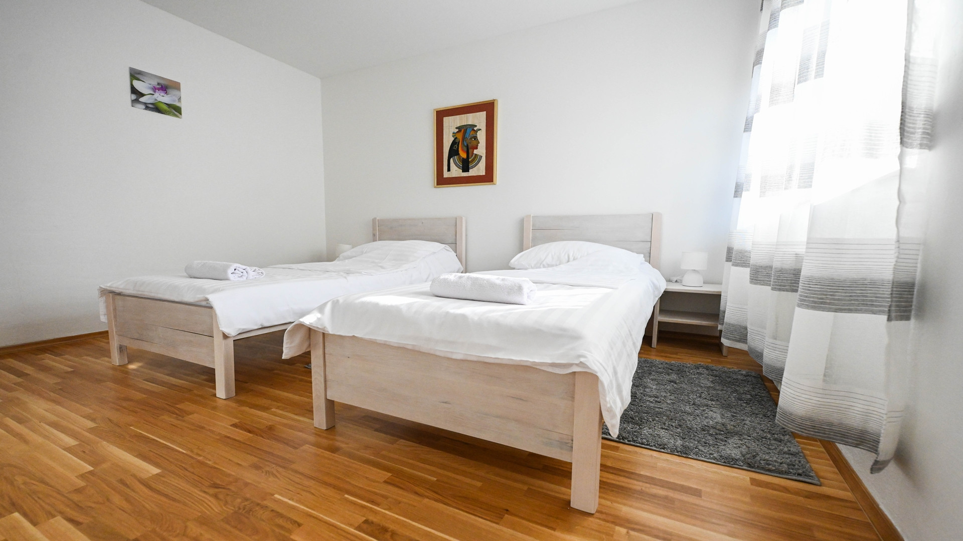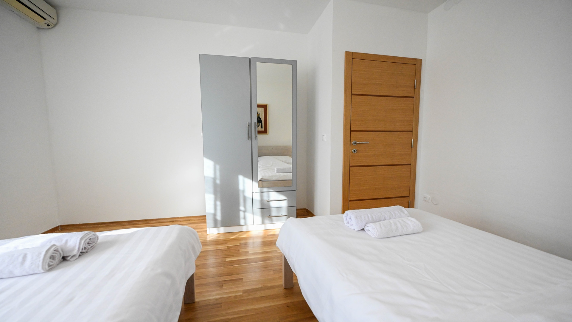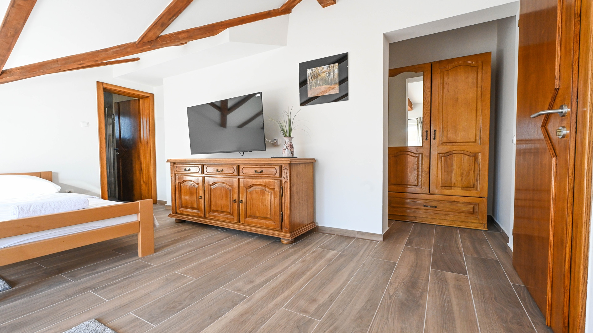 Im ersten Stock befinden sich zwei Schlafzimmer mit je 2 Einzelbetten, die auf Wunsch zusammengestellt werden können, und ein Schlafzimmer mit einem Doppelbett. Im zweiten Stock gibt es ein Schlafzimmer mit 2 Einzelbetten und zwei Schlafzimmer mit Doppelbetten. All diese Annehmlichkeiten machen dieses Ferienhaus zum perfekten Ort für eine Mehrfamilien-Reisegruppe mit maximal 12 Gästen.