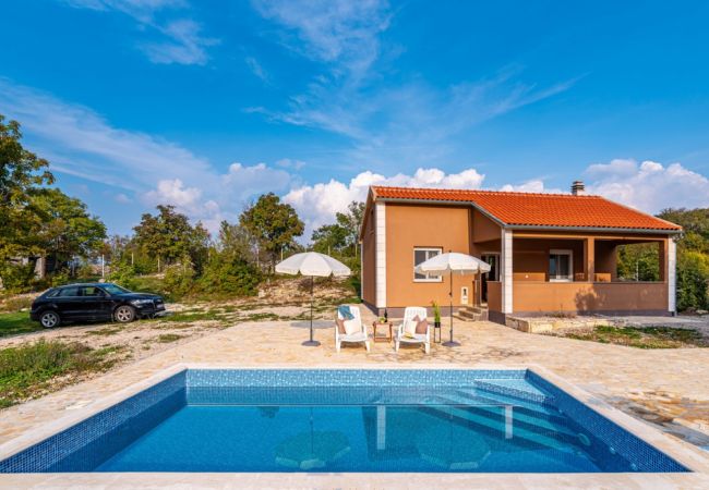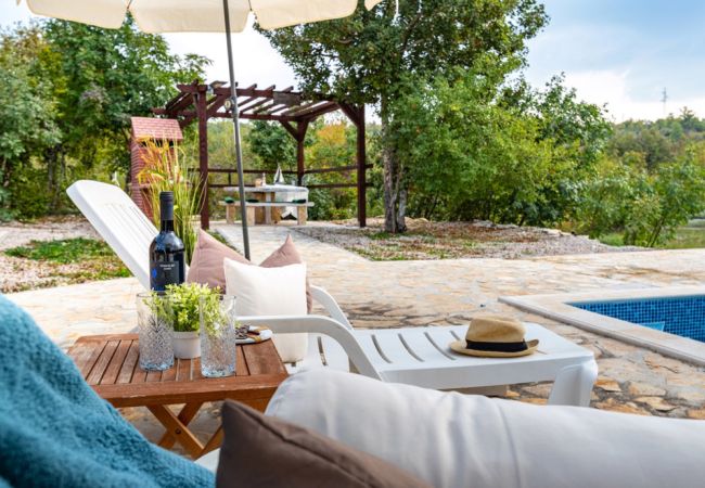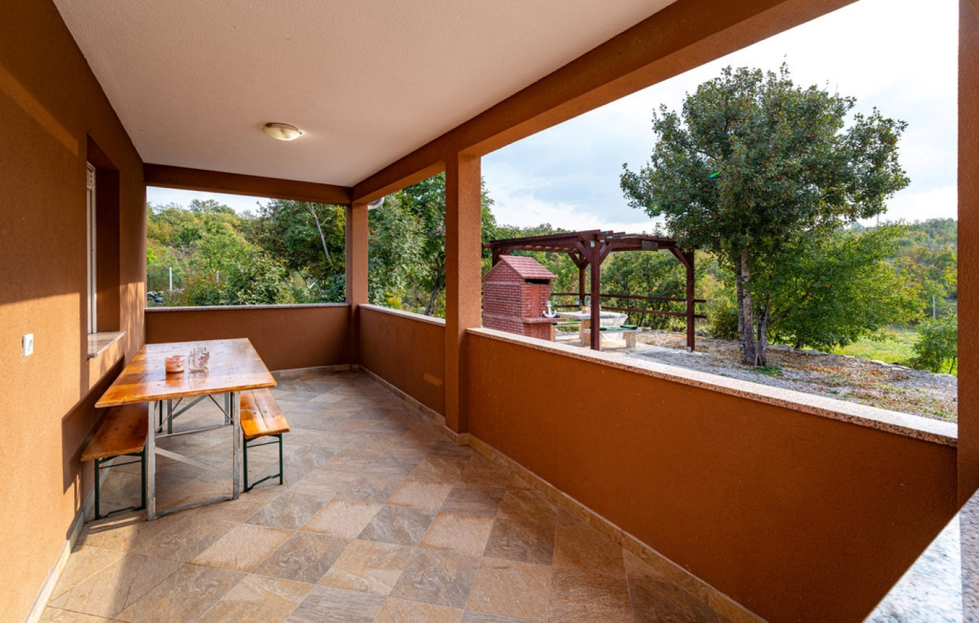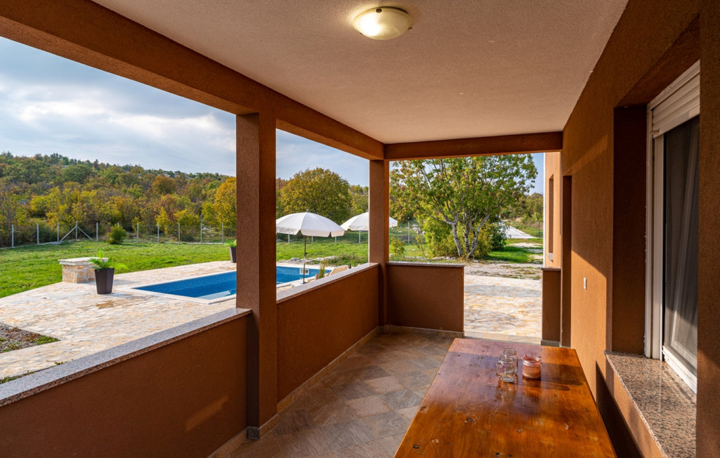 Im Außenbereich können die Gäste den privaten Pool mit einer Fläche von 20 m² genießen, der von Liegestühlen und einem Sonnenschirm umgeben ist – perfekt zum Sonnenbaden und Erfrischen. Der Hof (1000 m2) ist vollständig eingezäunt, was Privatsphäre und Sicherheit gewährleistet, besonders praktisch für Gäste mit Haustieren. Im Garten befindet sich ein gemauerter Grill, überdacht mit einer Pergola, die an heißen Sommertagen Schatten spendet. Neben dem Haus gibt es auch eine überdachte Terrasse, die ideal ist, um den Morgenkaffee oder den Abend in Ruhe zu genießen.