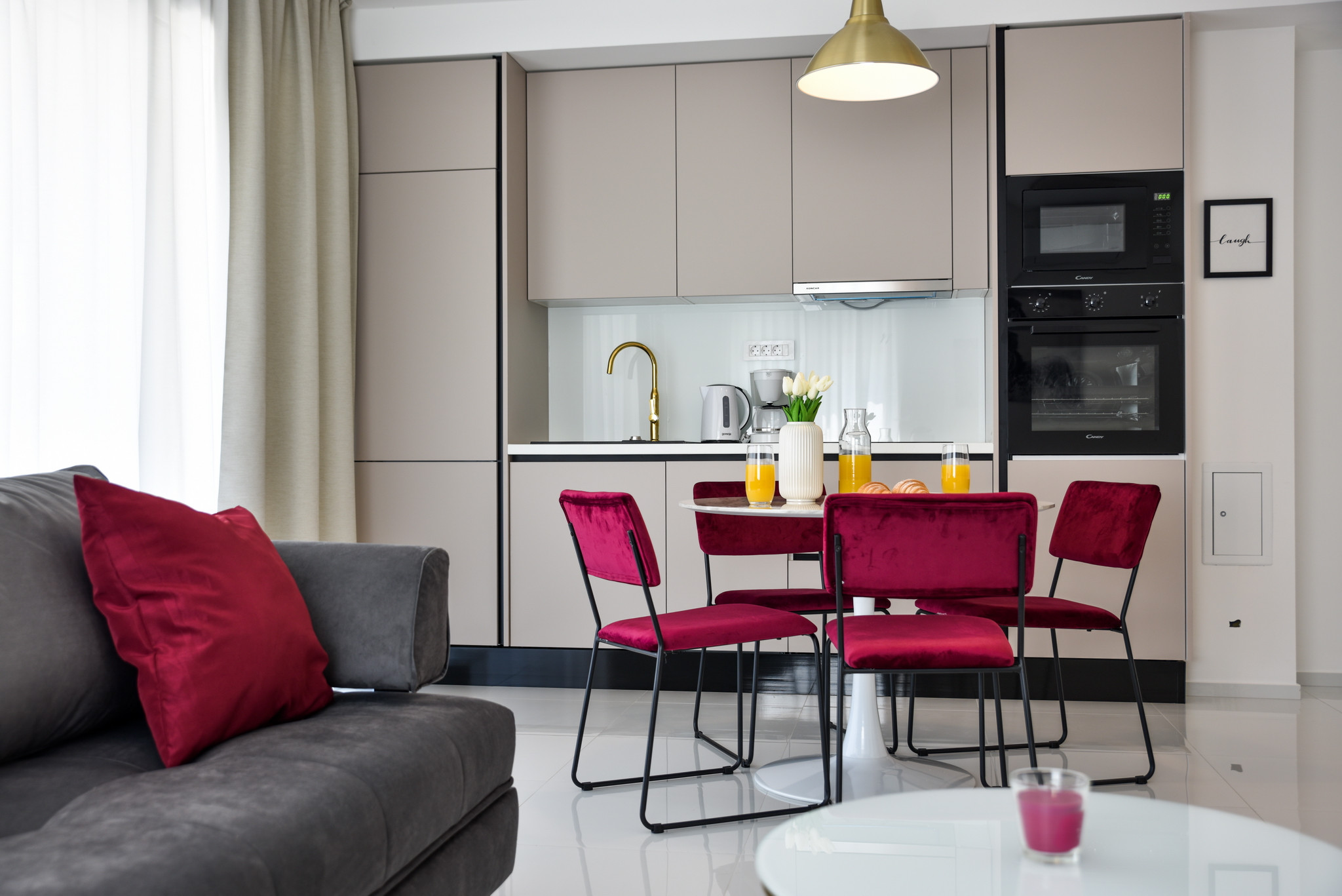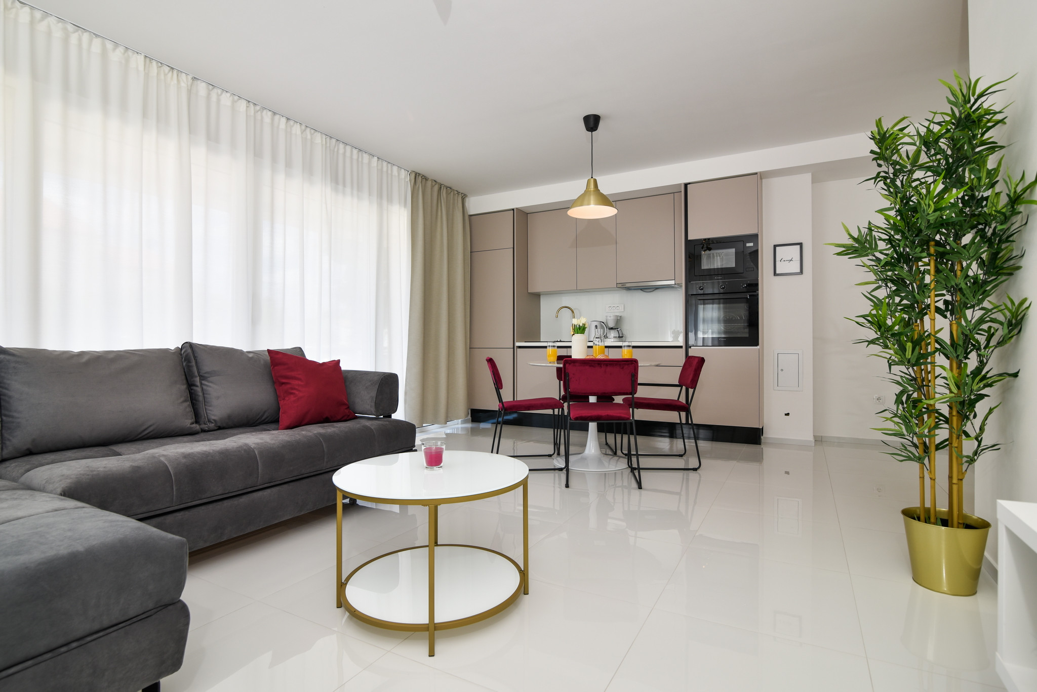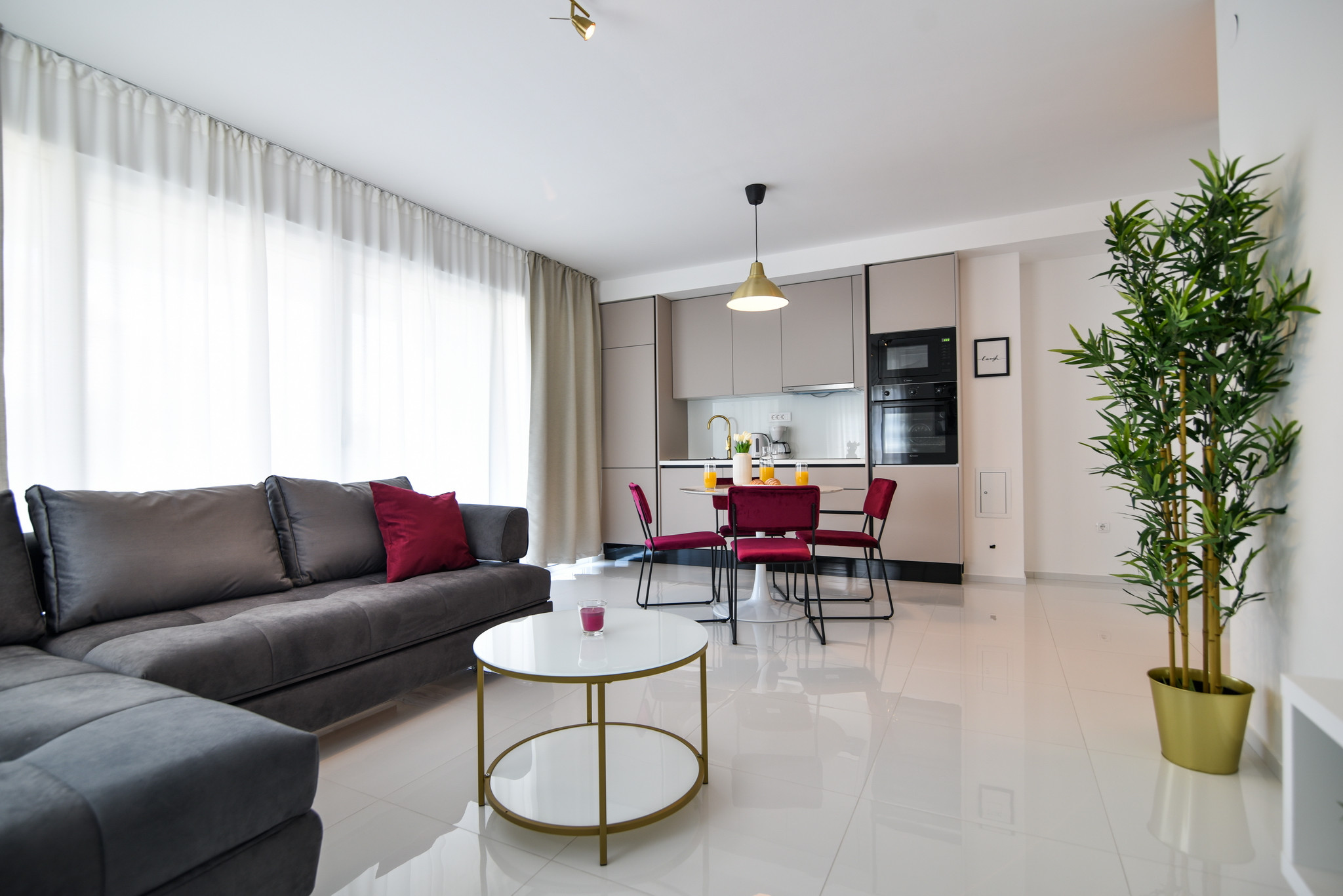 Die Wohnung verfügt über 2 Zimmer mit Doppelbetten und 1 Zimmer mit einem Einzelbett, alle klimatisiert, was sie zu einem perfekten Ort für eine Gruppe von 5 Personen macht. Ein Zimmer verfügt über ein eigenes Badezimmer und die anderen beiden Zimmer teilen sich ein Badezimmer. Das Wohnzimmer, die Küche und das Esszimmer sind offen gestaltet und bieten Raum für angenehme gemeinsame Stunden.