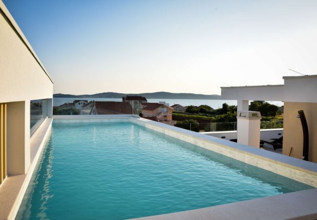 Dieses brandneue Apartment befindet sich in Bibinje, nur 5 km vom Zentrum der Stadt Zadar entfernt. Es ist Teil eines 3-Einheiten-Komplexes mit Gemeinschaftspool und befindet sich im ersten Stock.