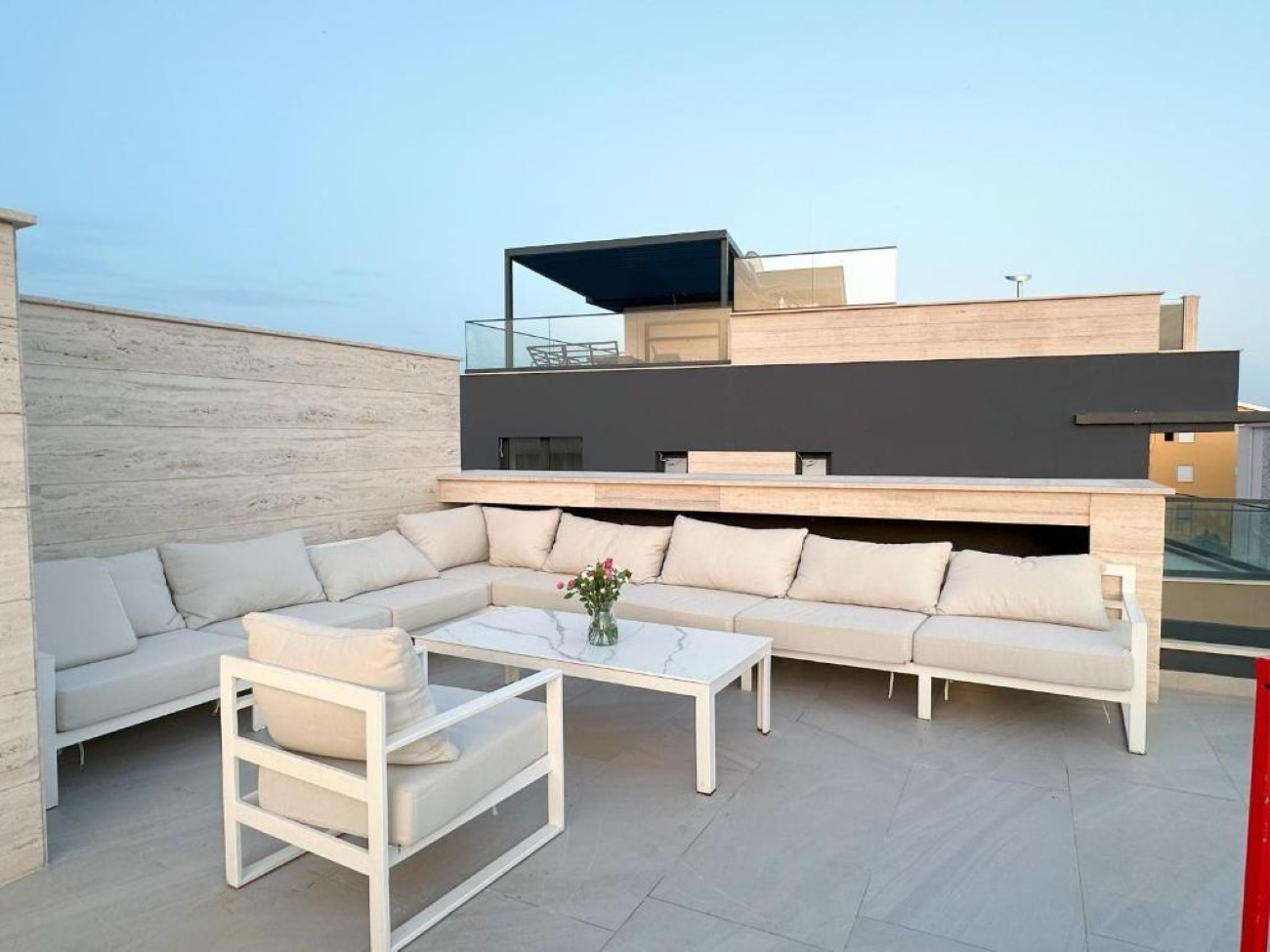Das Penthouse erstreckt sich über großzügige 140 m² Wohnfläche, ergänzt durch einen 20 m² großen Balkon und eine beeindruckende 70 m² große Dachterrasse. Die Inneneinrichtung ist darauf ausgelegt, natürliches Licht und Panoramablick optimal zu nutzen – raumhohe Glaswände öffnen den Raum zum Horizont und lassen Innen- und Außenbereich nahtlos ineinander übergehen.