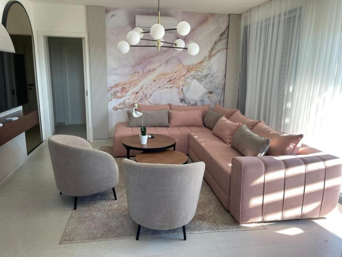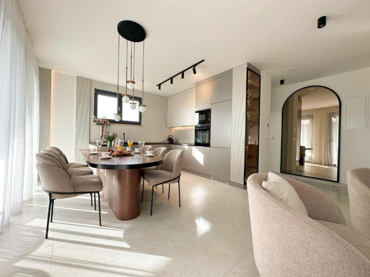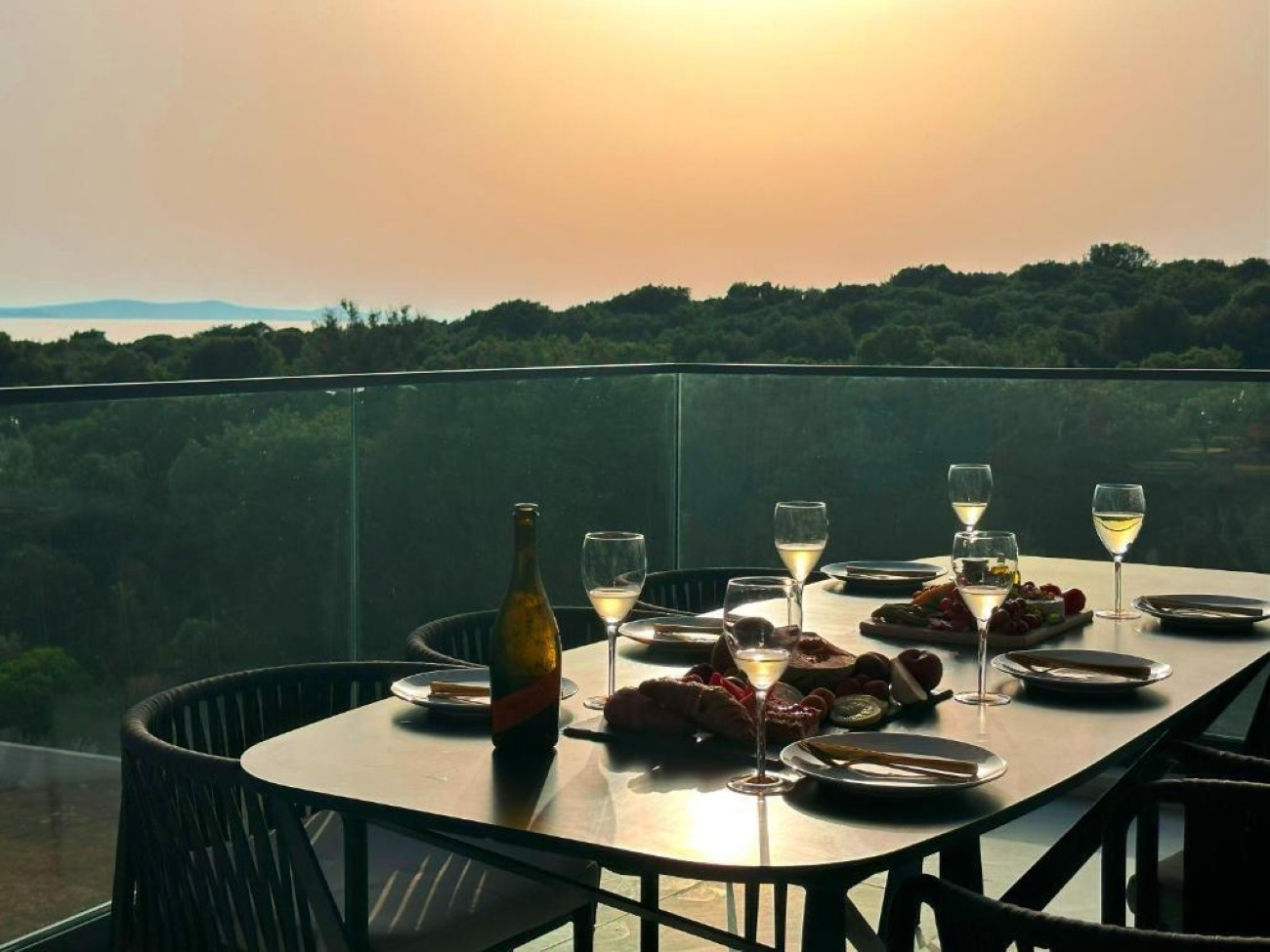 Der großzügige Wohnbereich mit seinen großen Glaswänden ist lichtdurchflutet und schafft eine harmonische Verbindung zur Umgebung. Die voll ausgestattete, moderne Küche ist perfekt für längere Aufenthalte. Zum Apartment gehört außerdem eine private Terrasse mit Esstisch und Stühlen – ideal für Mahlzeiten im Freien.