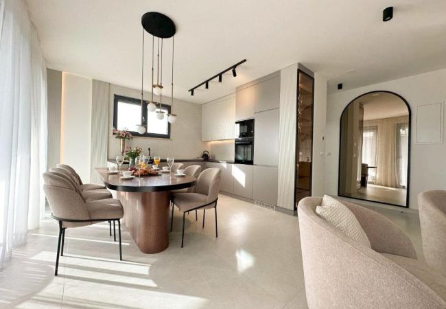 Es verfügt über drei luxuriöse Schlafzimmer mit Doppelbetten (160 x 200 cm). Zwei Schlafzimmer haben einen eigenen Balkon, während das dritte einen atemberaubenden Meerblick bietet. Das Apartment bietet Platz für bis zu 7 Gäste (6+1) und ist somit die ideale Wahl für Familien oder Gruppen, die höchsten Komfort und Privatsphäre suchen.