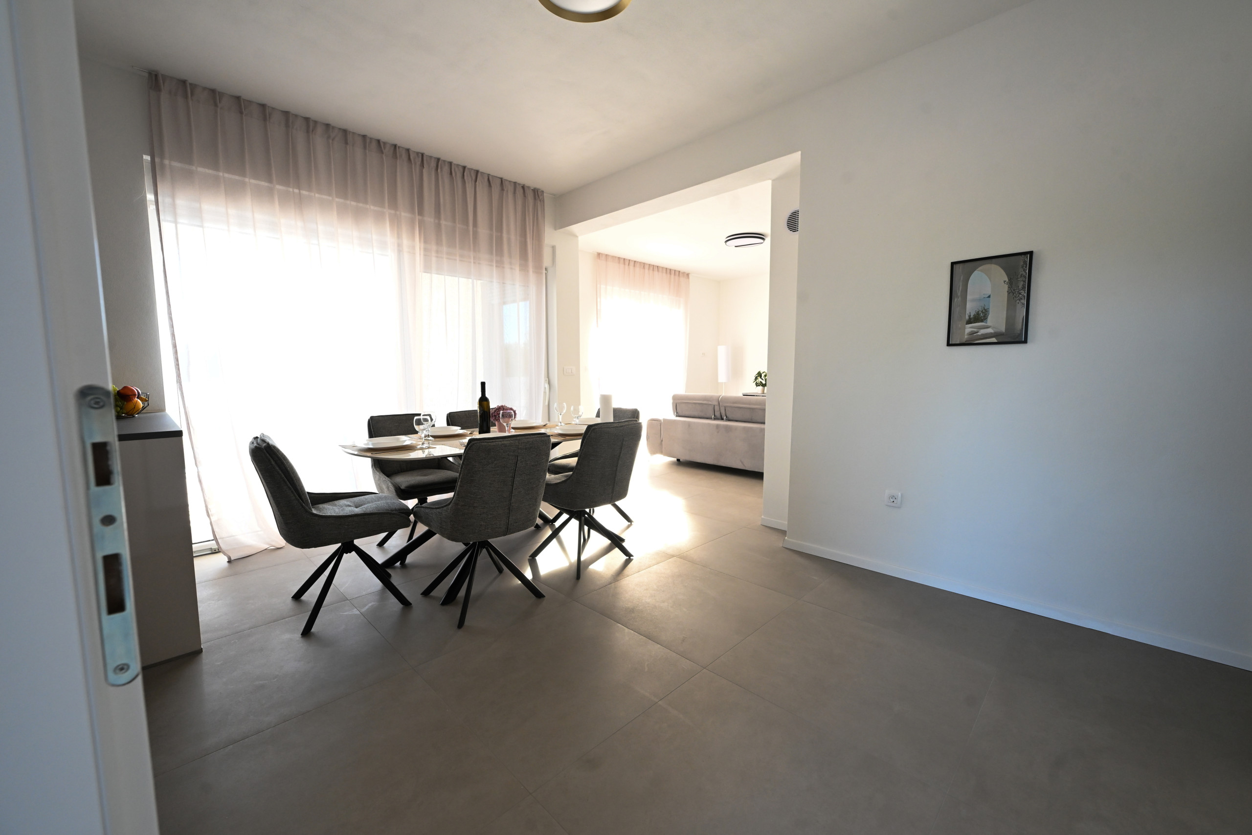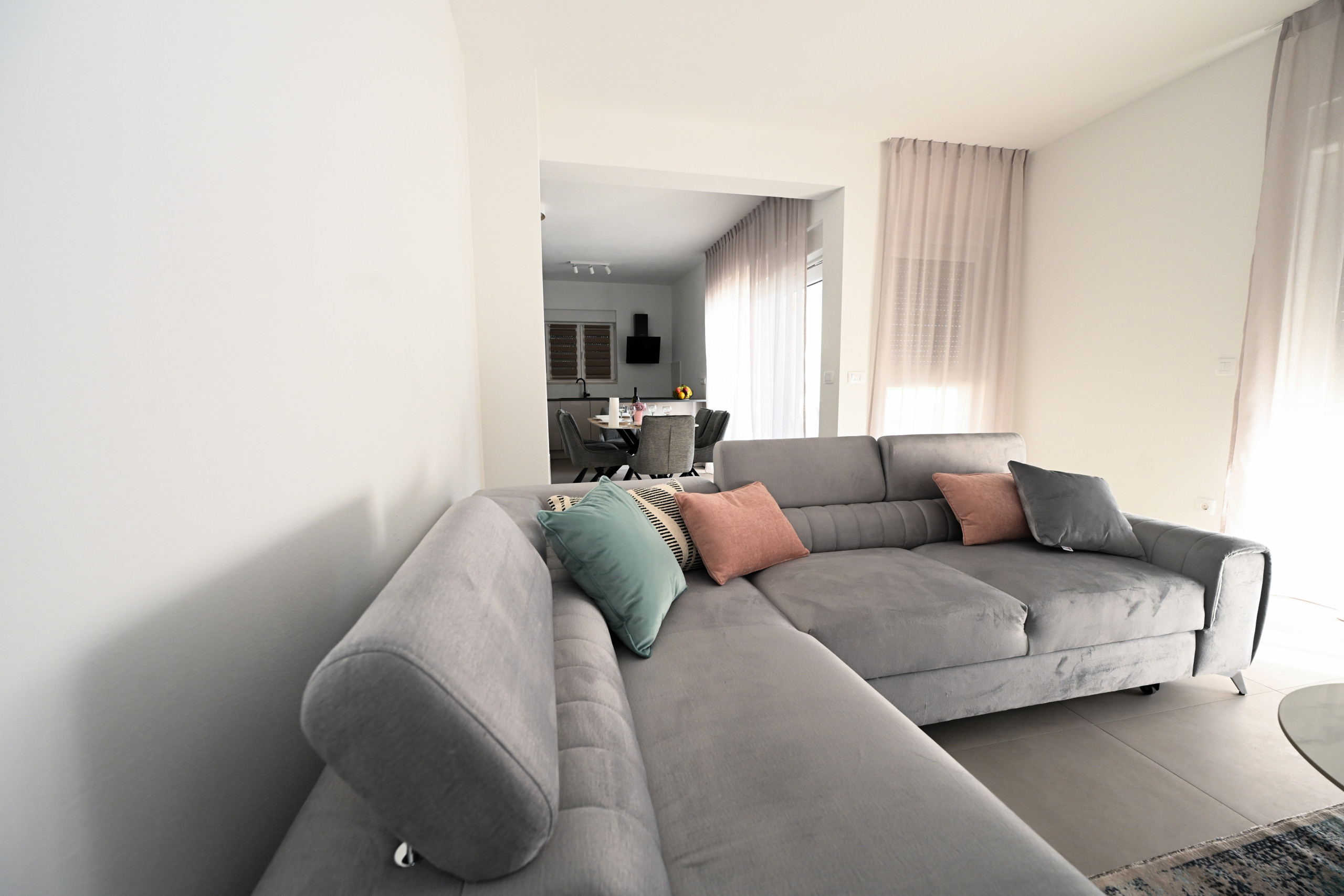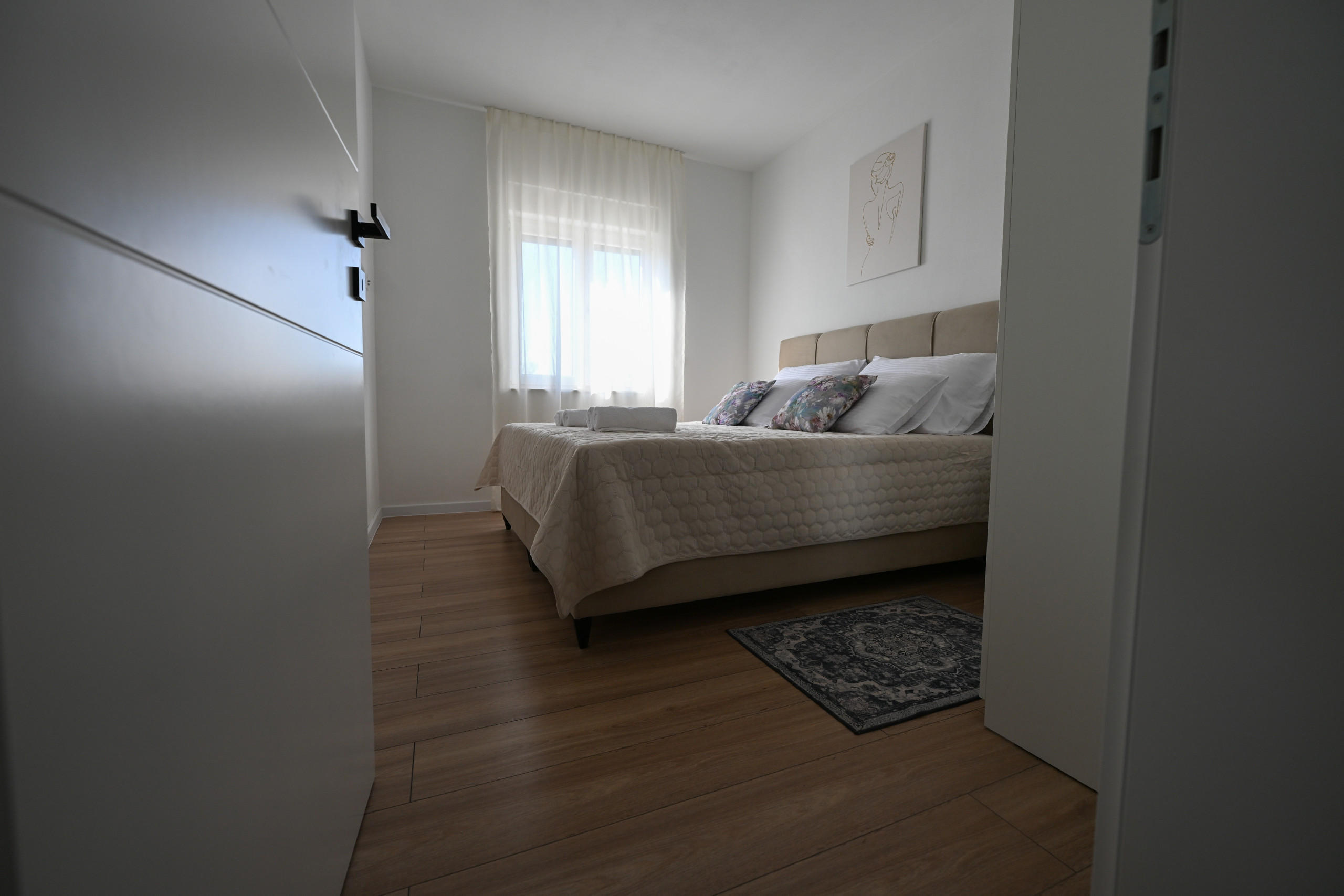 Die Villa bietet Platz für sechs Personen in drei großzügigen Schlafzimmern, jeweils mit einem Doppelbett (180x200 cm). Eine bis zwei weitere Personen können auf dem ausziehbaren Sofa im Wohnzimmer schlafen. Es stehen zwei modern ausgestattete Badezimmer mit Dusche zur Verfügung, eines davon zusätzlich mit Waschmaschine und Trockner – ideal für längere Aufenthalte.