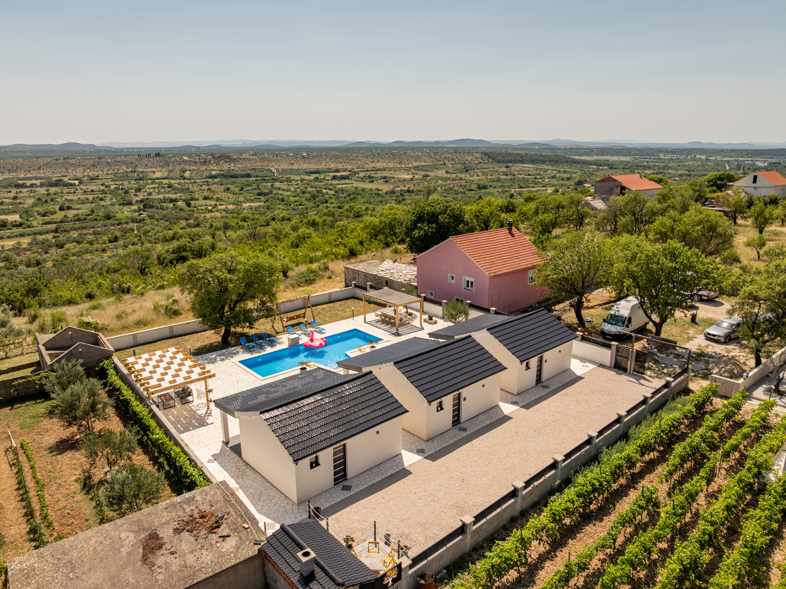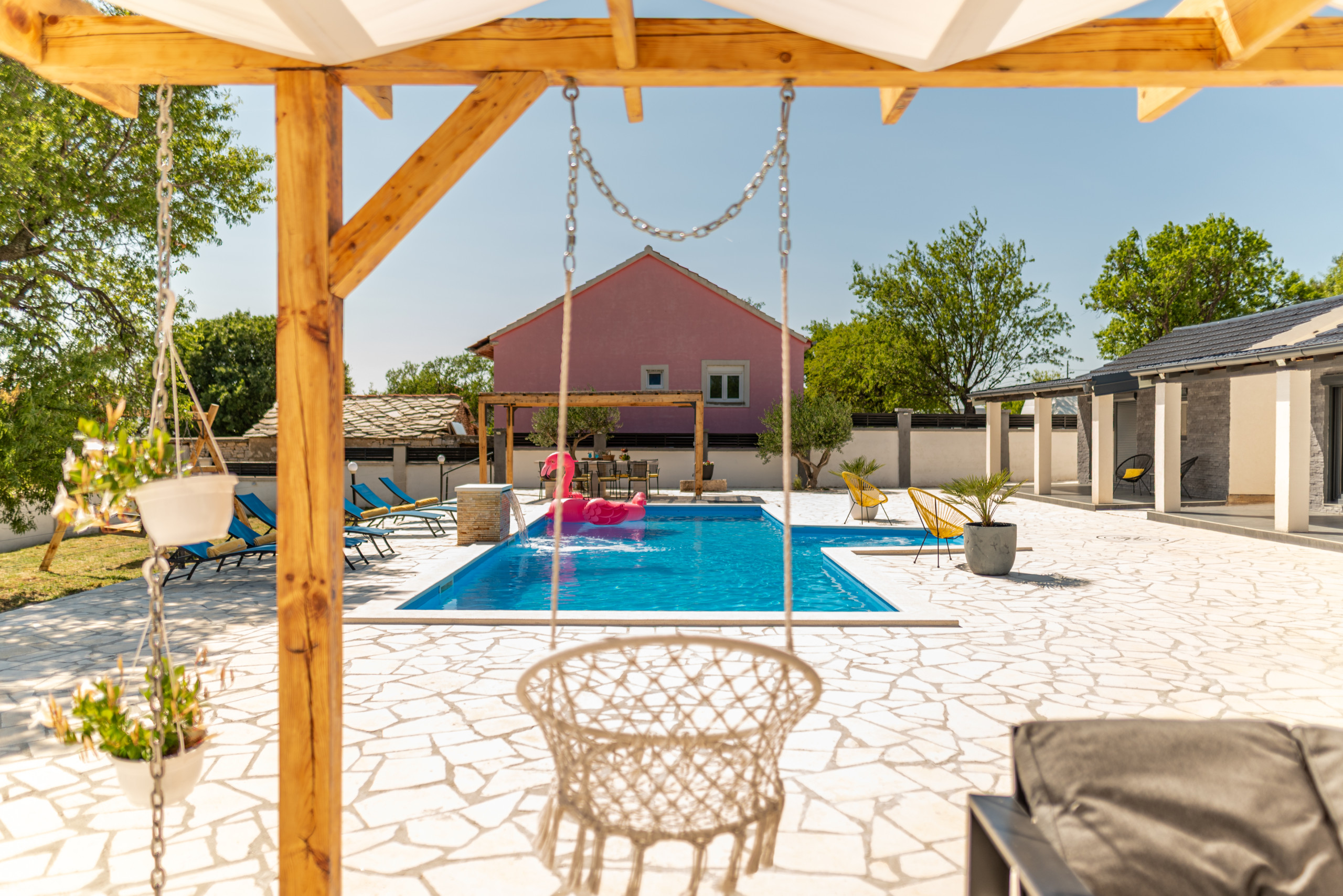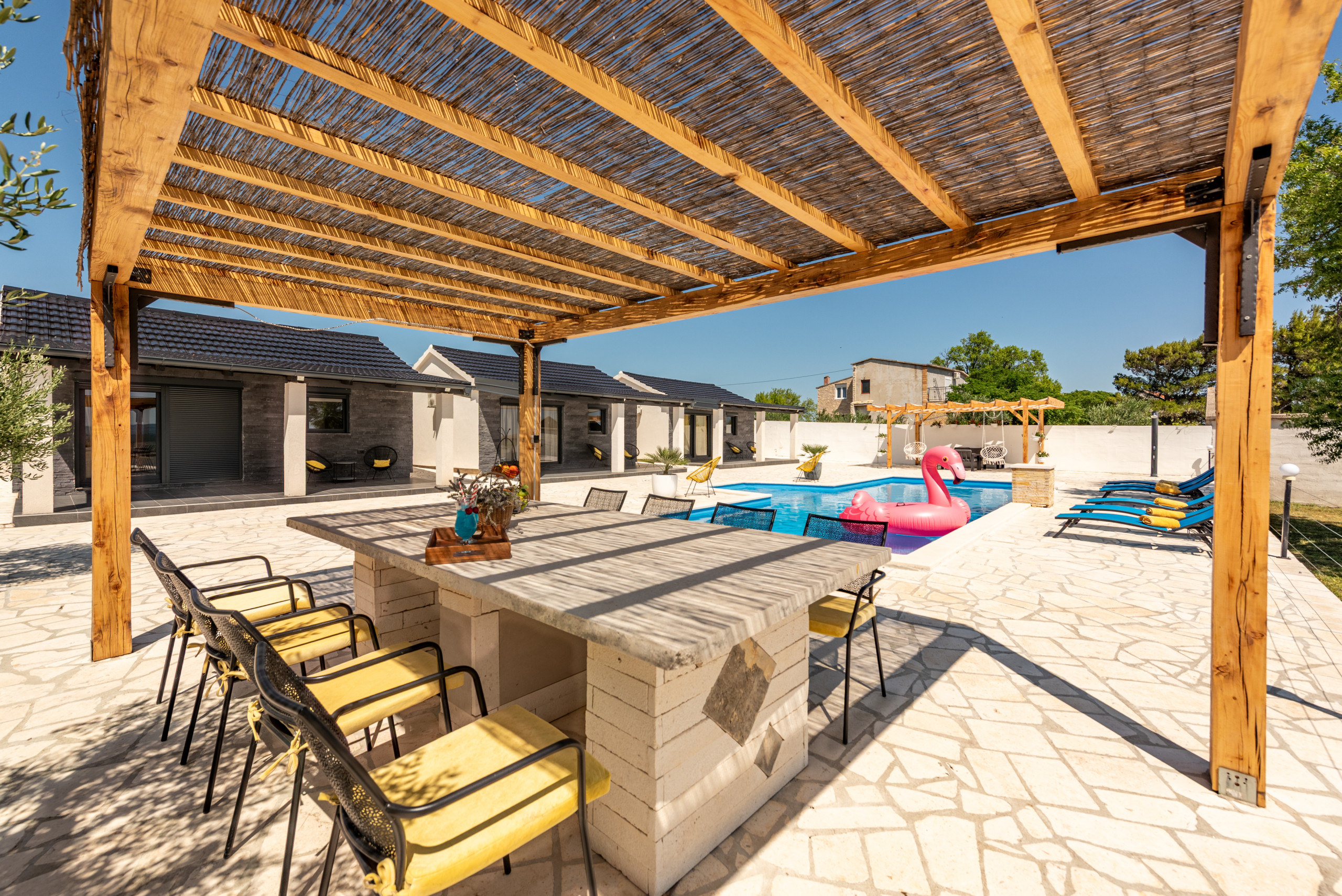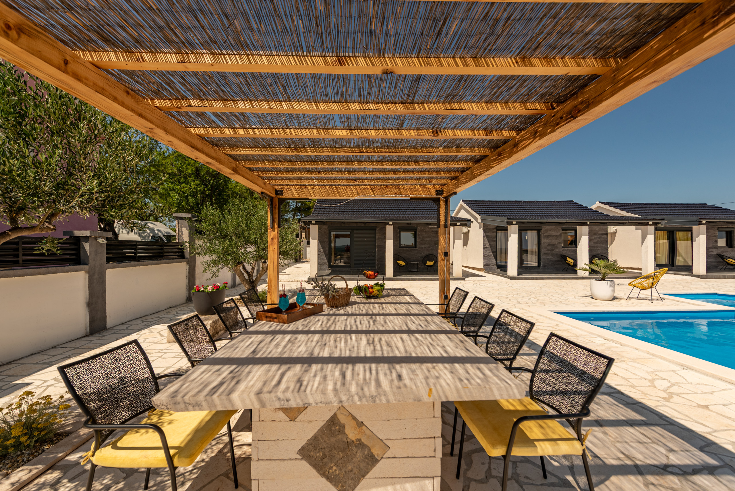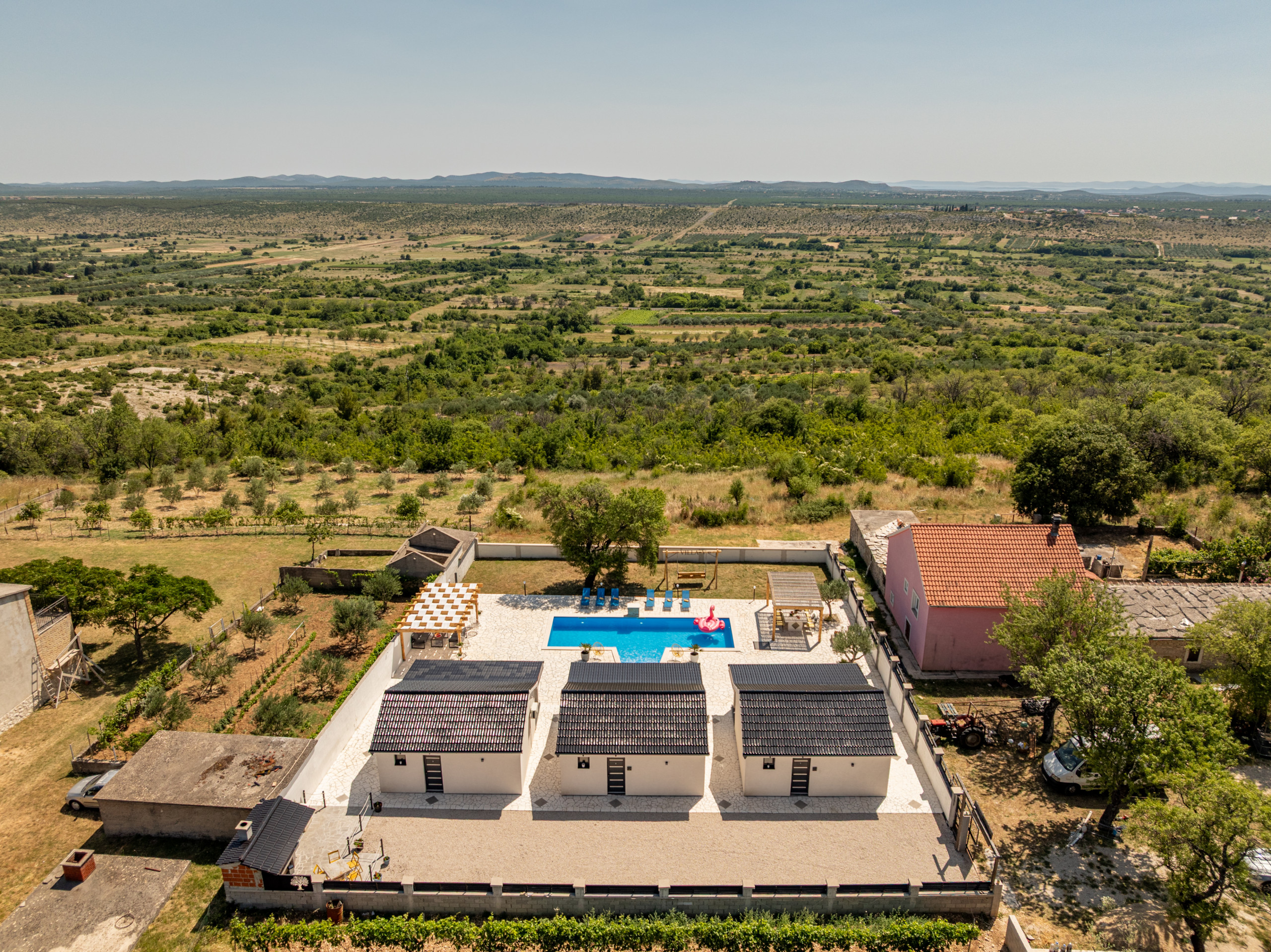 Diese charmante Villa mit 3 Wohneinheiten befindet sich in Buković, einem Teil der Stadt Benkovac, die 36 Kilometer von der historischen Stadt Zadar entfernt ist. Das Anwesen besteht aus drei Einheiten und deren Gemeinschaftsbereich, der schönen Terrasse und dem großen Swimmingpool. Jede der Einheiten in der Unterkunft bietet ein Doppelbett und bei Bedarf ein zusätzliches Einzelbett, was sie zum perfekten Ort für 9 Gäste macht, die eine Portion Privatsphäre in ihrer Unterkunft schätzen. Der perfekte Ort, um sich zu versammeln, ist die Terrasse und der Poolbereich, wo Sie Erfrischungen und Aktivitäten genießen können, alles in der friedlichen Umgebung dieses Anwesens, die einen ruhigen Urlaub, Frieden und Ruhe garantiert. Den Gästen stehen auch Grillmöglichkeiten und ein Kinderspielplatz nur 200 m entfernt zur Verfügung.