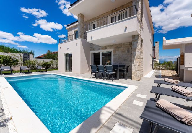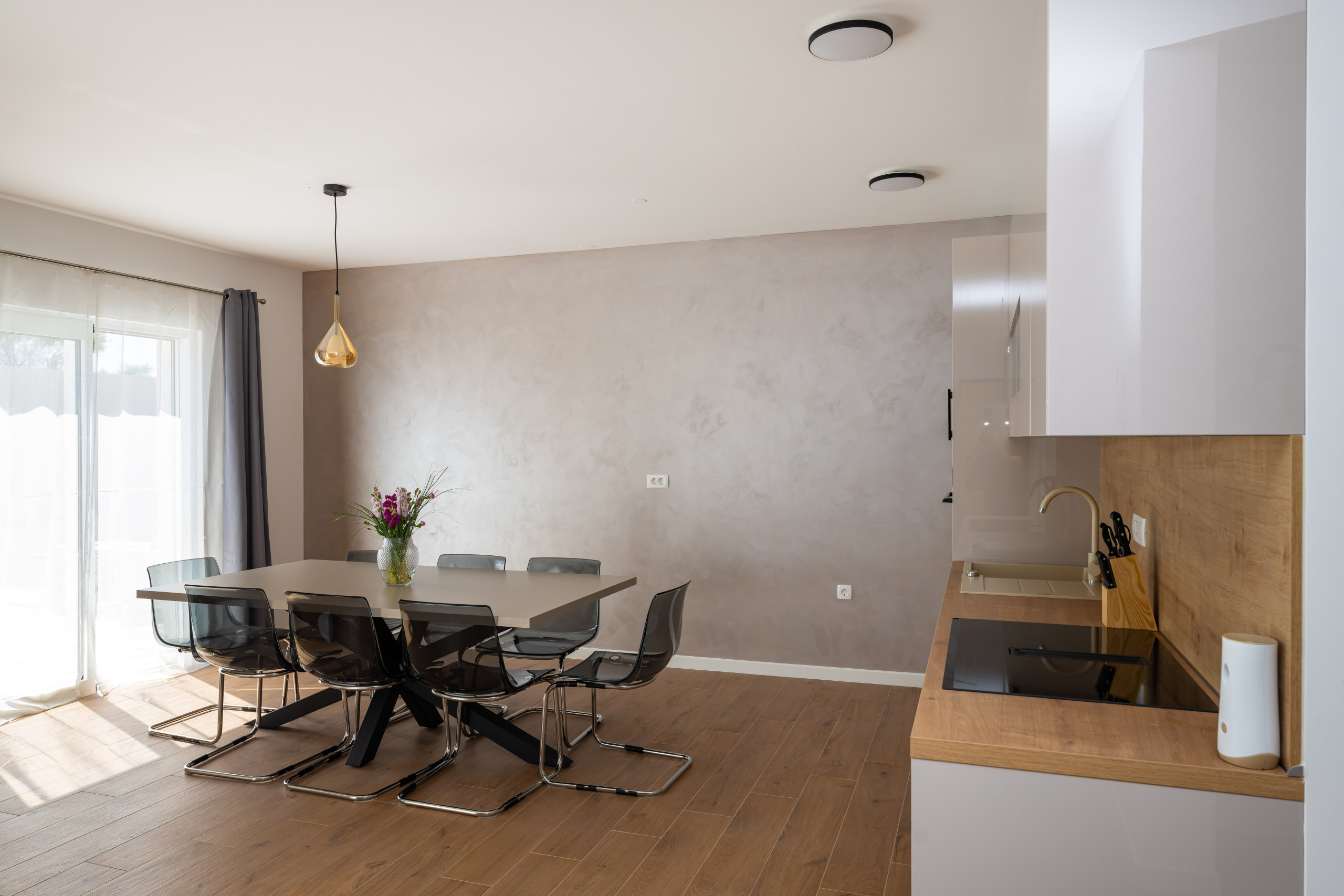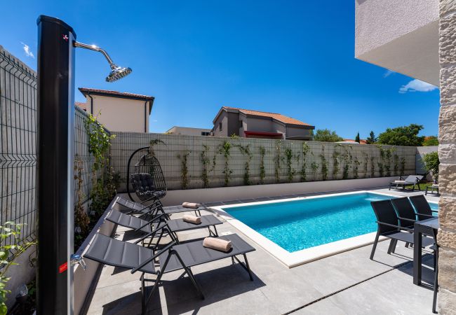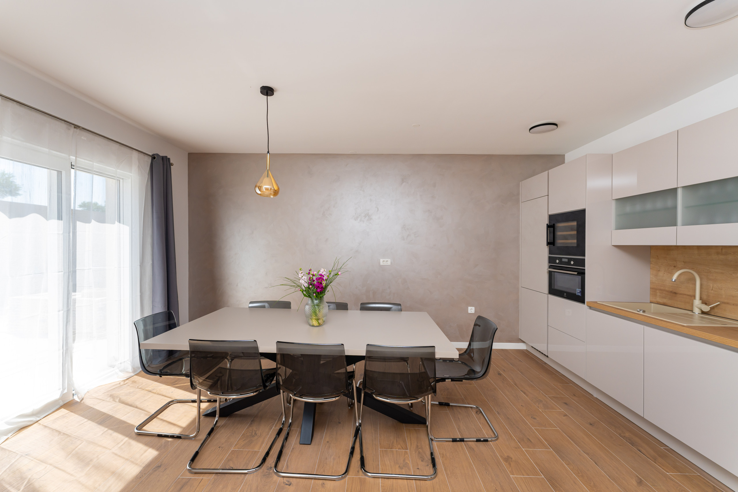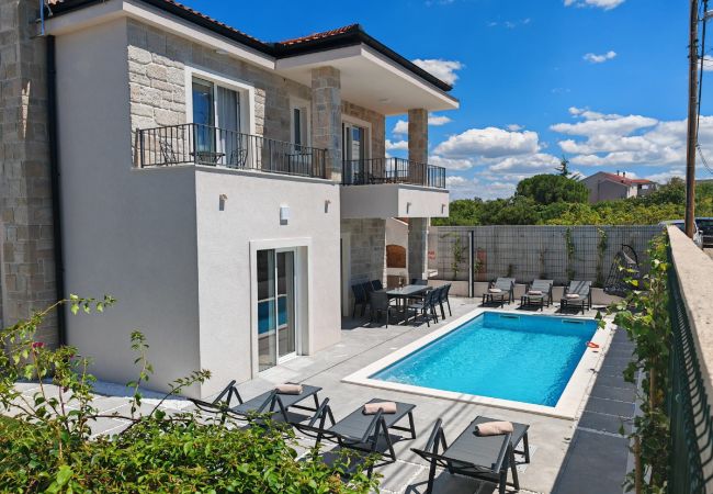 Diese brandneue, moderne Villa befindet sich in der Nähe der historischen Stadt Zadar, in einem kleinen dalmatinischen Dorf namens Crno. Crno liegt am Stadtrand von Zadar (7 km), was Villa Enna zur perfekten Wahl für diejenigen macht, die Ruhe und Stille während ihres Aufenthalts genießen möchten, während sie gleichzeitig das reiche touristische Angebot von Zadar erleben können. Villa Ena ist eine echte brandneue moderne Villa, die Entspannung und Luxusgefühl in jeder Ecke ihres Raumes bietet. Insgesamt kann sie 9 Gäste aufnehmen, was sie zur perfekten Wahl für Familien und Freunde macht. Das Innere der Villa erstreckt sich über 140 m² und verfügt über insgesamt fünf Schlafzimmer, von denen vier Schlafzimmer mit Doppelbetten ausgestattet sind und ein Schlafzimmer mit einem Einzelbett. Es gibt auch zwei Badezimmer mit Dusche, ausgestattet mit Grundtoiletteartikel, Waschmaschine und Trockner. Ein Wohnzimmer mit Sofa und Flachbild-TV, eine voll ausgestattete Küche mit hochwertigen Geräten und Ausgang auf eine Terrasse mit Blick auf die friedliche Umgebung werden alle Ihre Urlaubsbedürfnisse erfüllen. Das Äußere der Villa Enna erstreckt sich über ein 670 m² großes eingezäuntes Grundstück, und der hervorgehobene Teil des Außenbereichs ist ein schöner beheizter Swimmingpool und ein kleines Haus neben dem Pool, das einen Indoor-Grill mit Essbereich hat.