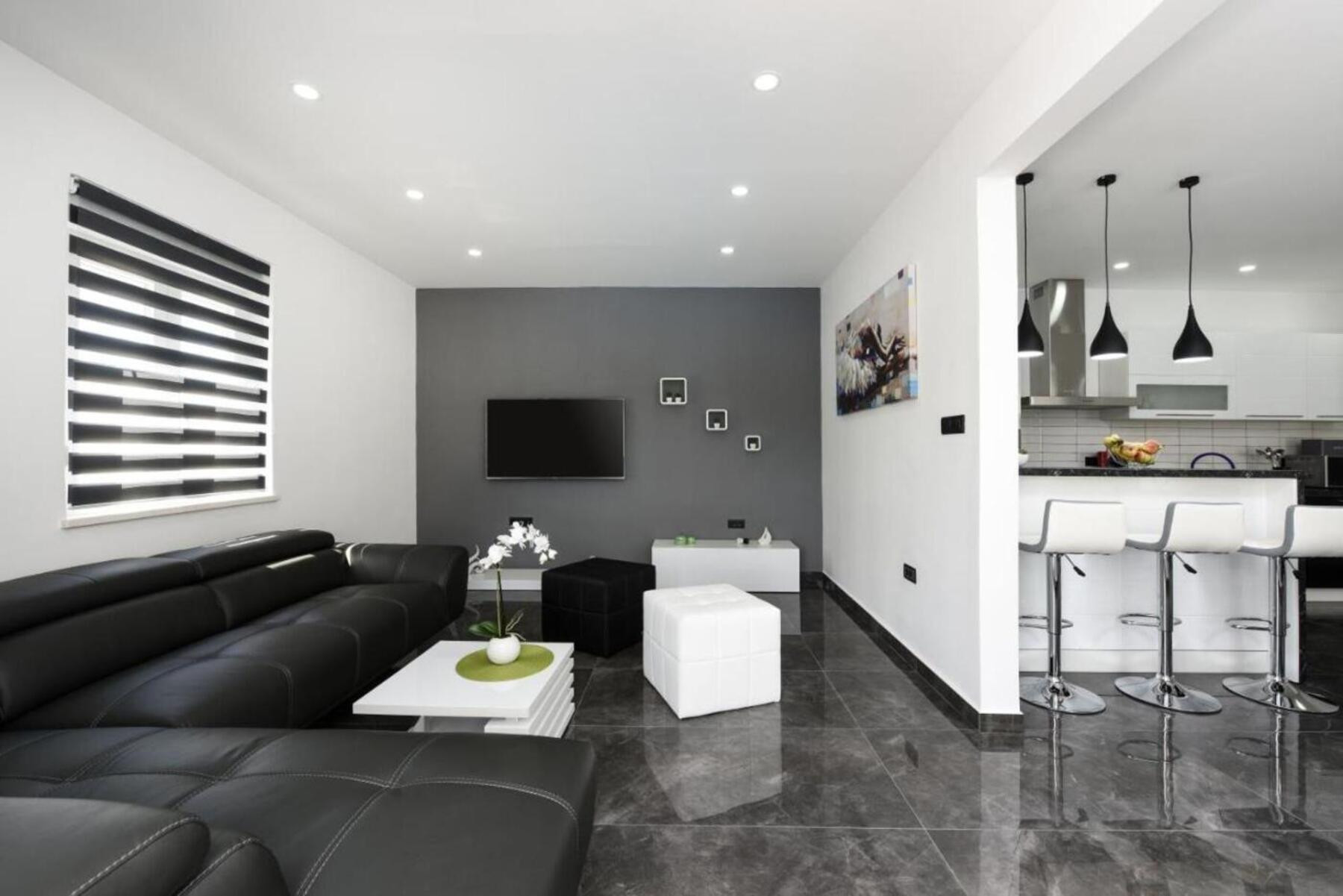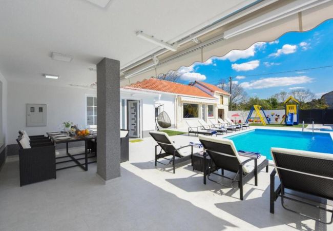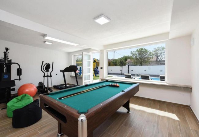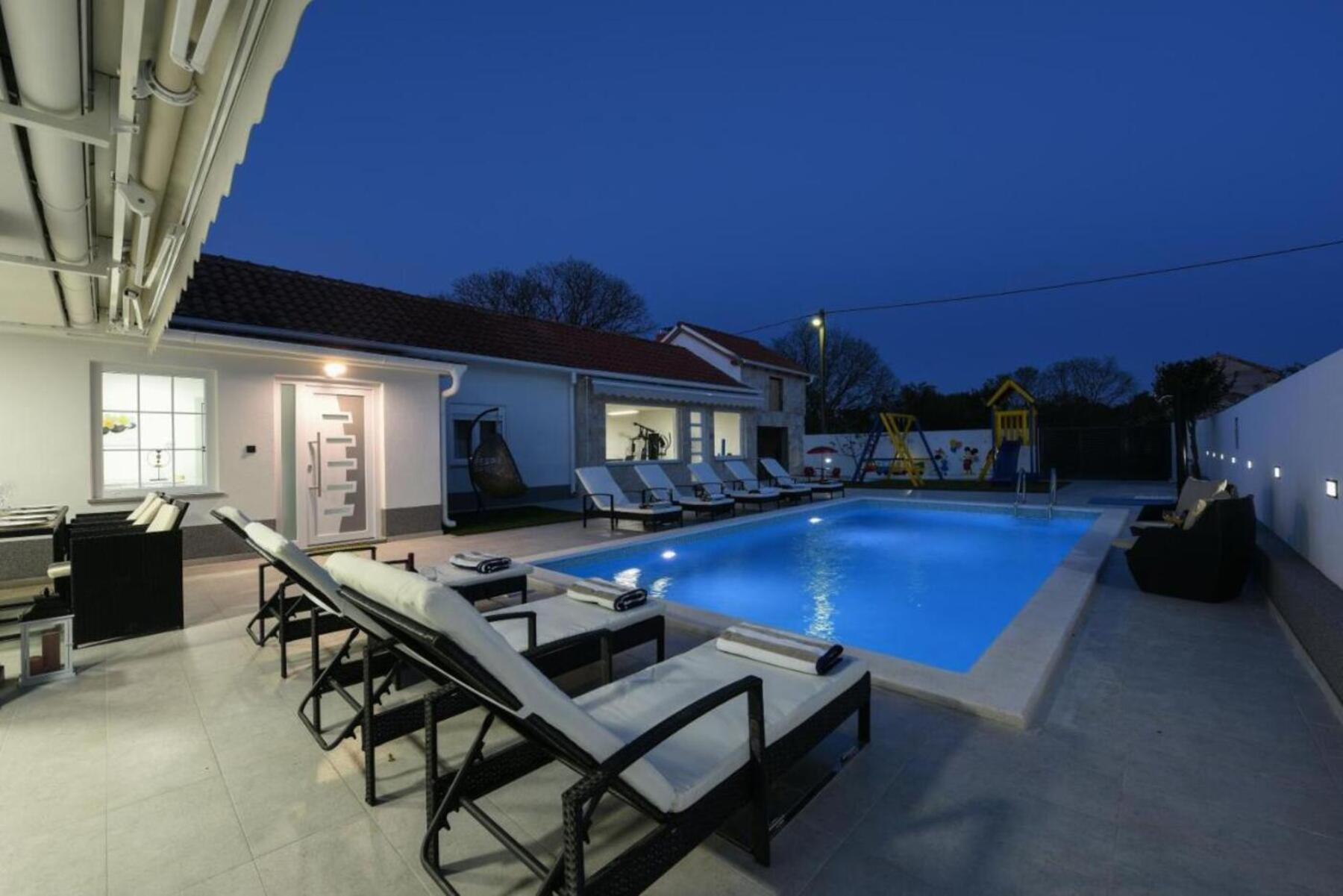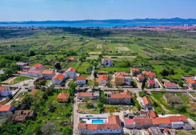 Diese brandneue, moderne Villa befindet sich in der Nähe der historischen Stadt Zadar, in einem kleinen dalmatinischen Dorf namens Crno. Crno liegt am Stadtrand von Zadar (7 km), was Villa Enna zur perfekten Wahl für diejenigen macht, die Ruhe und Stille während ihres Aufenthalts genießen möchten, während sie gleichzeitig das reiche touristische Angebot von Zadar erleben können. Villa Ena ist eine echte brandneue moderne Villa, die Entspannung und Luxusgefühl in jeder Ecke ihres Raumes bietet. Insgesamt kann sie 9 Gäste aufnehmen, was sie zur perfekten Wahl für Familien und Freunde macht. Das Innere der Villa erstreckt sich über 140 m² und verfügt über insgesamt fünf Schlafzimmer, von denen vier Schlafzimmer mit Doppelbetten ausgestattet sind und ein Schlafzimmer mit einem Einzelbett. Es gibt auch zwei Badezimmer mit Dusche, ausgestattet mit Grundtoiletteartikel, Waschmaschine und Trockner. Ein Wohnzimmer mit Sofa und Flachbild-TV, eine voll ausgestattete Küche mit hochwertigen Geräten und Ausgang auf eine Terrasse mit Blick auf die friedliche Umgebung werden alle Ihre Urlaubsbedürfnisse erfüllen. Das Äußere der Villa Enna erstreckt sich über ein 670 m² großes eingezäuntes Grundstück, und der hervorgehobene Teil des Außenbereichs ist ein schöner beheizter Swimmingpool und ein kleines Haus neben dem Pool, das einen Indoor-Grill mit Essbereich hat.