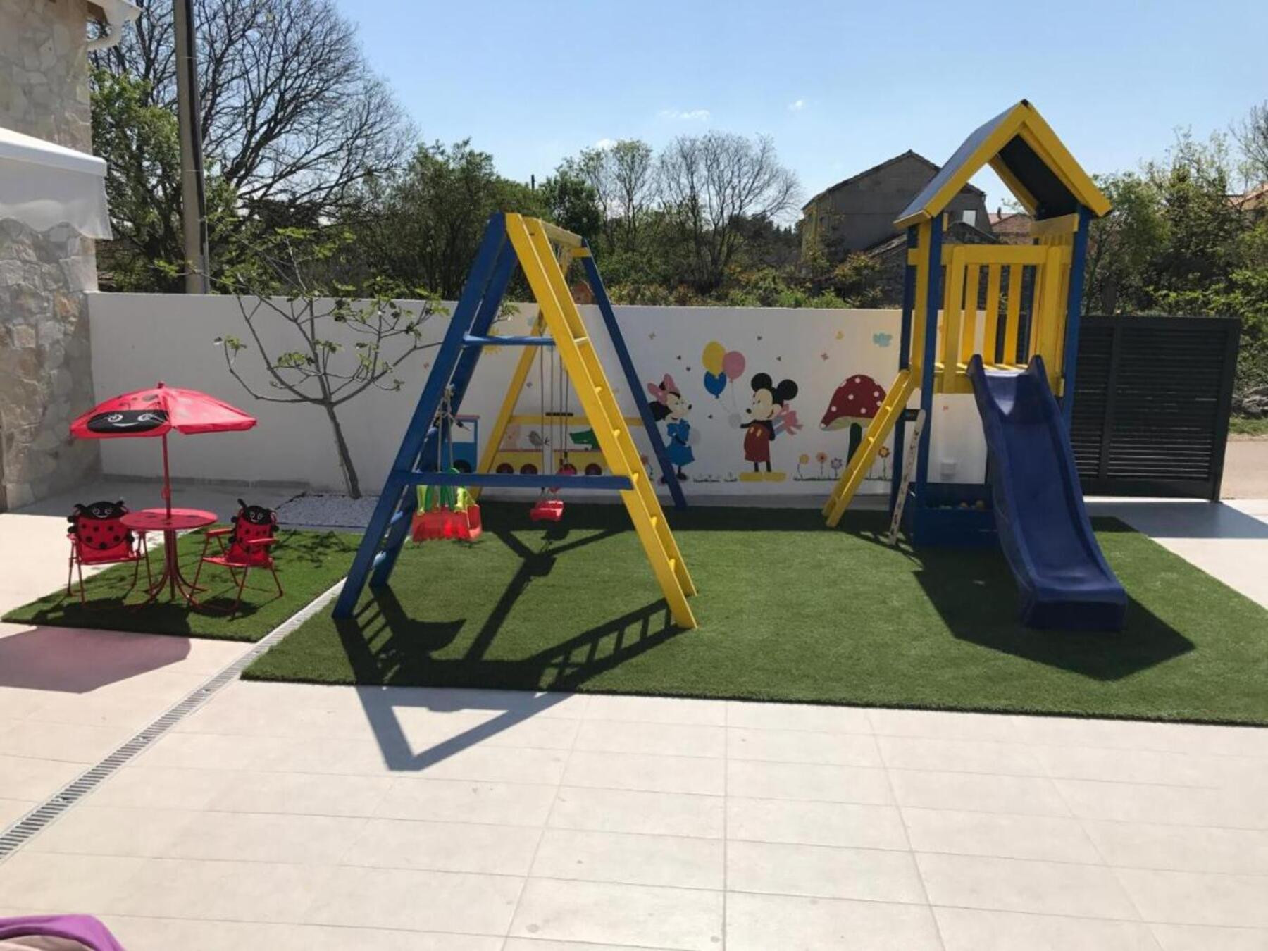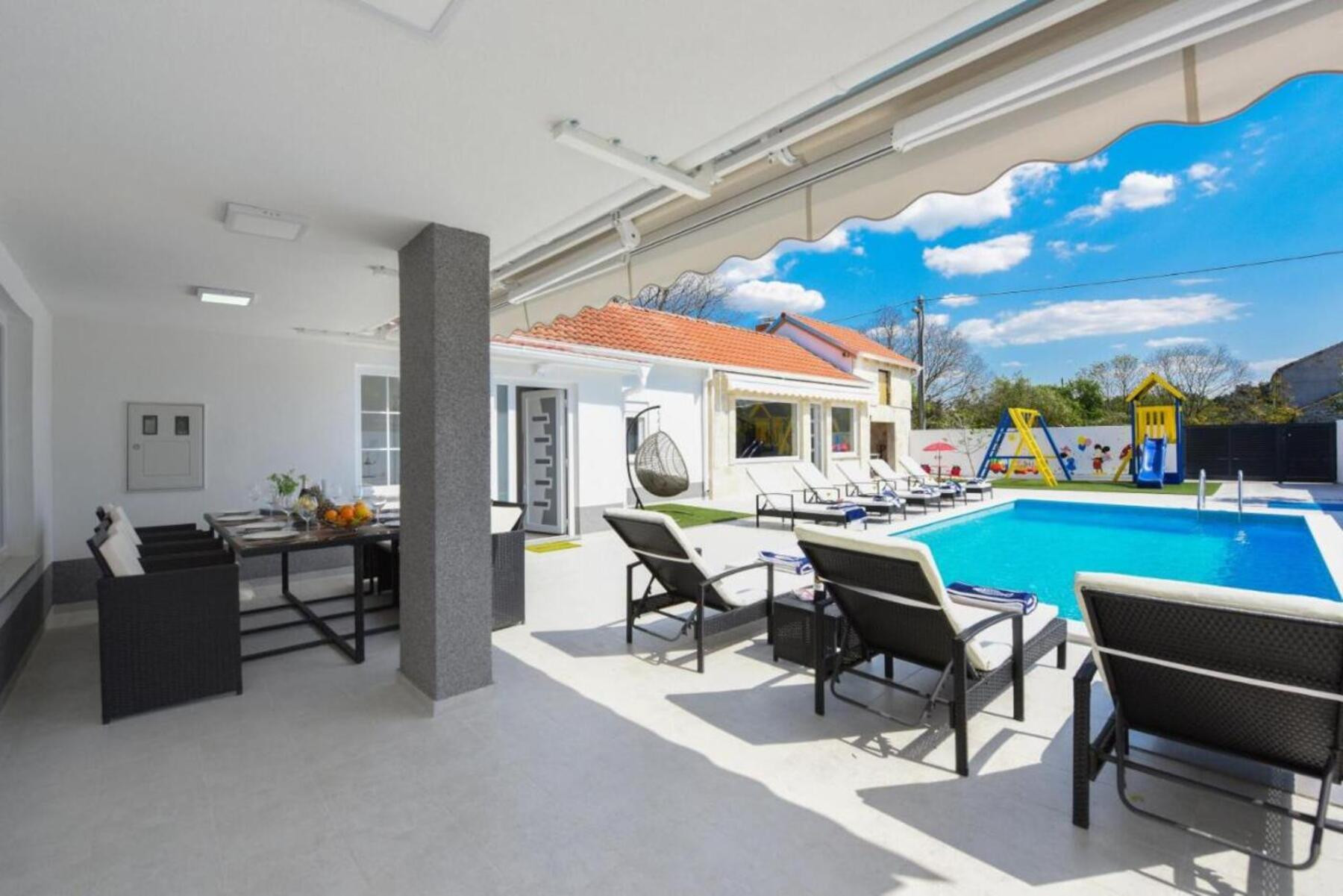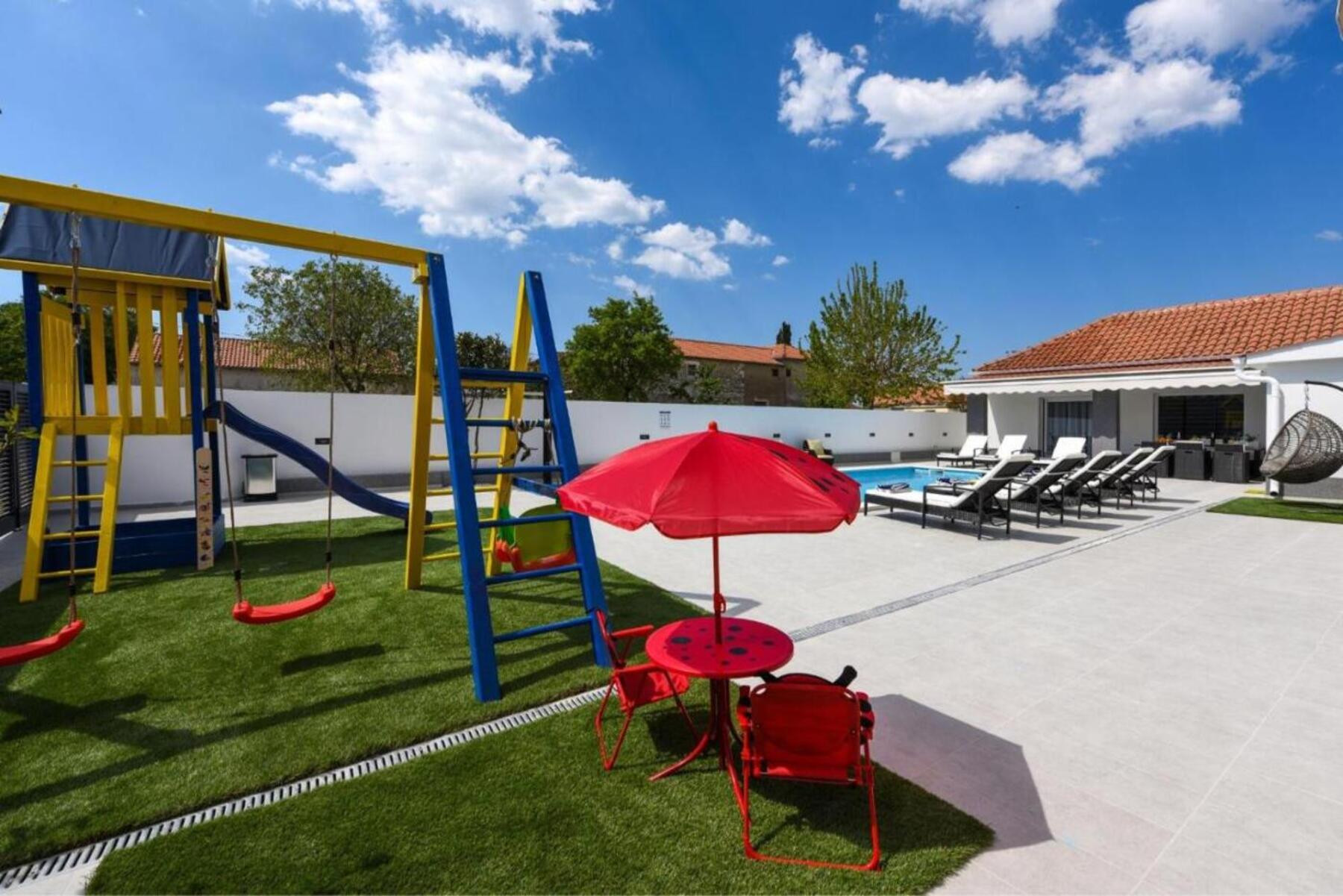 Im Außenbereich befindet sich ein beheizter Pool, der auch außerhalb der Hochsaison zum Schwimmen einlädt, und für Kinder gibt es einen Spielplatz mit Rutsche und Schaukel. Für Feinschmecker steht eine Außenküche mit integriertem Grill zur Verfügung – ideal, um dalmatinische Spezialitäten mit Familie und Freunden zuzubereiten. Haustiere sind auf Anfrage und gegen Aufpreis willkommen.