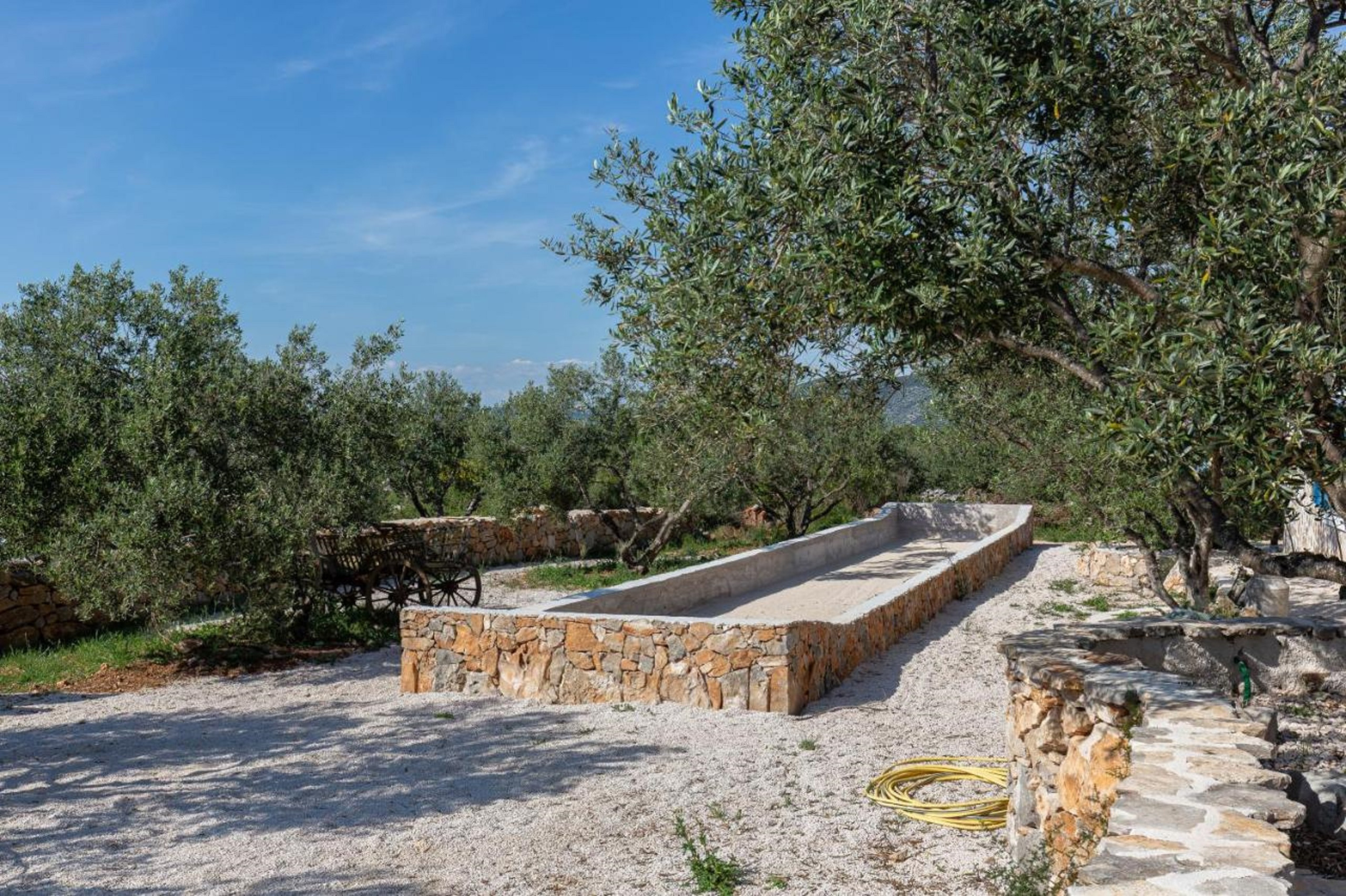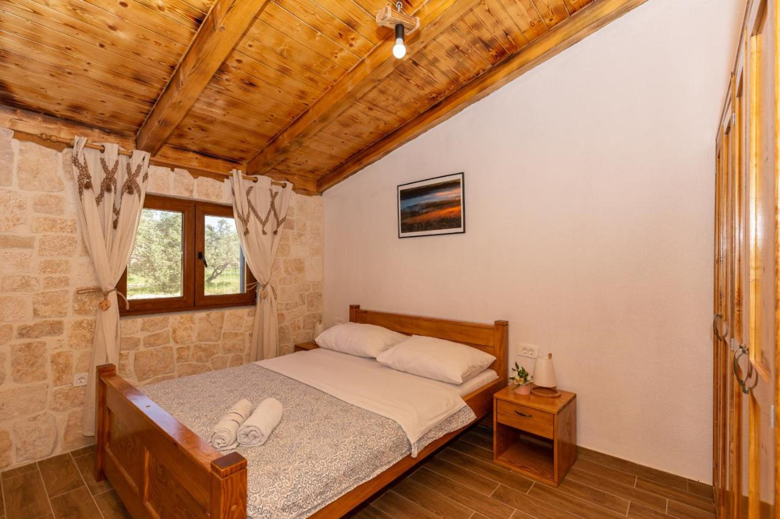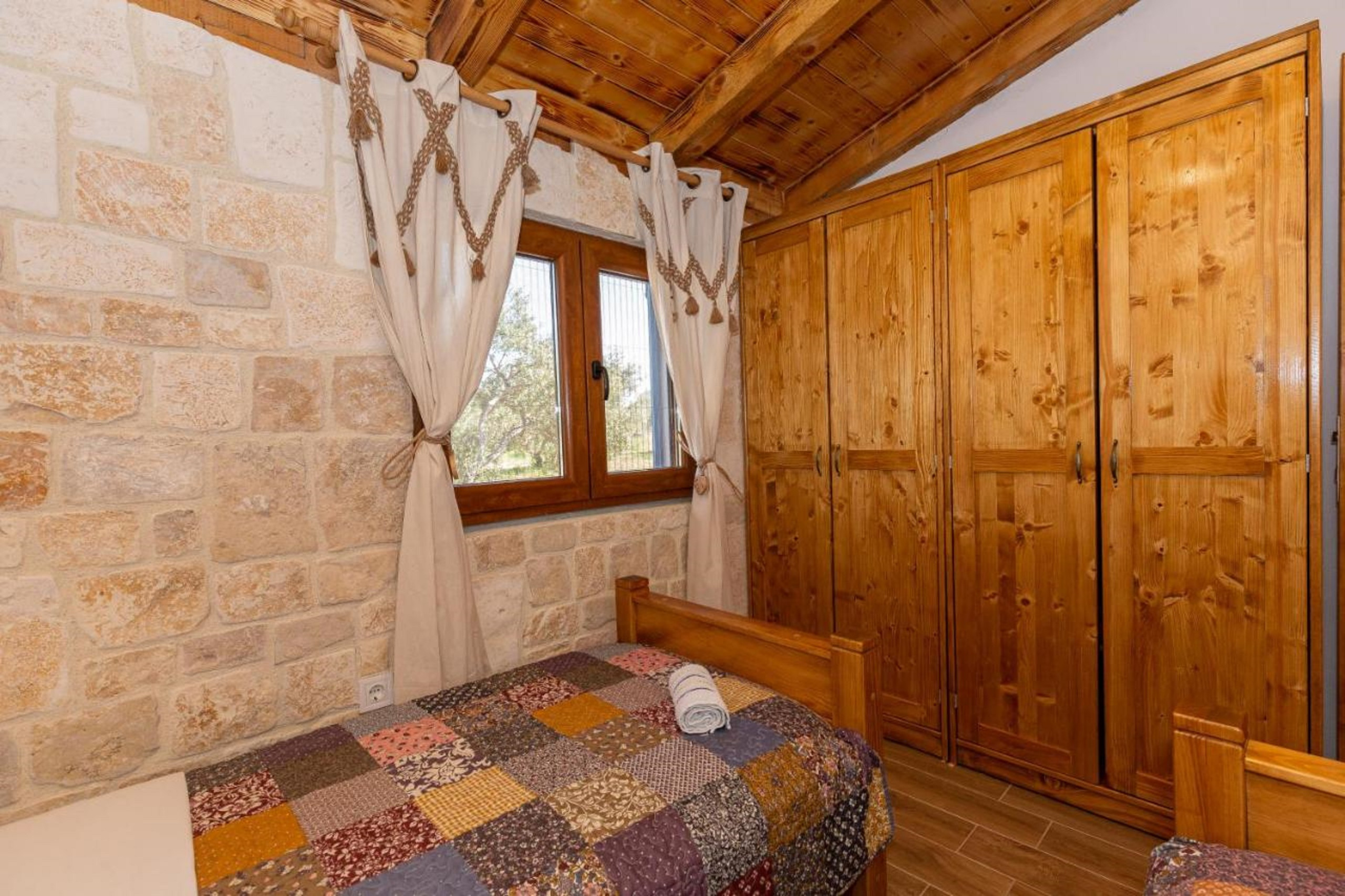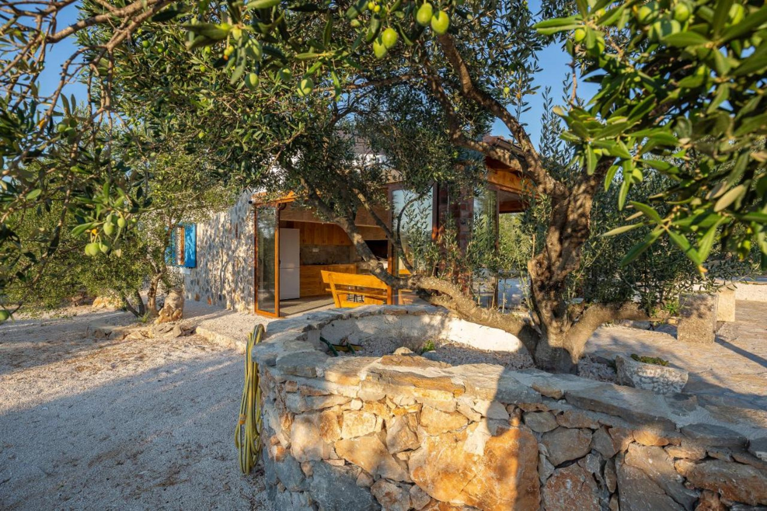 Diese renovierte charmante Steinvilla ist ein einstöckiges Haus mitten in einer Olivenplantage und enthält einen Wohnraum, Esszimmer und Küche sowie zwei Schlafzimmer. Ein Schlafzimmer verfügt über ein Doppelbett, das andere über zwei Einzelbetten. Gäste haben ein Badezimmer mit Dusche zur Verfügung. Die Küche und das Esszimmer befinden sich in einem verglasten Teil des Hauses, der es Ihnen ermöglicht, die Umgebung auch von innen zu erleben. Die Wohn- und Schlafräume sind so gestaltet, dass sie das Erbe des Hauses ehren, gefüllt mit rustikalen Stein- und Holzelementen, die eine warme Atmosphäre schaffen.