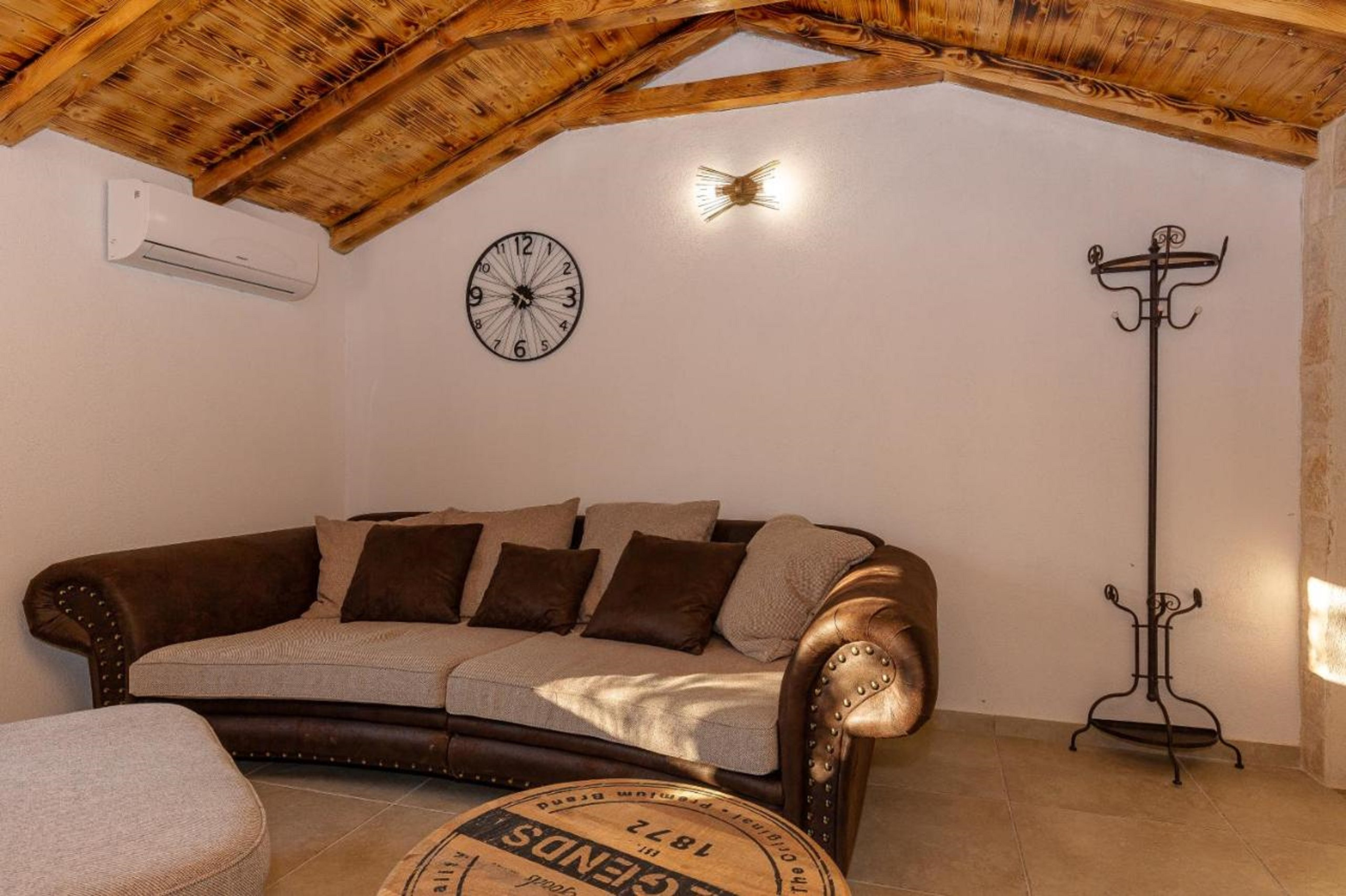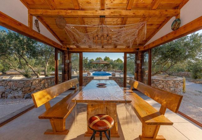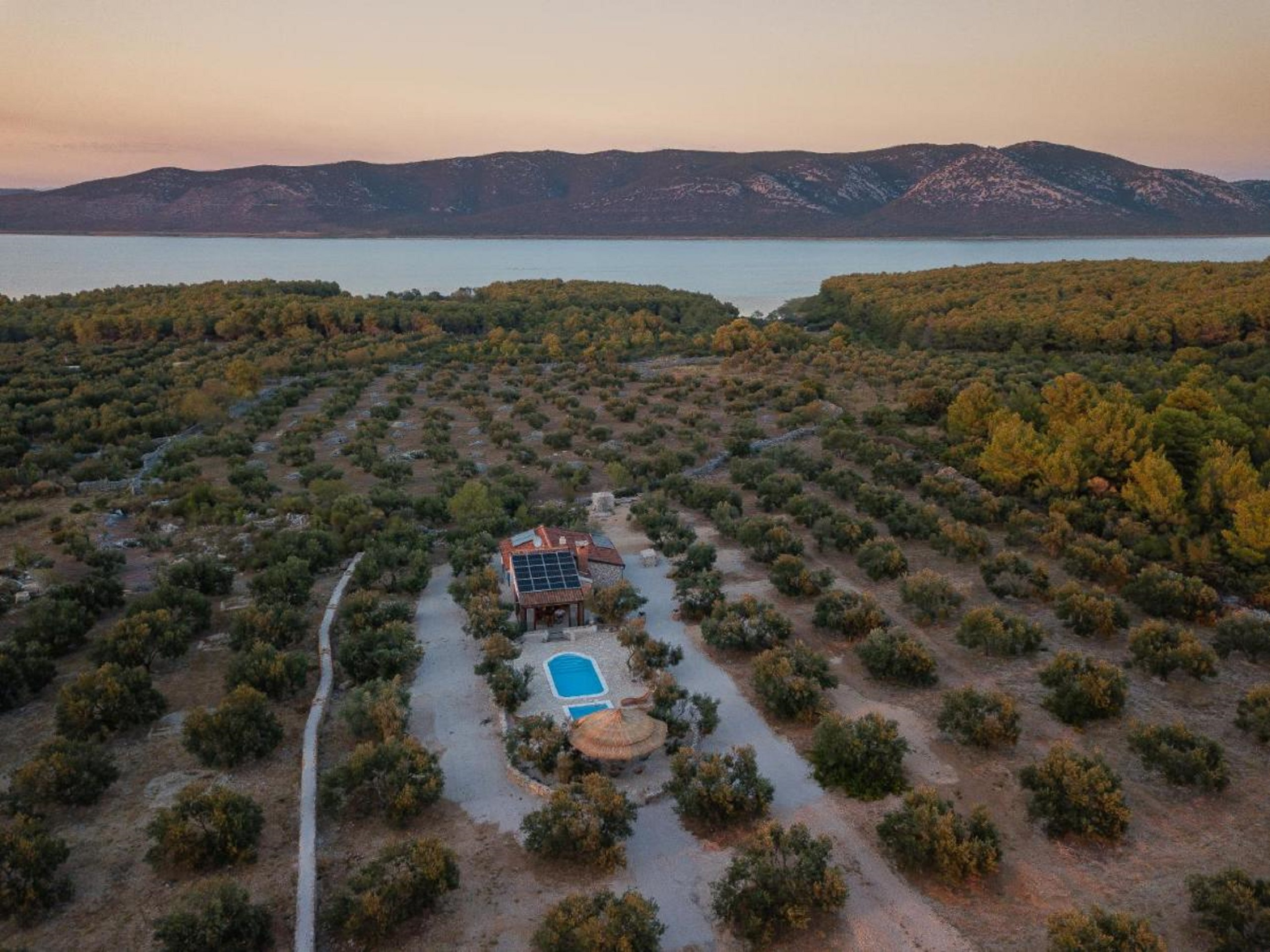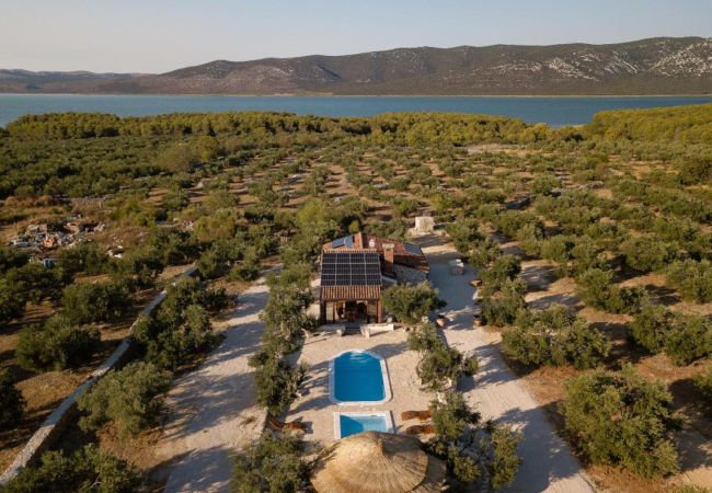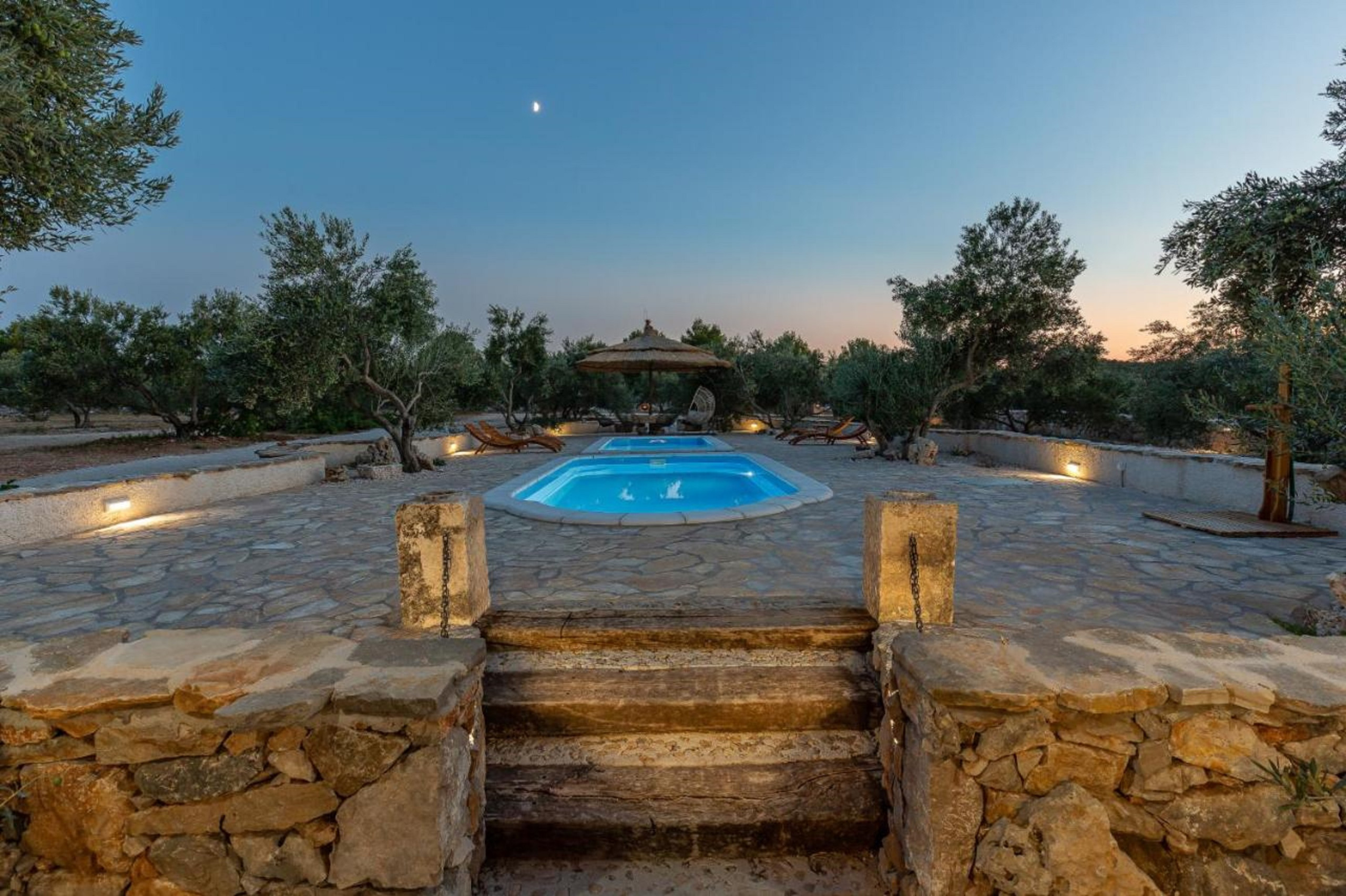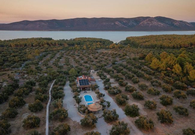Diese renovierte charmante Steinvilla ist ein einstöckiges Haus mitten in einer Olivenplantage und enthält einen Wohnraum, Esszimmer und Küche sowie zwei Schlafzimmer. Ein Schlafzimmer verfügt über ein Doppelbett, das andere über zwei Einzelbetten. Gäste haben ein Badezimmer mit Dusche zur Verfügung. Die Küche und das Esszimmer befinden sich in einem verglasten Teil des Hauses, der es Ihnen ermöglicht, die Umgebung auch von innen zu erleben. Die Wohn- und Schlafräume sind so gestaltet, dass sie das Erbe des Hauses ehren, gefüllt mit rustikalen Stein- und Holzelementen, die eine warme Atmosphäre schaffen.