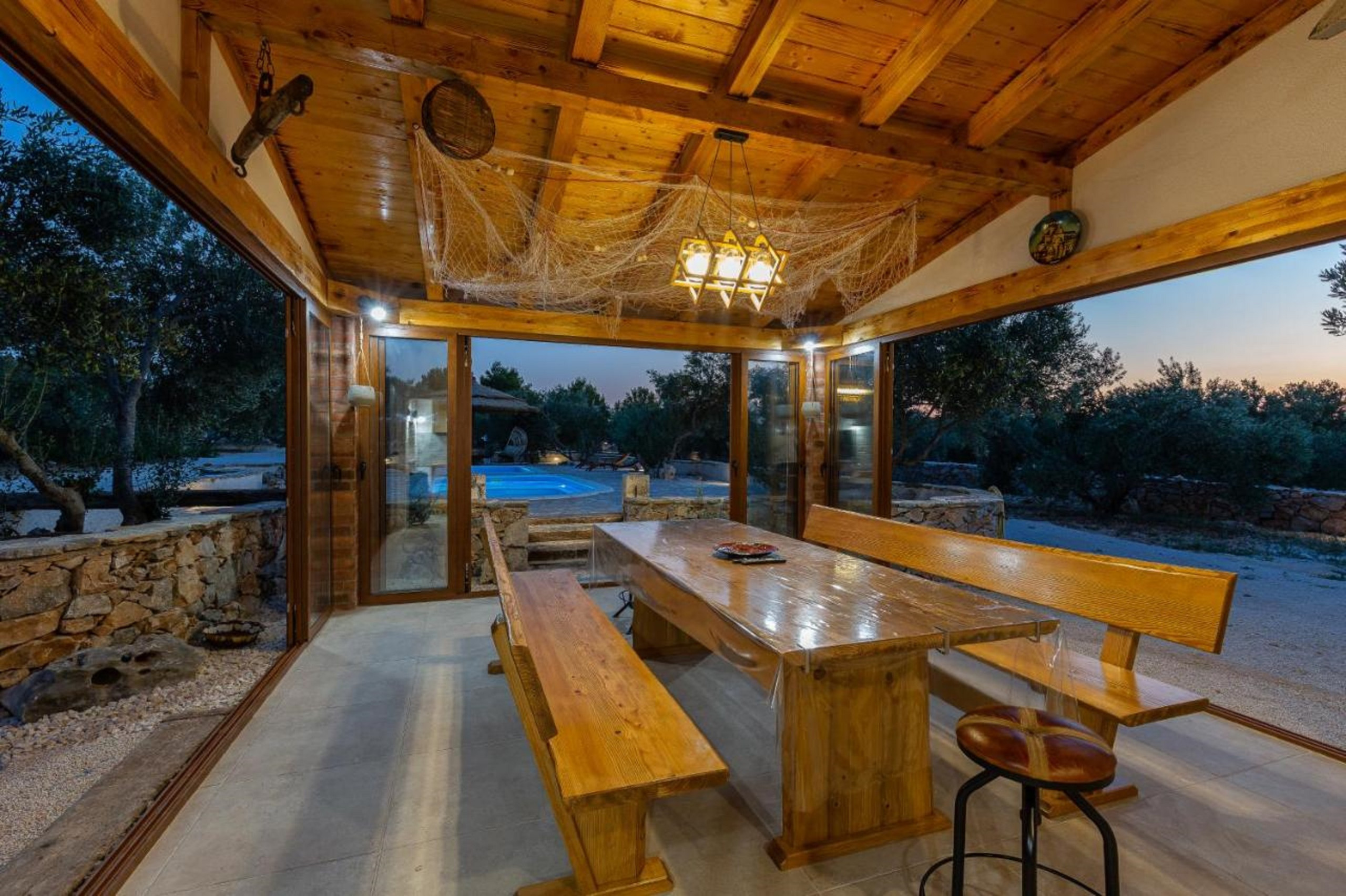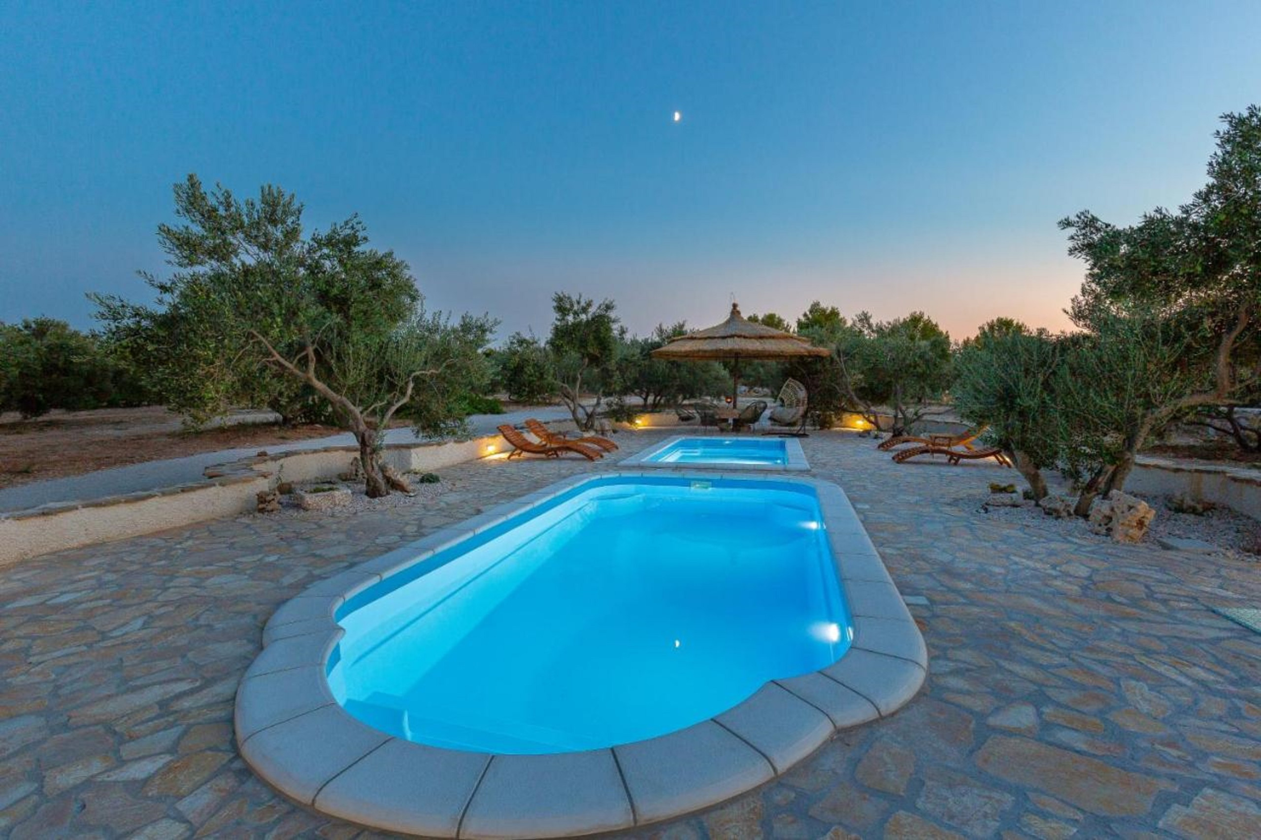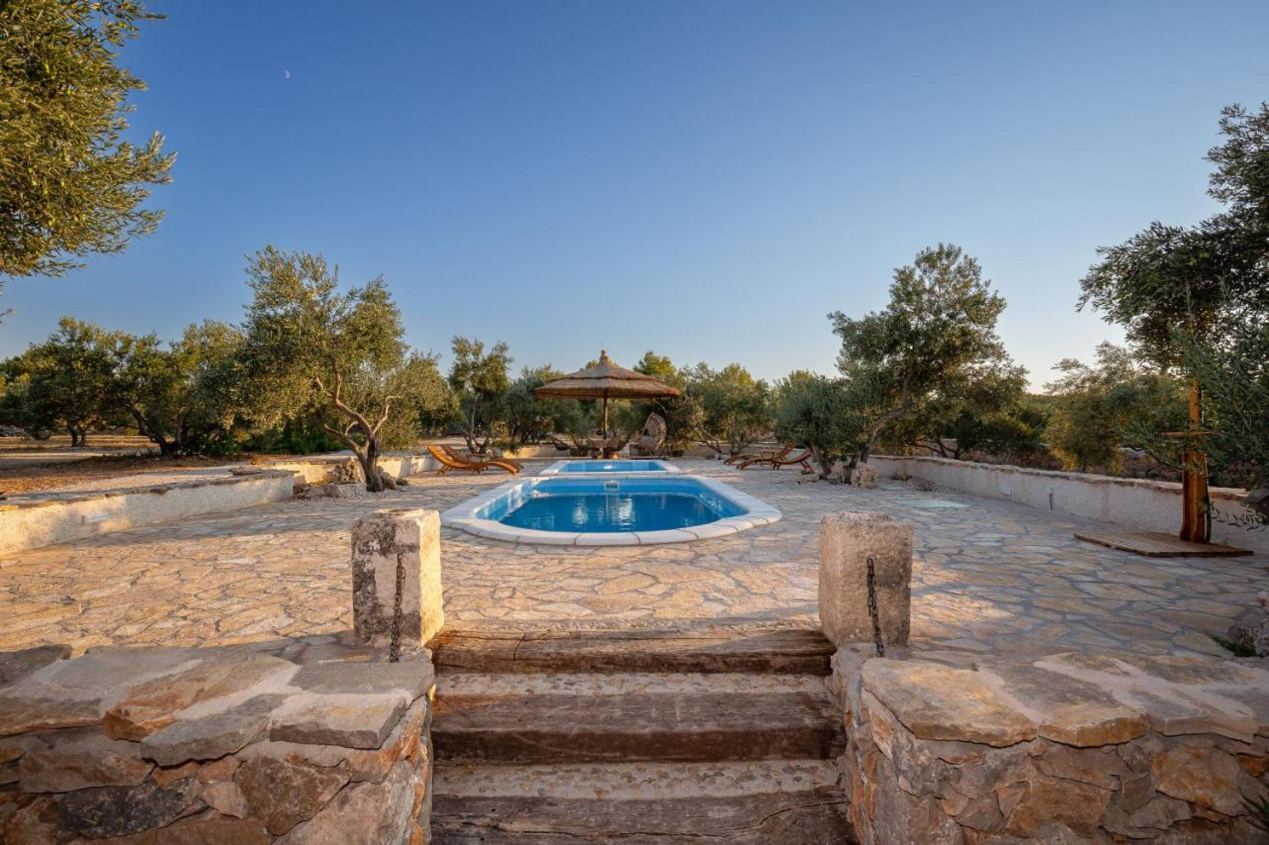 Der Poolbereich ist absolut atemberaubend! Es gibt zwei Pools, einer davon ist ein Kinderpool mit einer Tiefe von 70 cm. In der Nähe des Pools befindet sich auch ein überdachter Sitzbereich im Freien.