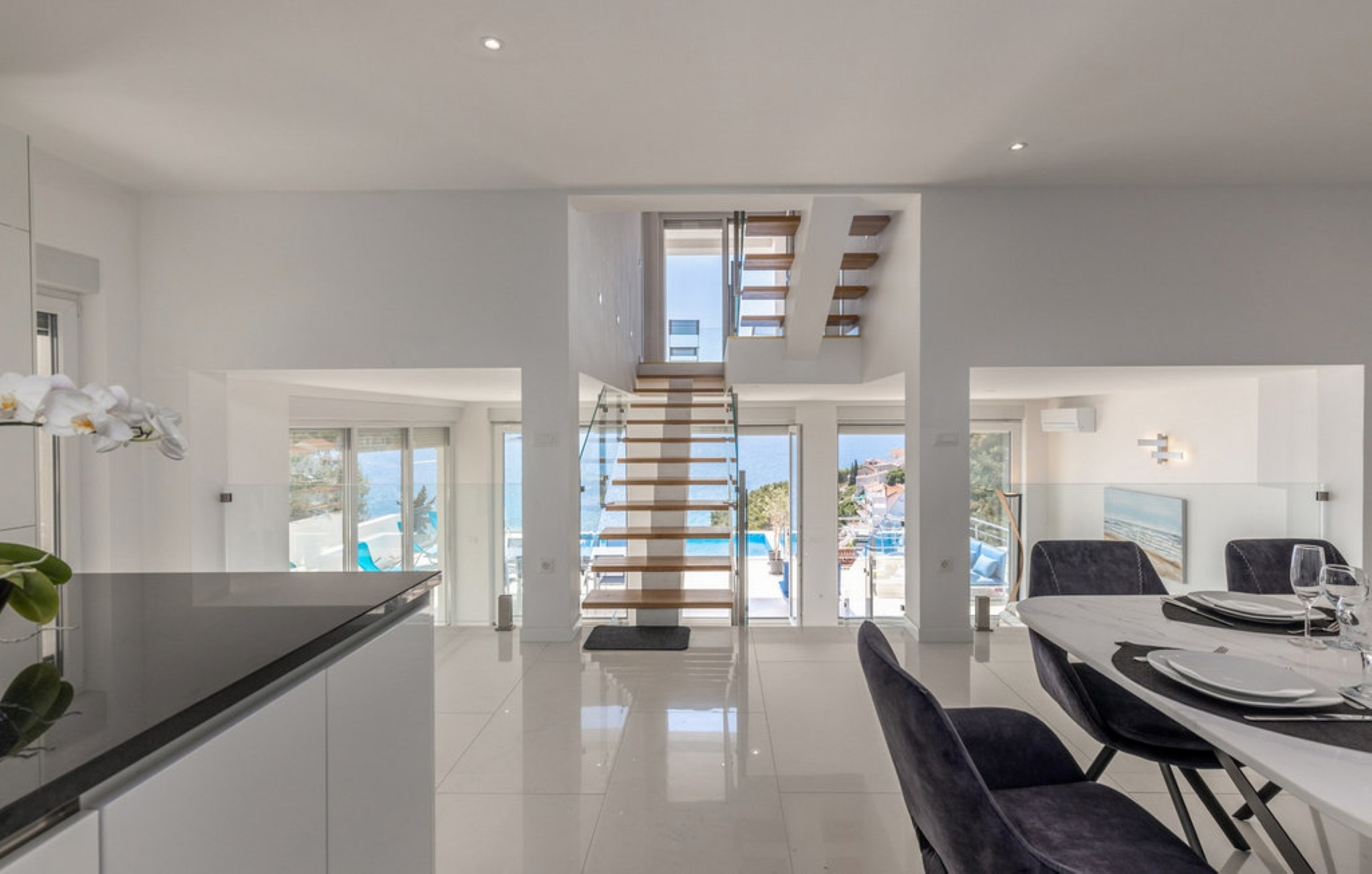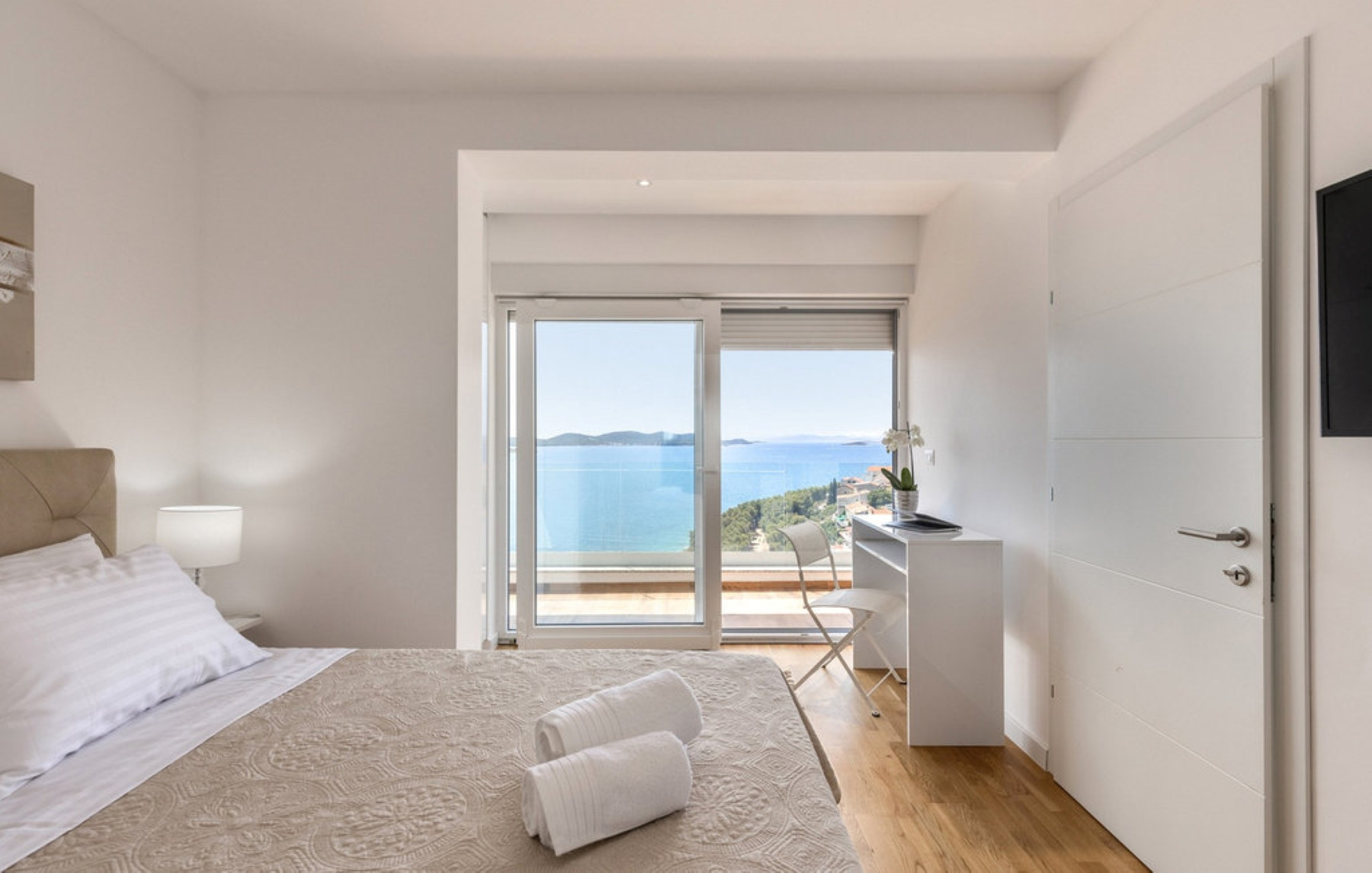 Im Obergeschoss befinden sich vier Schlafzimmer mit Doppelbetten, jedes mit eigenem Badezimmer und einem wunderschönen Blick aufs Meer.