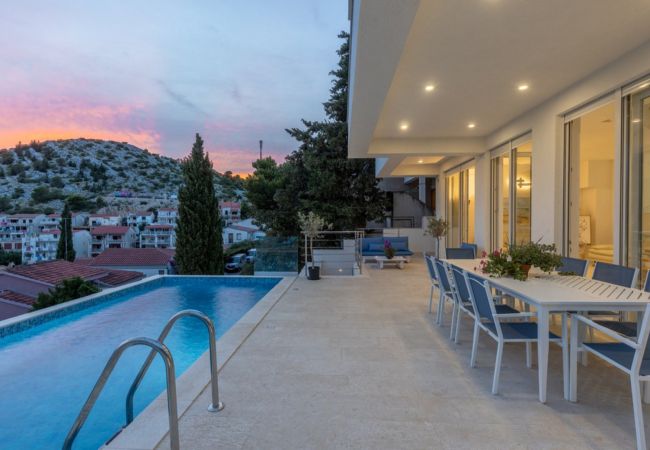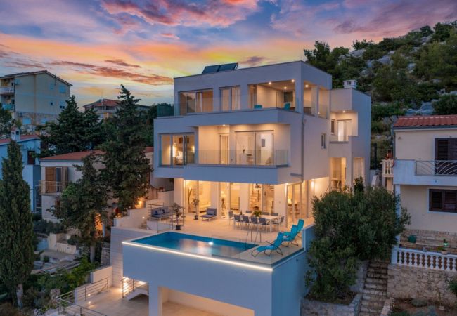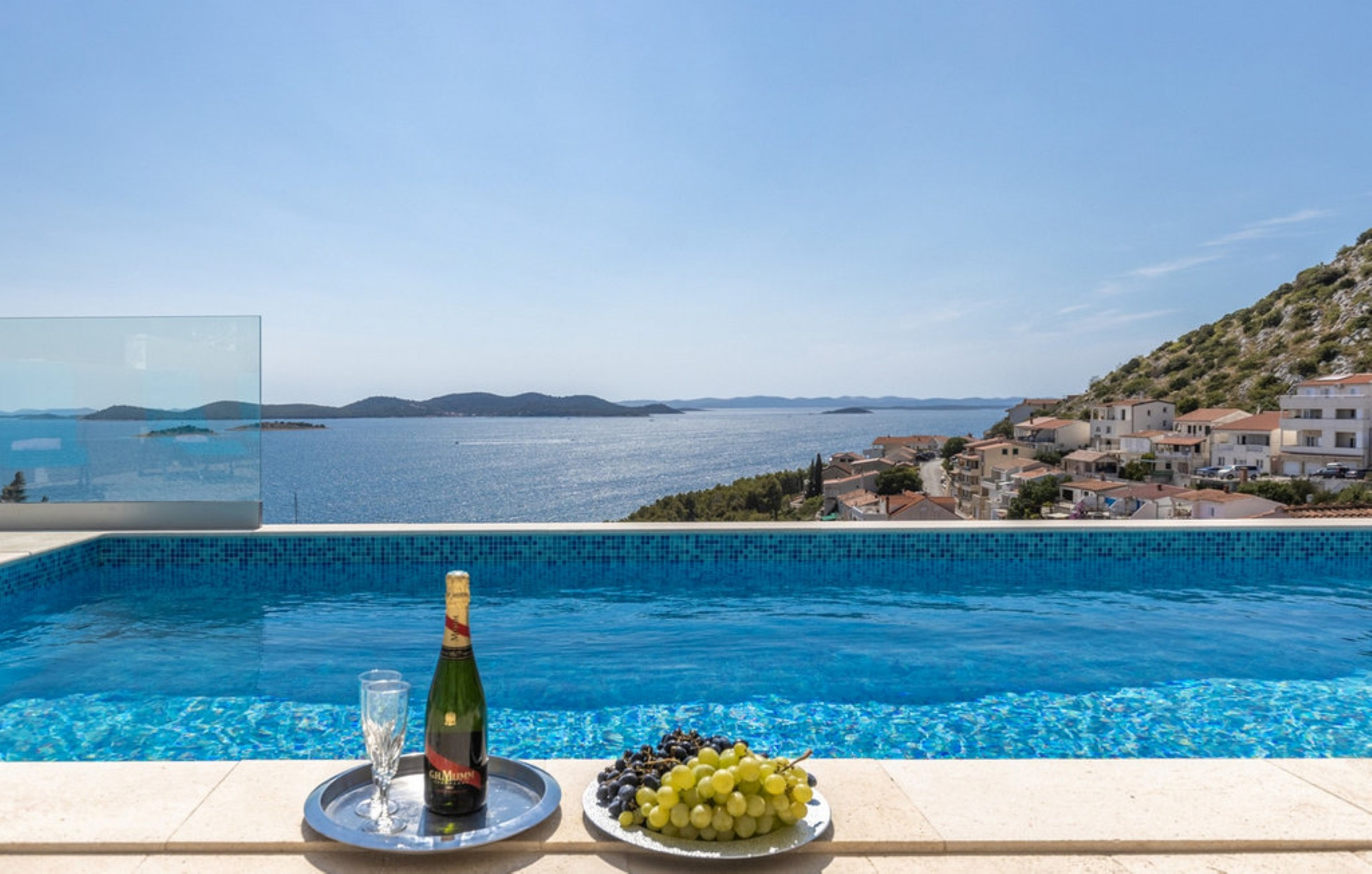 Die Außenseite der Villa bietet eine Terrasse mit einem Pool von 18 m², umgeben von Liegestühlen zum Sonnenbaden. Der Holzkohle- oder Holzgrill im Freien ermöglicht die Zubereitung dalmatinischer Spezialitäten, und der Outdoor-Tisch für zehn Personen ist perfekt für Mahlzeiten im Freien mit einem bezaubernden Blick auf die Natur und das Meer.
