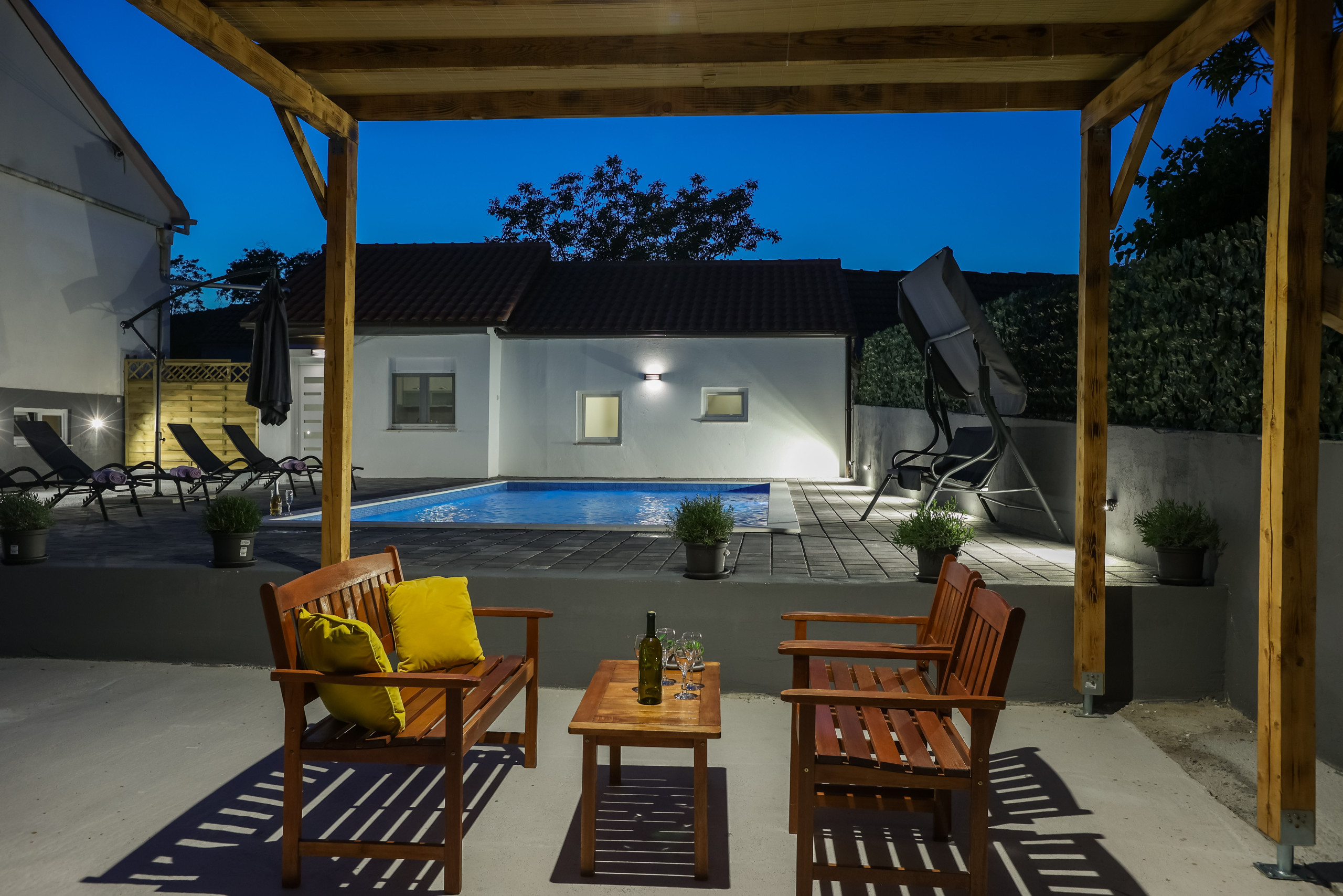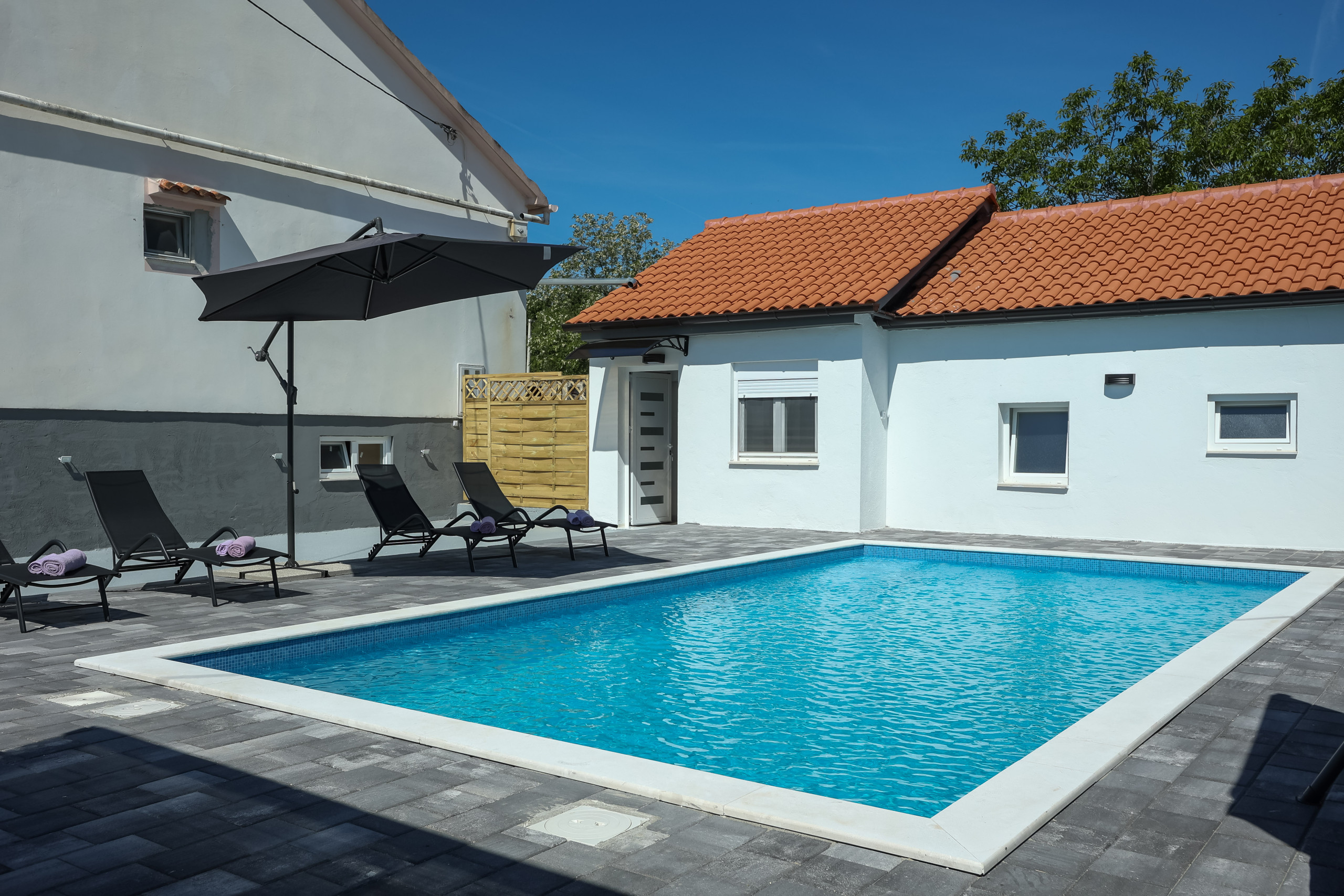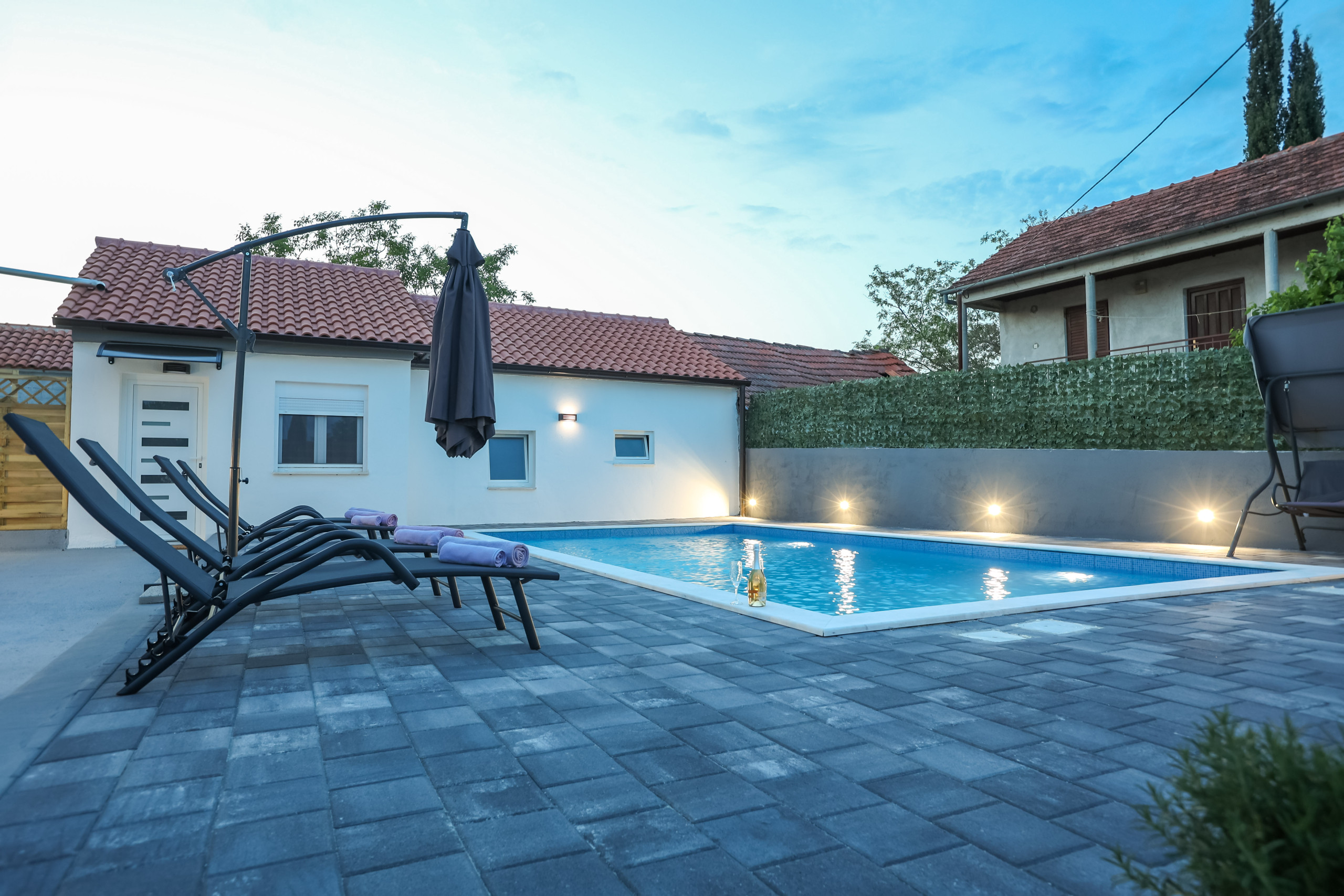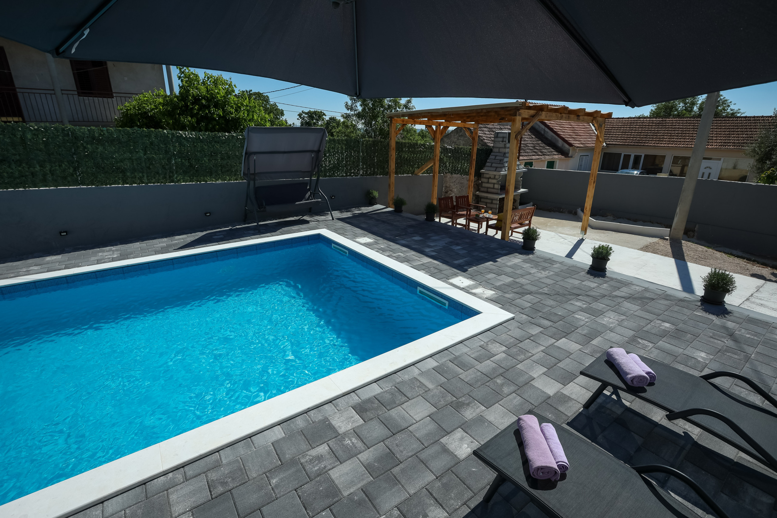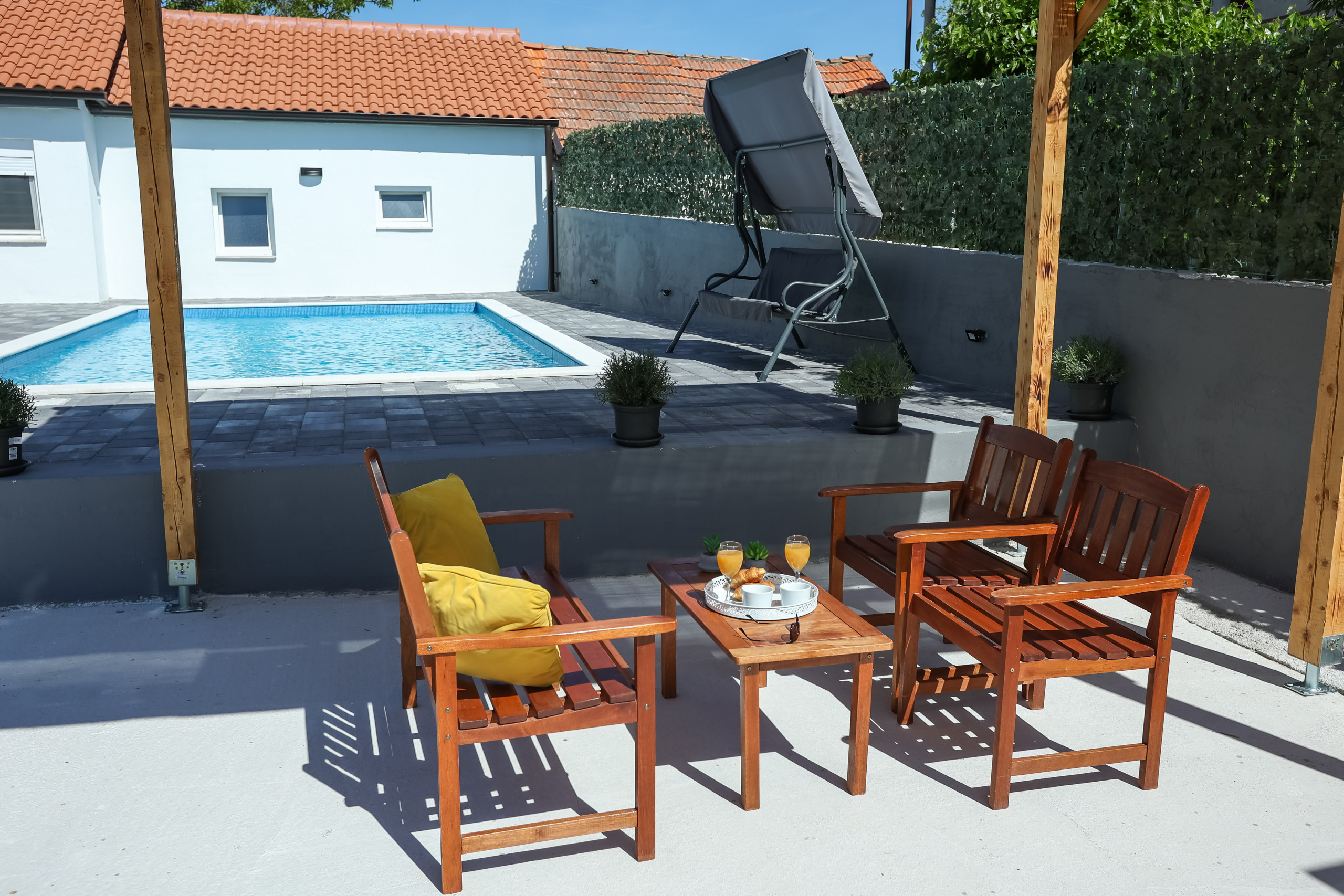 Der besondere Charme der Villa Mia liegt im Außenbereich. Im großzügigen Garten befindet sich ein privater Swimmingpool mit Sonnenliegen und Sonnenschirmen – ideal zur Erfrischung an warmen Sommertagen. Die überdachte Terrasse bietet angenehmen Schatten für den Morgenkaffee oder entspannte Abende, während der Außengrill die Zubereitung köstlicher Speisen im Freien ermöglicht. Für zusätzlichen Spaß stehen eine Tischtennisplatte und eine Schaukel zur Verfügung, die sowohl Kinder als auch Erwachsene begeistern.