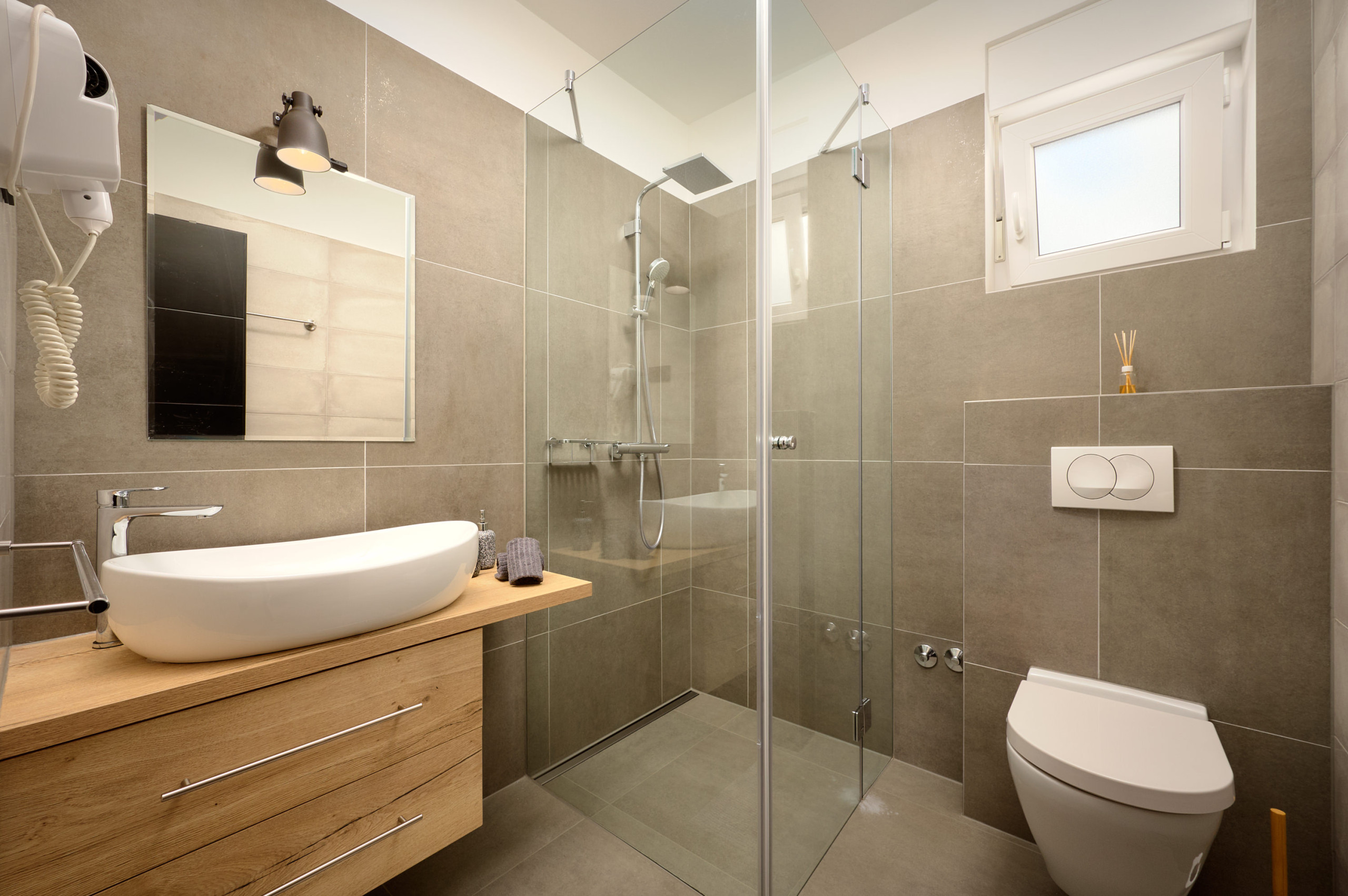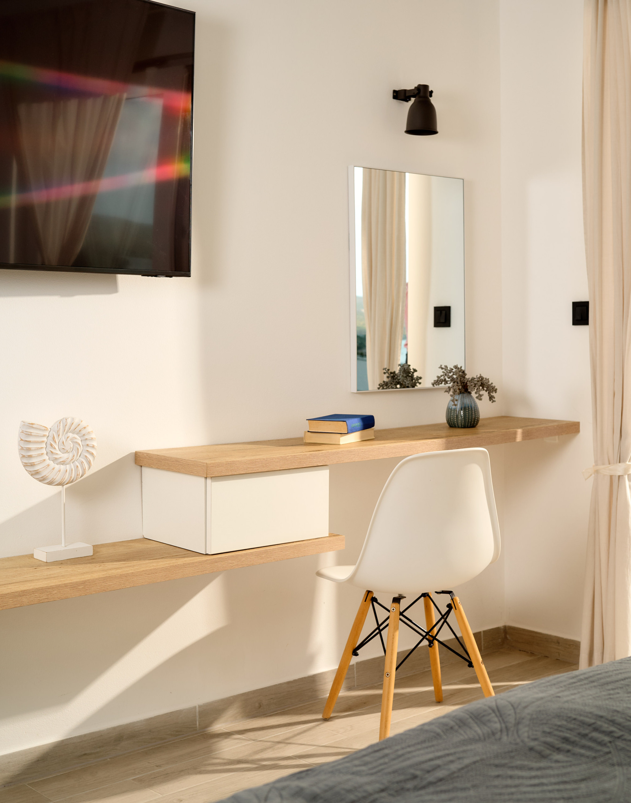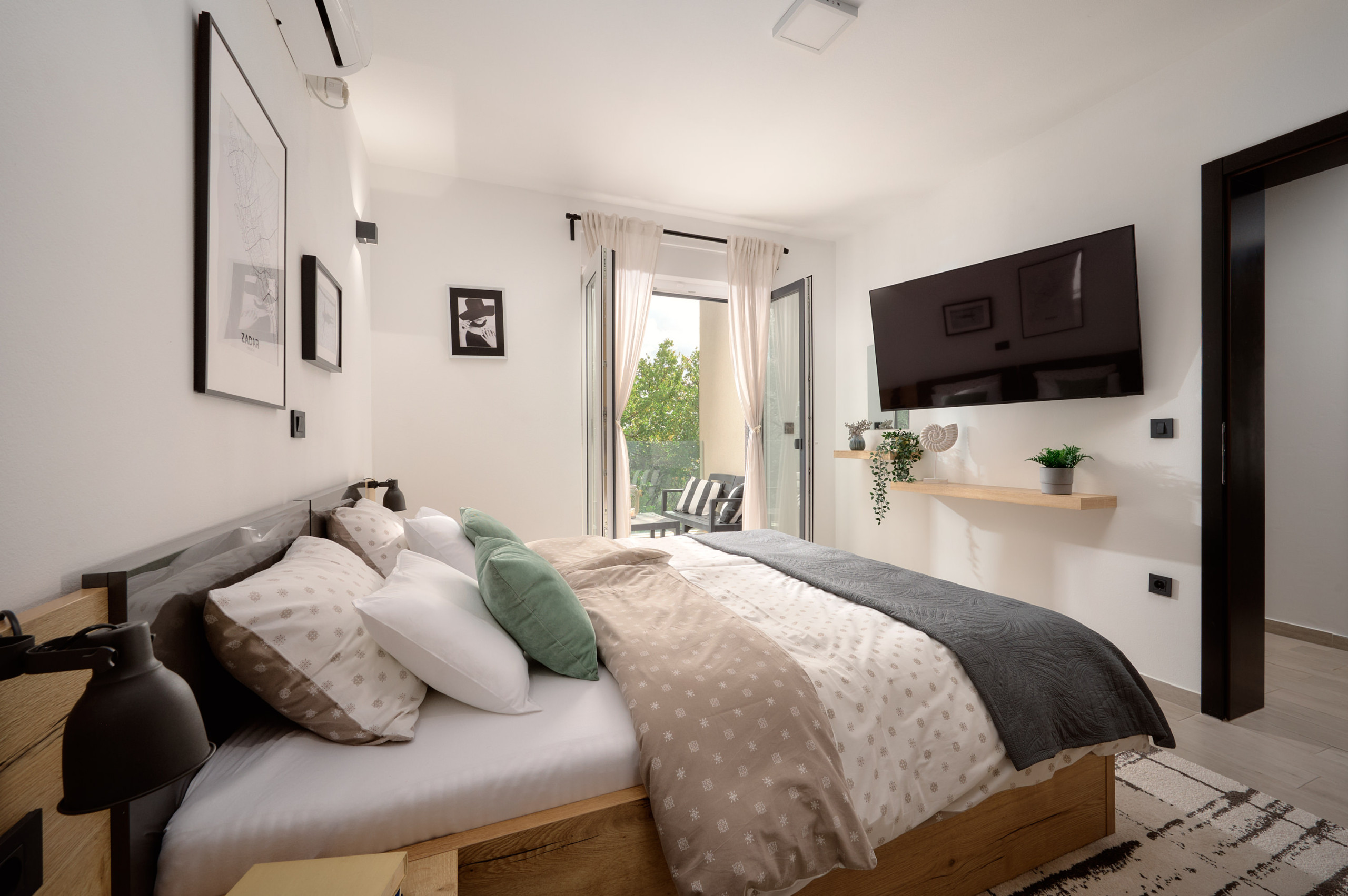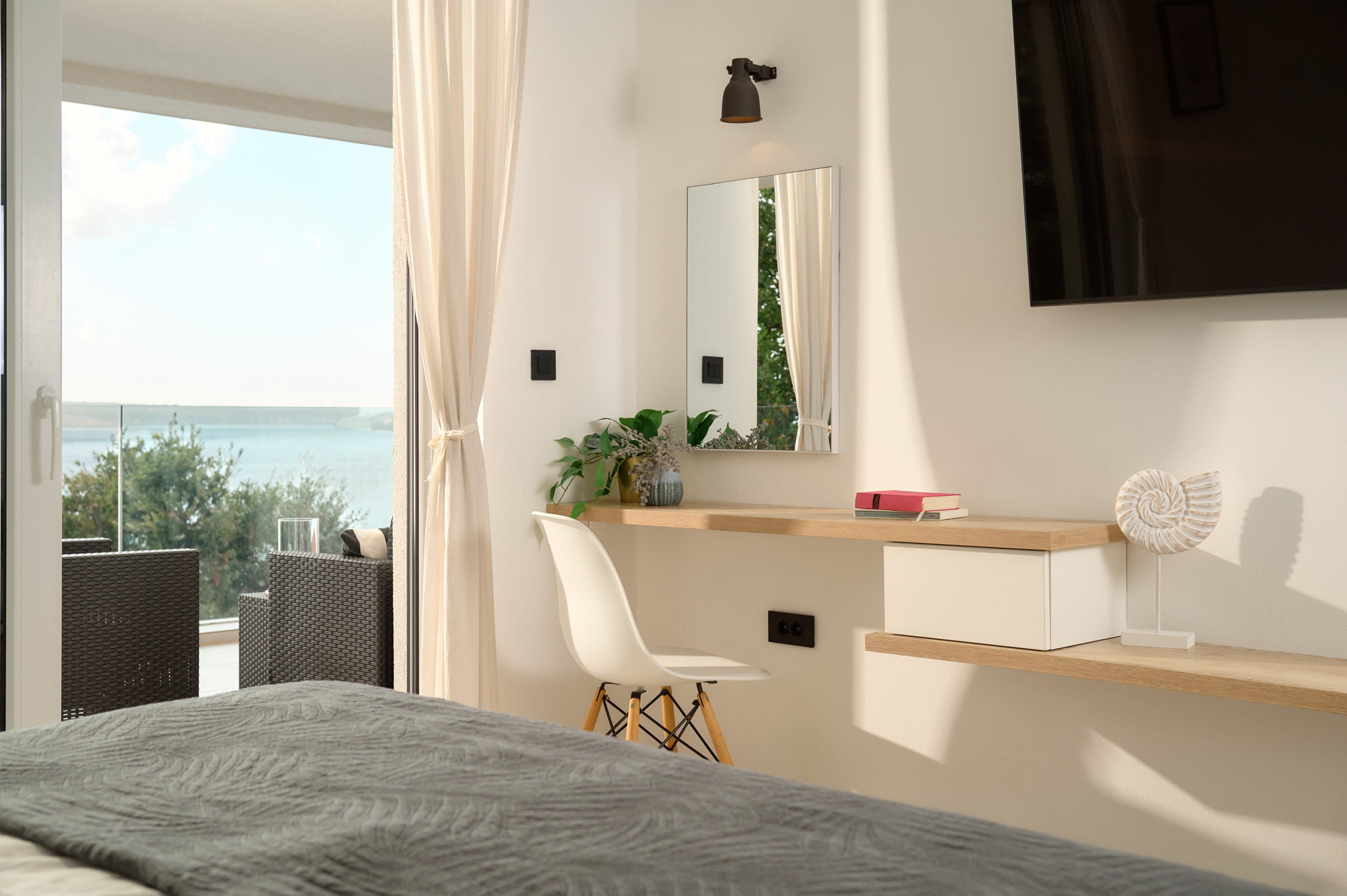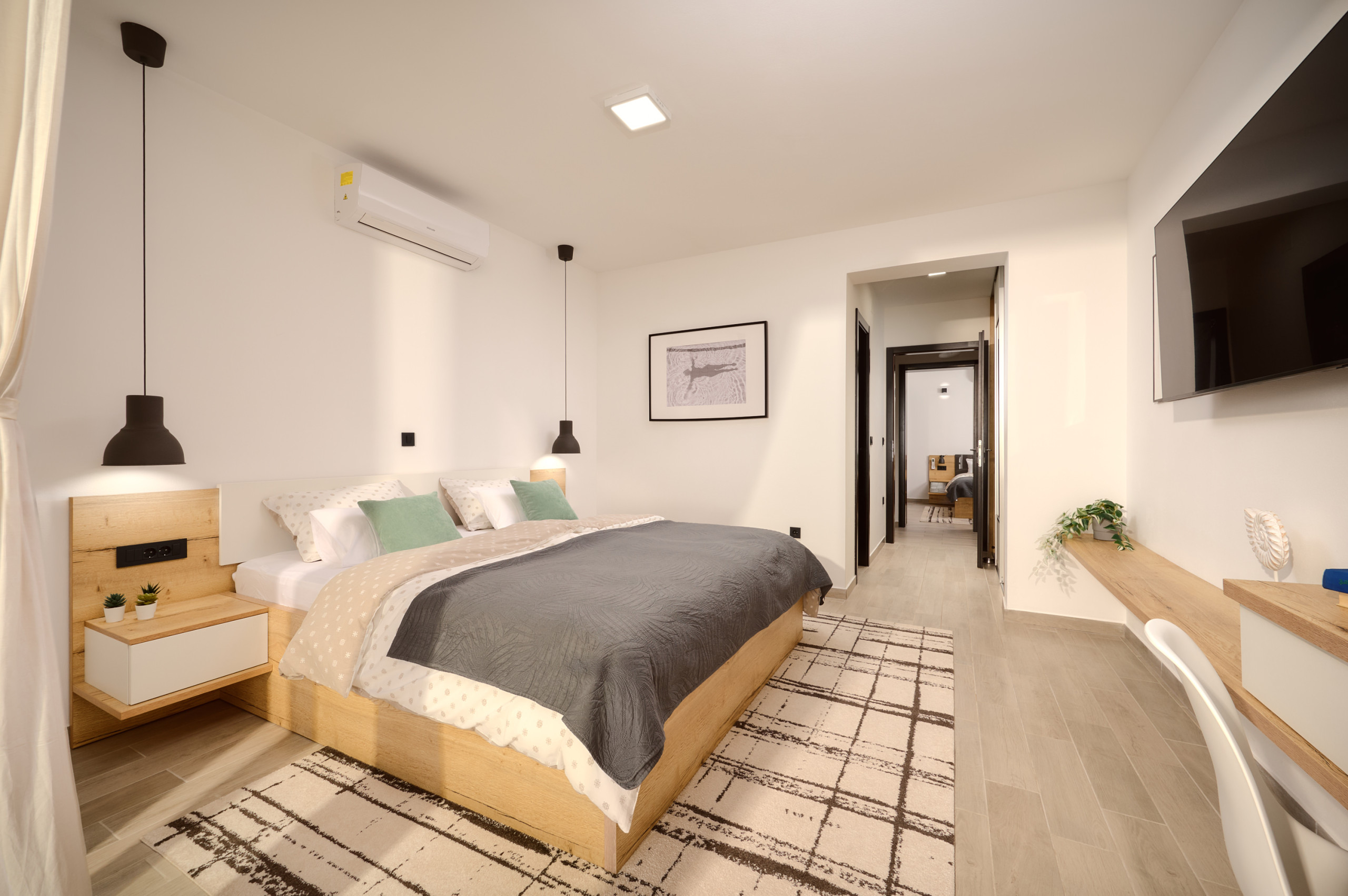Im ersten Stock befinden sich alle Schlafzimmer, von denen zwei Zugang zu einem Balkon mit atemberaubendem Meerblick bieten. Jedes Detail der Inneneinrichtung wurde sorgfältig im eleganten Industriestil gestaltet, der perfekt mit der modernen Fassade der Villa harmoniert.