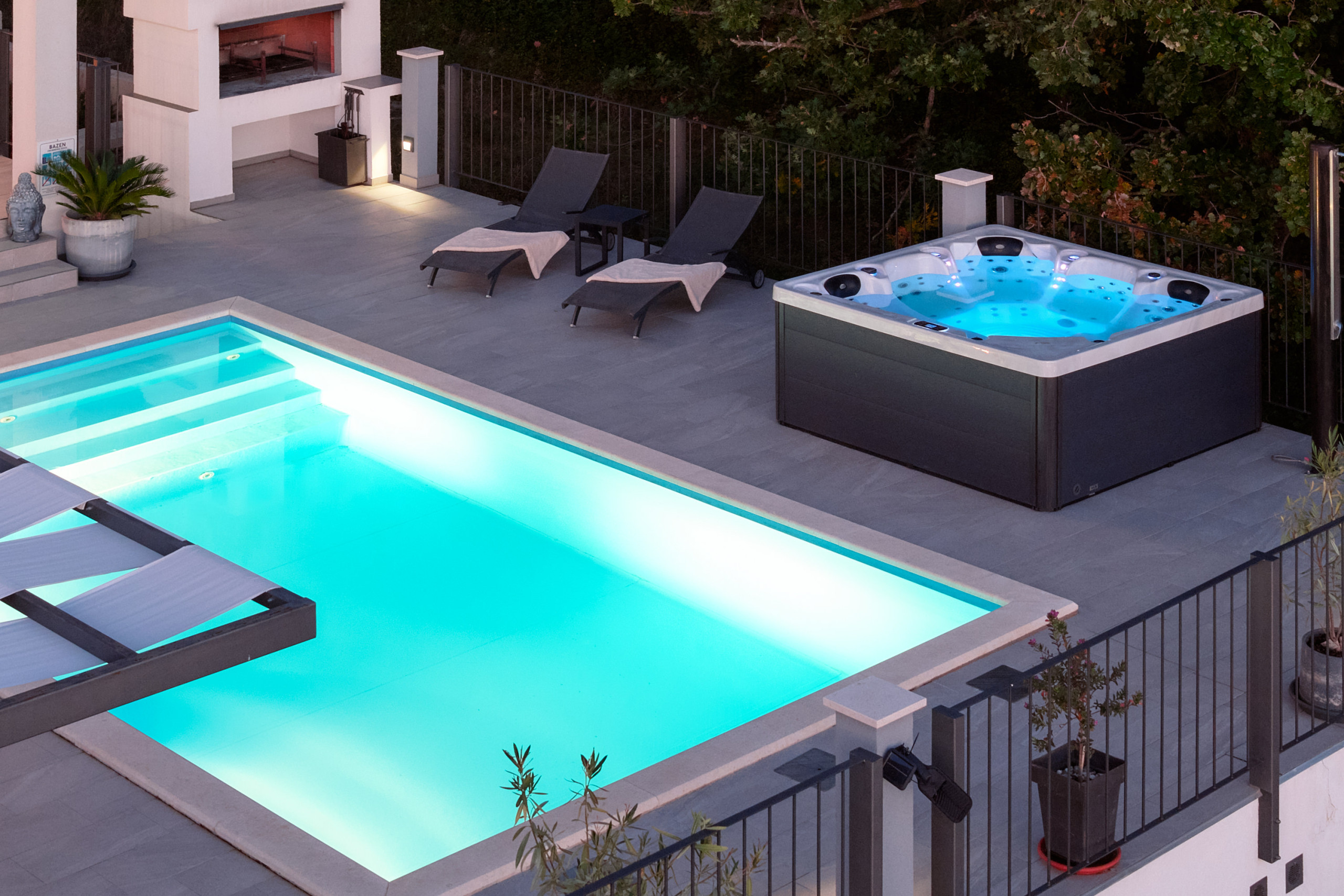 Der großzügige Außenbereich umfasst einen Swimmingpool mit Sonnenliegen, einen Whirlpool, einen Grillplatz und fünf sichere Parkplätze – alles, was Sie für einen unbeschwerten Aufenthalt benötigen.