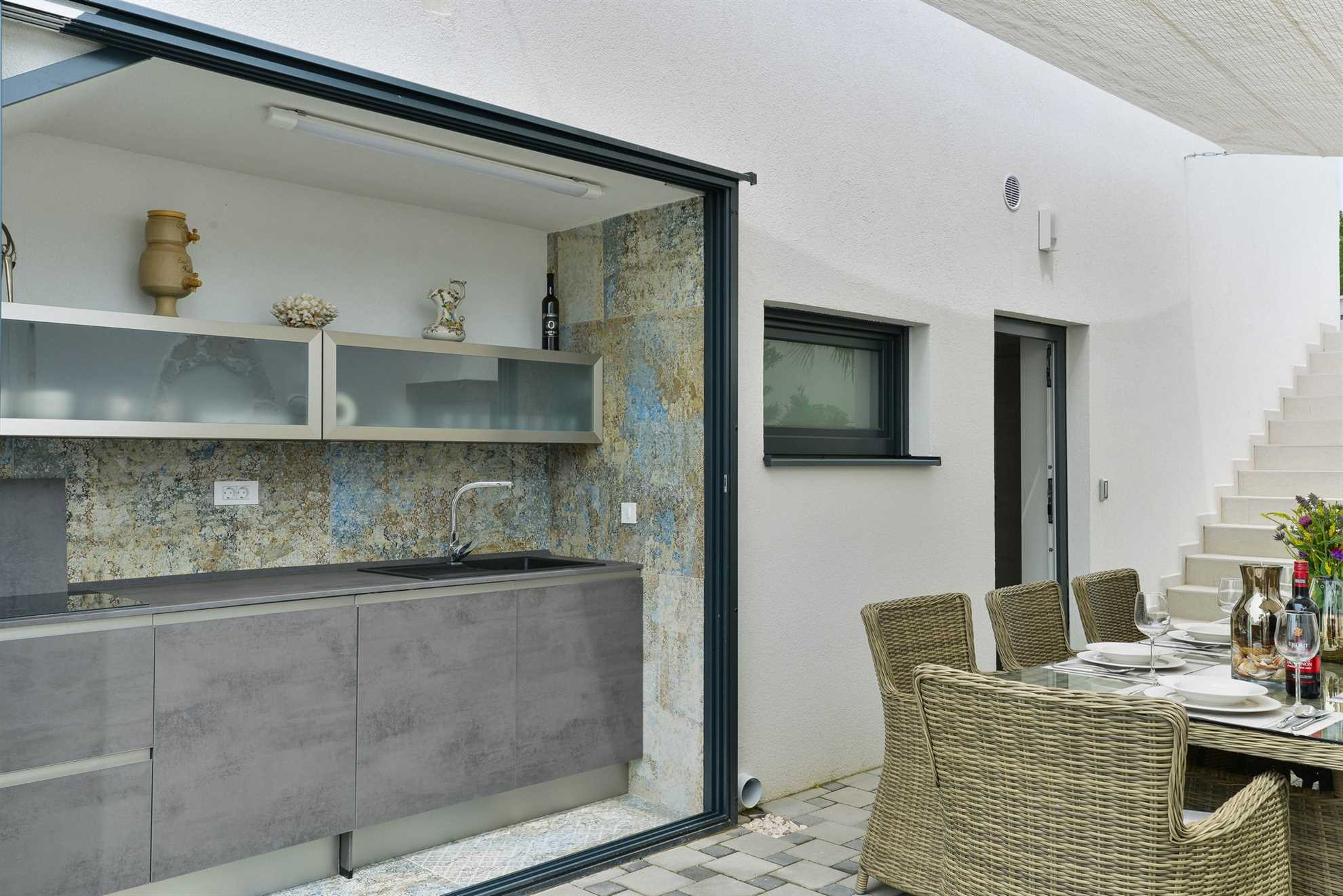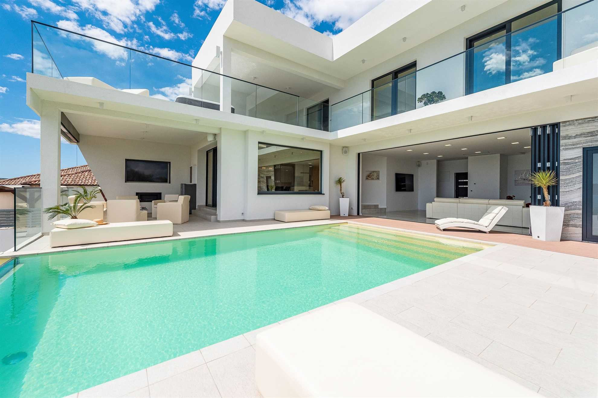 Der Außenbereich wird durch einen Pool ergänzt, der über die Wand hinweg fließt und Ihnen das Gefühl gibt, dass Ihr Urlaub und Ihr Genuss niemals enden werden. Und genau so fühlt es sich an. Ob Sie sich für ein Bad entscheiden, sich in der Sonne am Pool entspannen oder lieber auf der bequemen Gartenmöbelgruppe im Freien verweilen – Sie werden den wunderschönen Blick auf die Adria genießen. Nur wenige Schritte von der Villa entfernt ist das Meer buchstäblich unter Ihren Füßen.