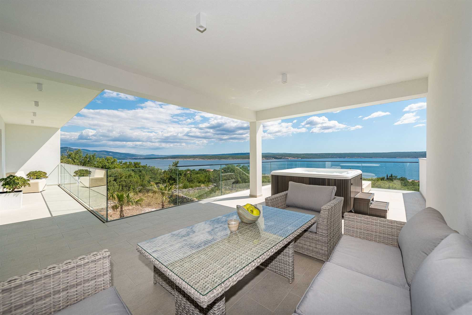 Im Dachgeschoss erwartet Sie eine großzügige Sonnenterrasse mit traumhaftem Meerblick. Auf der Dachterrasse lädt ein brandneuer Whirlpool zum Entspannen ein – der perfekte Ort, um den Panoramablick auf das Meer von Novigrad bei Tag und Nacht zu genießen.