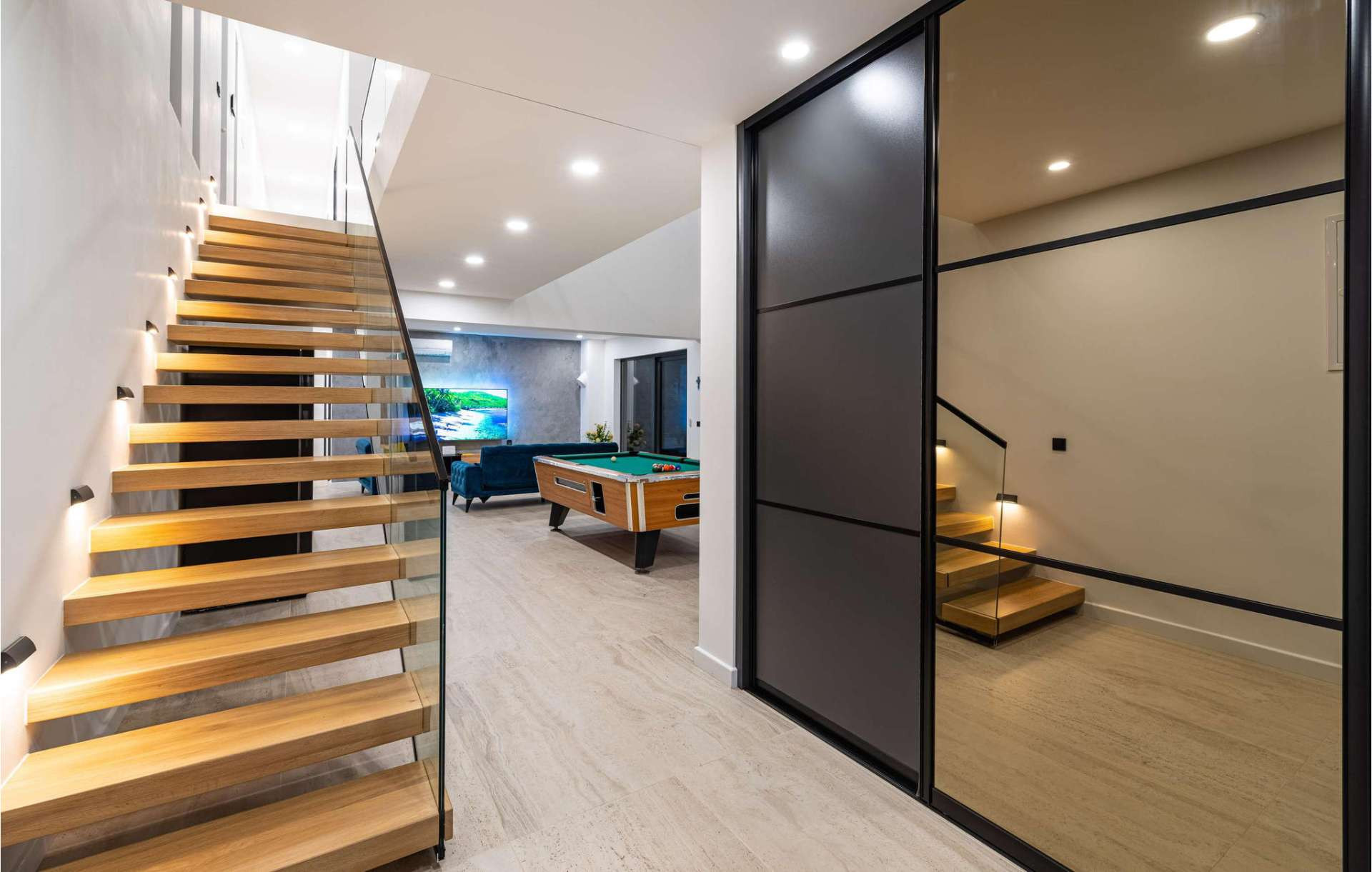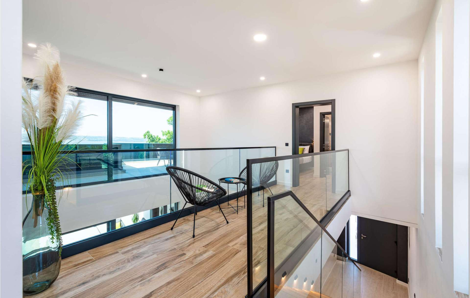 Im ersten Stock befinden sich alle Schlafzimmer, von denen zwei Zugang zu einem Balkon mit atemberaubendem Meerblick bieten. Jedes Detail der Inneneinrichtung wurde sorgfältig im eleganten Industriestil gestaltet, der perfekt mit der modernen Fassade der Villa harmoniert.