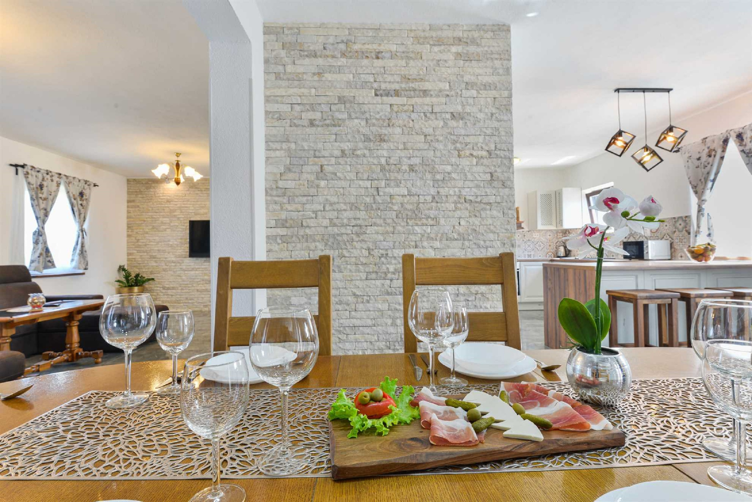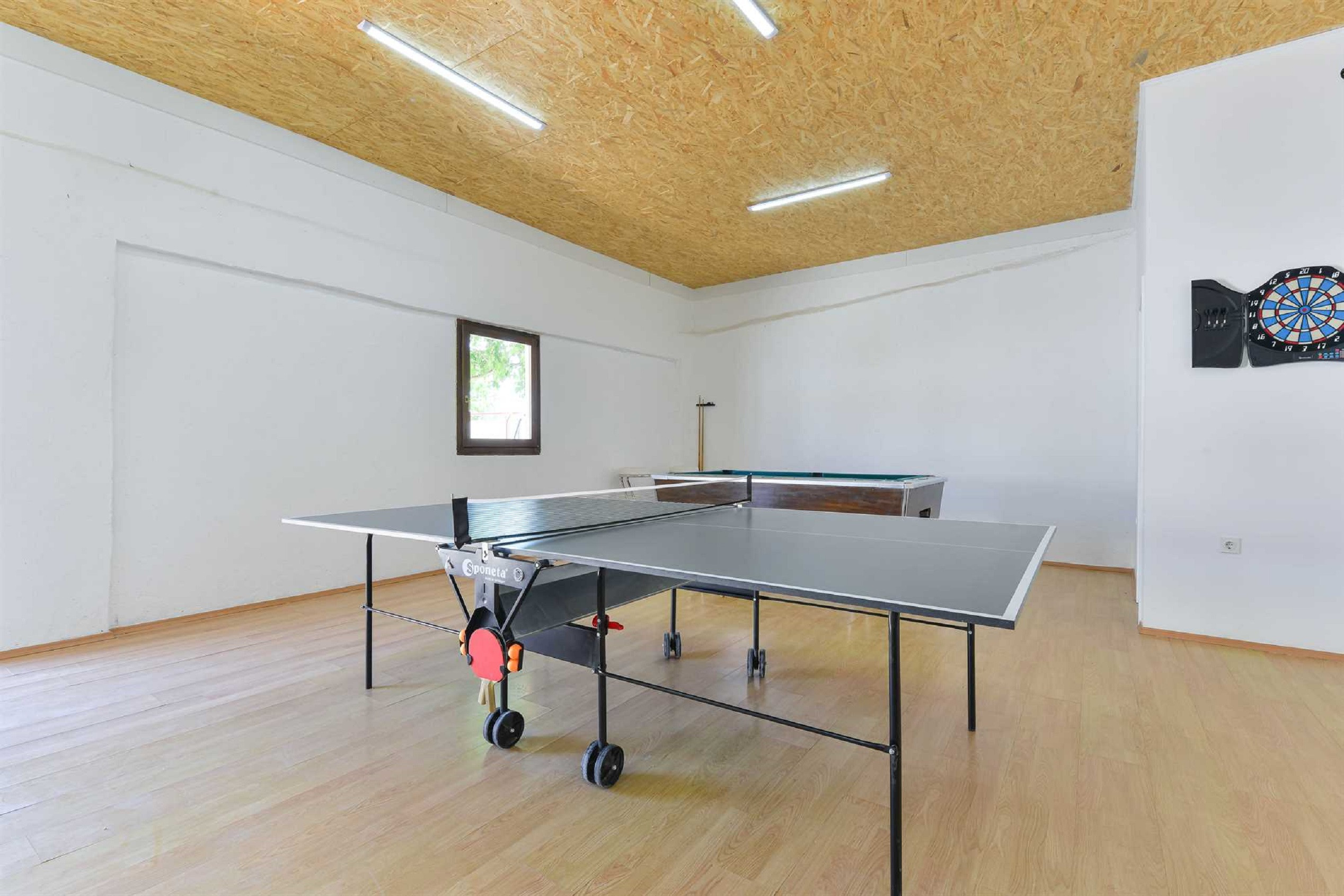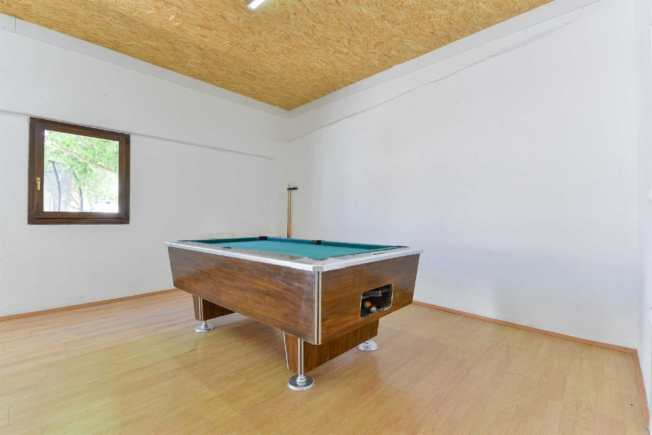 Die moderne offene Küche mit Essbereich und das moderne Wohnzimmer laden zum gemeinsamen Kochen und zu entspannten Gesprächen ein. Es ist komplett ausgestattet mit allen Geräten, die Sie benötigen, wie einem Backofen, einem Geschirrspüler, einem Induktionskochfeld, einem Kühlschrank mit Gefrierfach, einer Filterkaffeemaschine, einem Toaster und einer Mikrowelle. Es gibt auch einen handgefertigten Schachtisch. Im Unterhaltungsraum finden Sie einen Billardtisch, Tischtennis, Darts und eine Playstation, wenn Sie Spaß im Innenbereich suchen.
