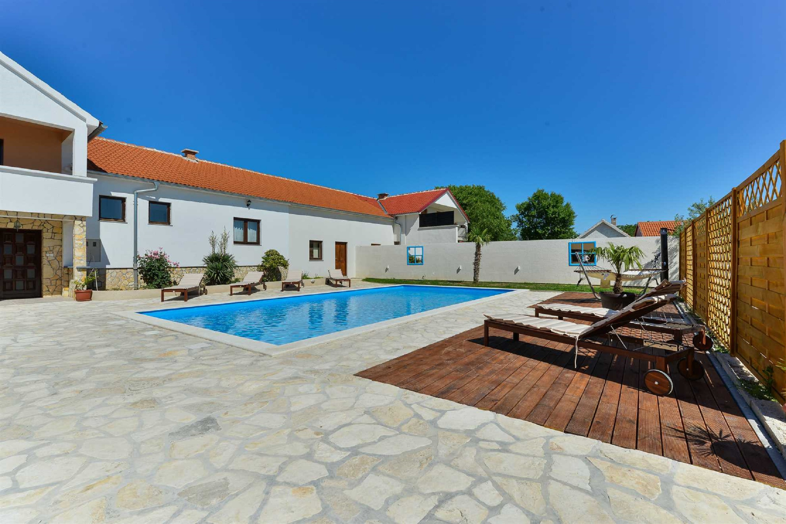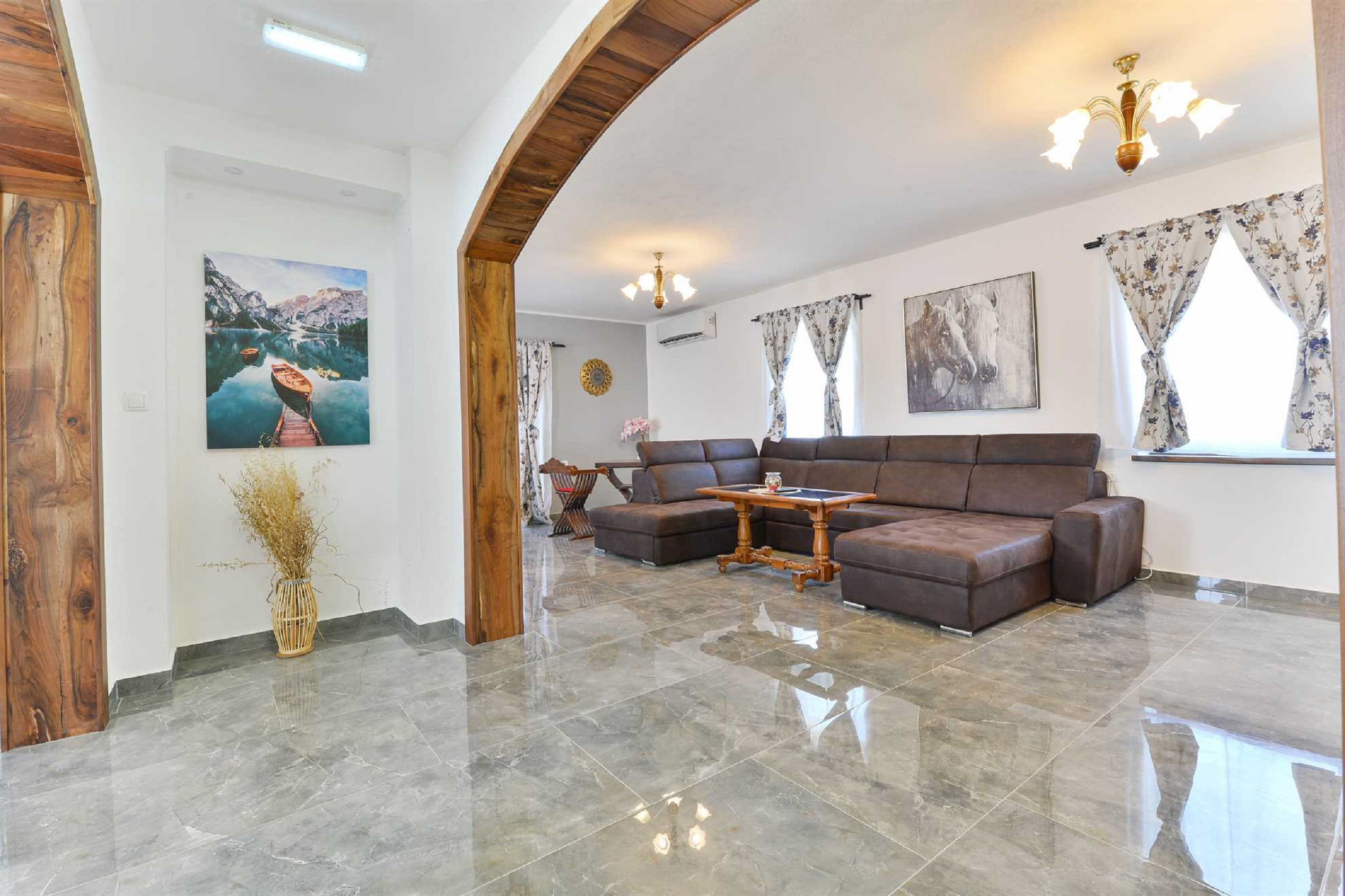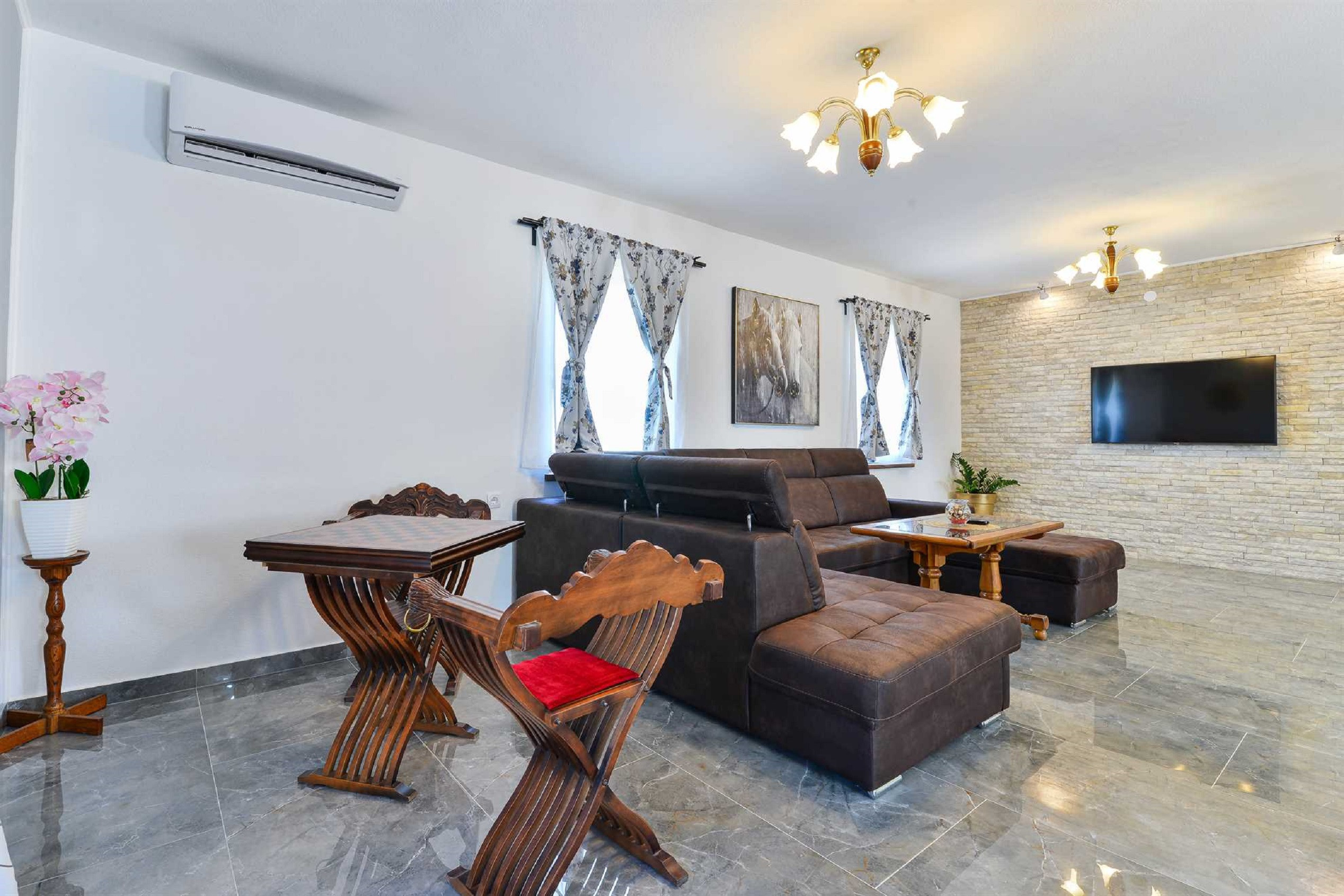 Die moderne offene Küche mit Essbereich und das moderne Wohnzimmer laden zum gemeinsamen Kochen und zu entspannten Gesprächen ein. Es ist komplett ausgestattet mit allen Geräten, die Sie benötigen, wie einem Backofen, einem Geschirrspüler, einem Induktionskochfeld, einem Kühlschrank mit Gefrierfach, einer Filterkaffeemaschine, einem Toaster und einer Mikrowelle. Es gibt auch einen handgefertigten Schachtisch. Im Unterhaltungsraum finden Sie einen Billardtisch, Tischtennis, Darts und eine Playstation, wenn Sie Spaß im Innenbereich suchen.