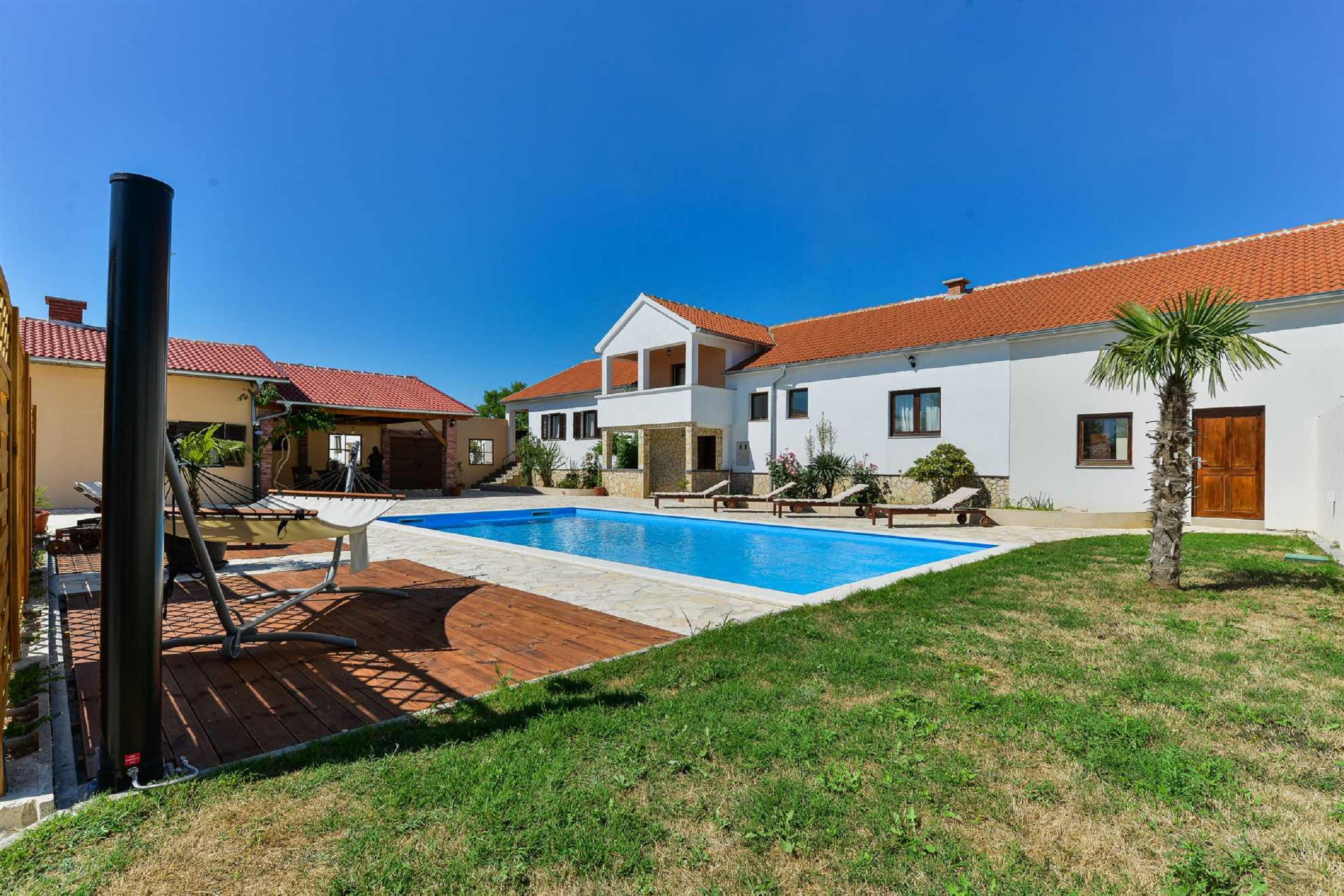 Darüber hinaus gibt es eine Außenküche mit Grill und Sitzbereich sowie einen Kinderspielplatz mit Trampolin, Schaukeln und Sandkasten sowie einen großen Swimmingpool mit Liegestühlen und Sonnenschirmen.