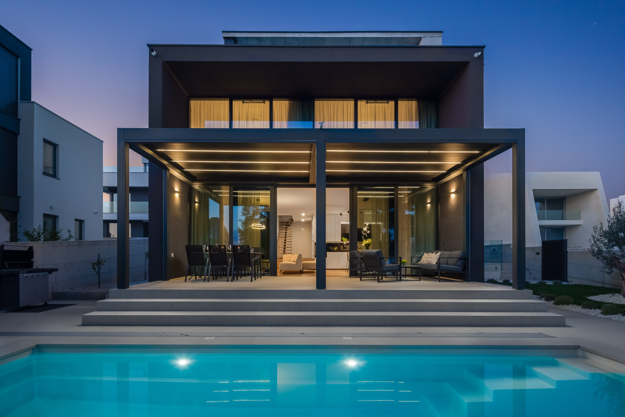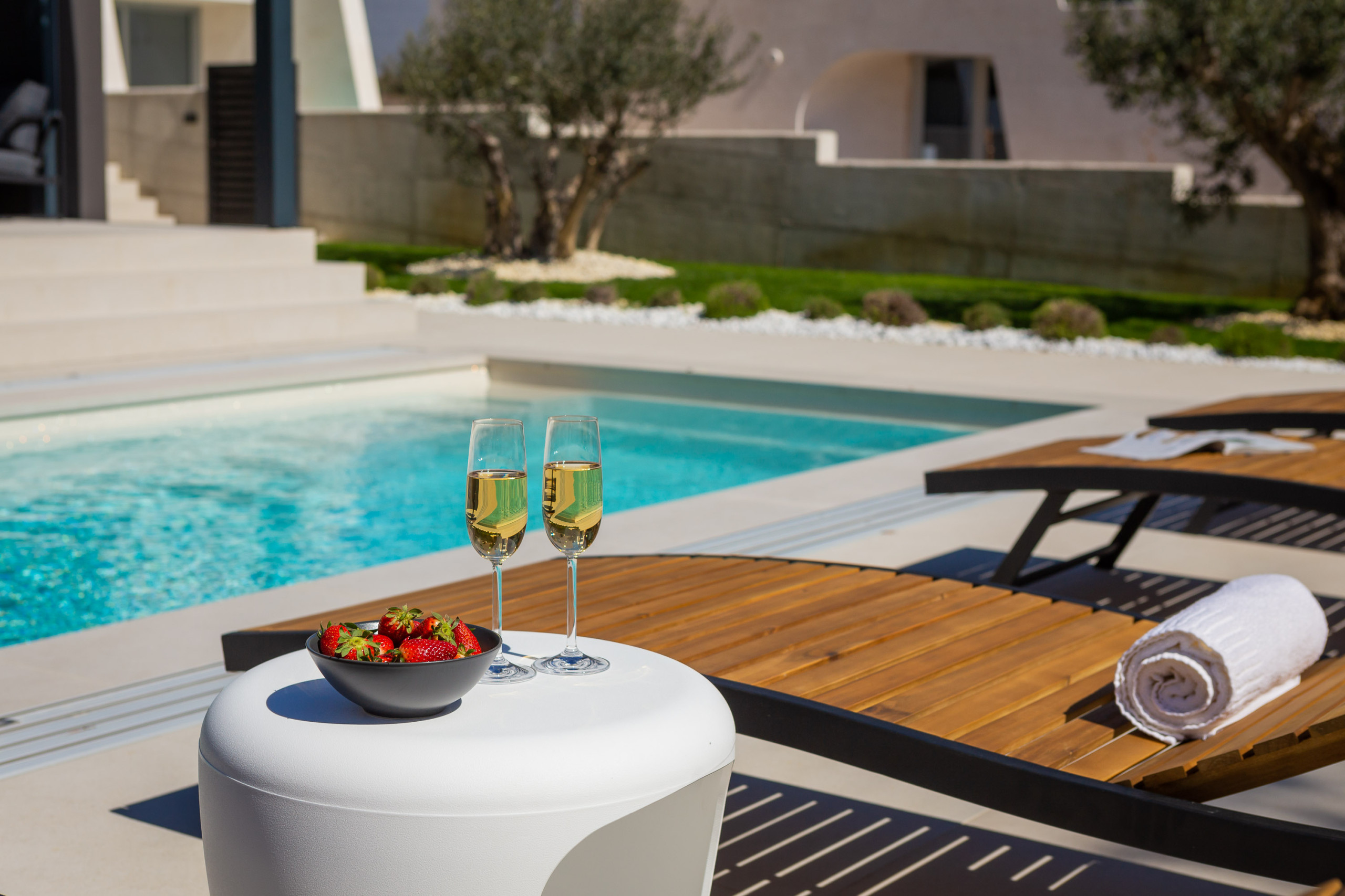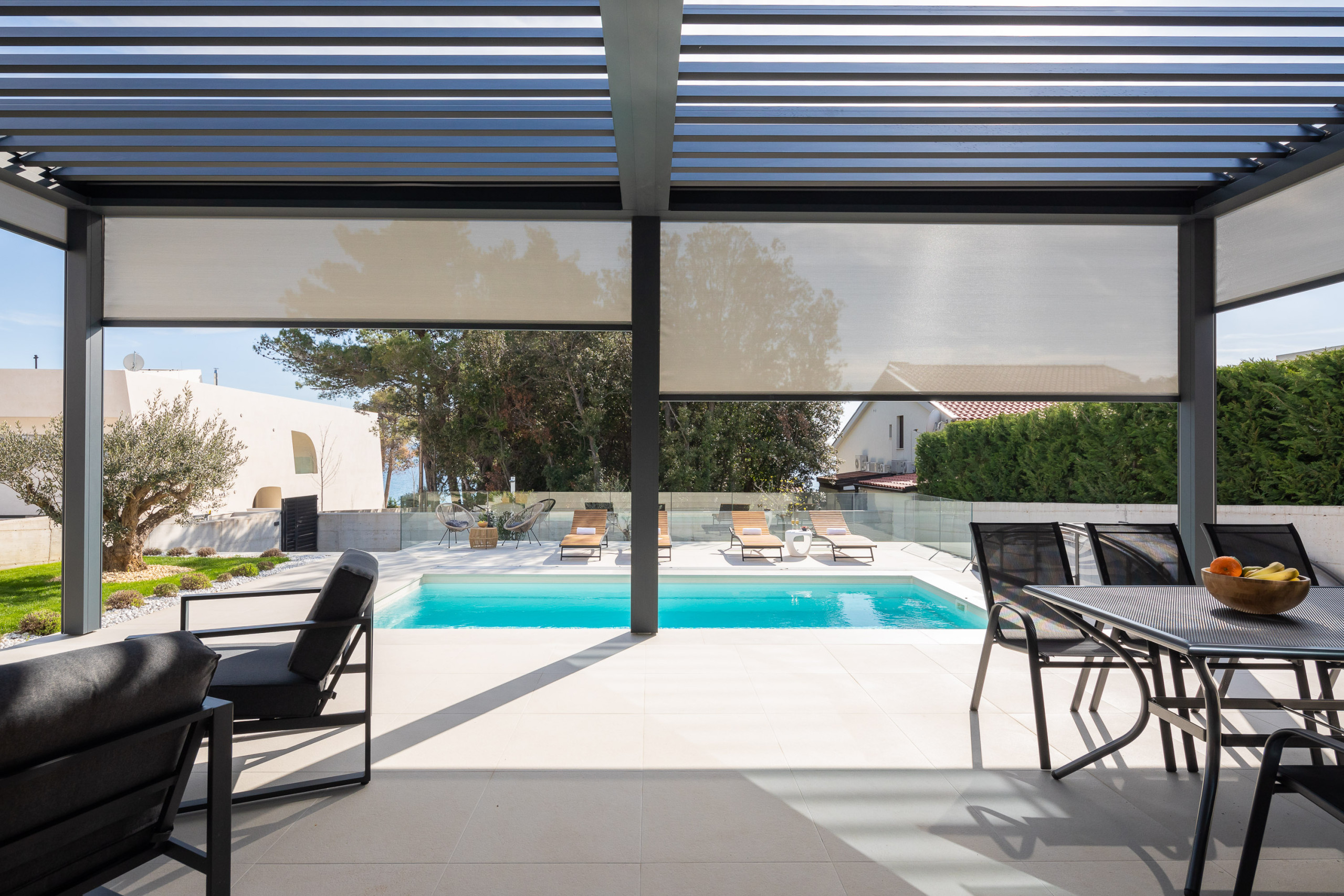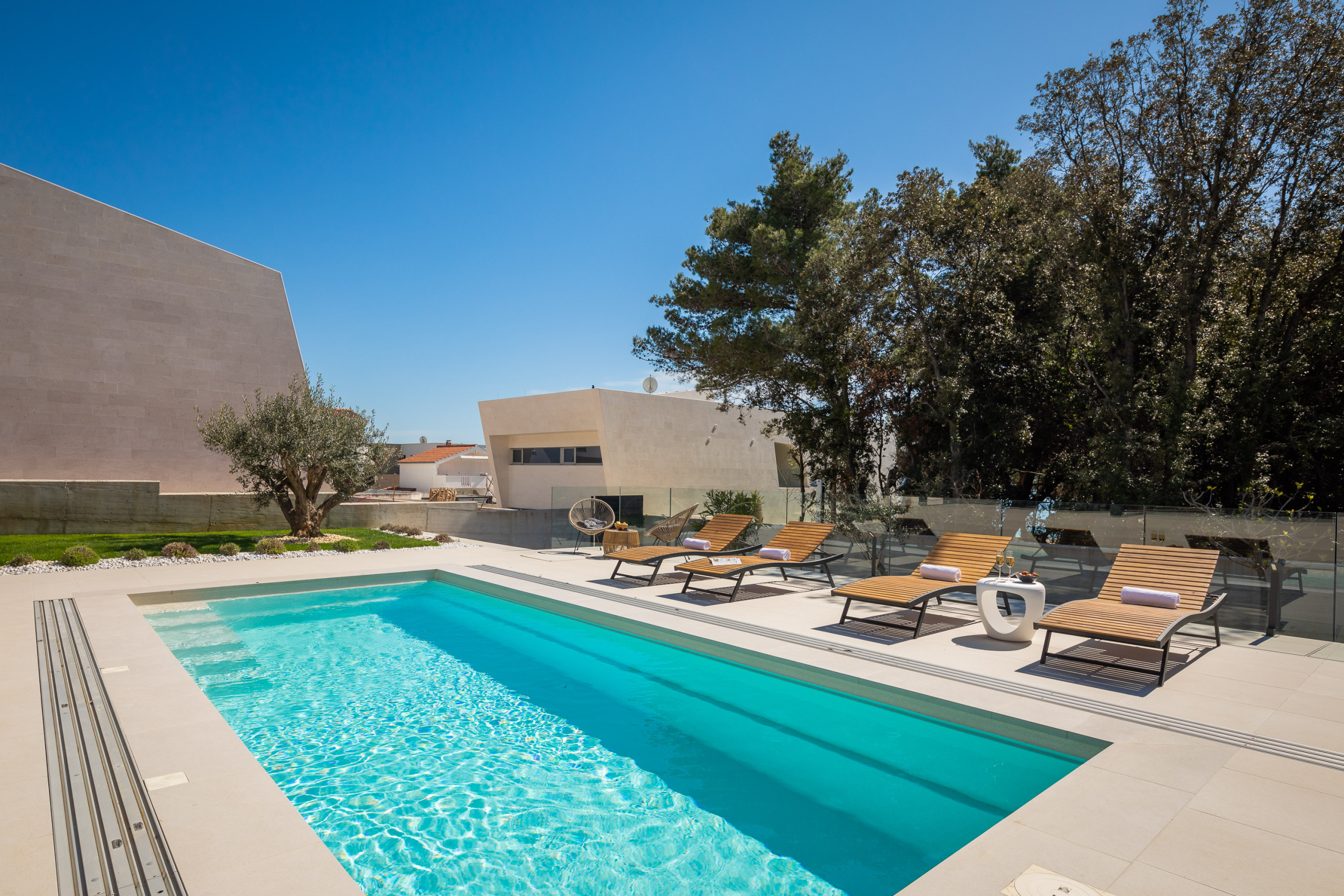 Die Villa verfügt über vier Schlafzimmer, die für maximalen Komfort konzipiert sind. Drei geräumige Zimmer sind mit Doppelbetten ausgestattet, während die Dachsuite zusätzlichen Luxus mit eigenem Badezimmer und atemberaubenden Ausblicken bietet. Die Villa kann bis zu 8 Erwachsene und 2 Kinder beherbergen, was sie ideal für Familien oder größere Gruppen macht.