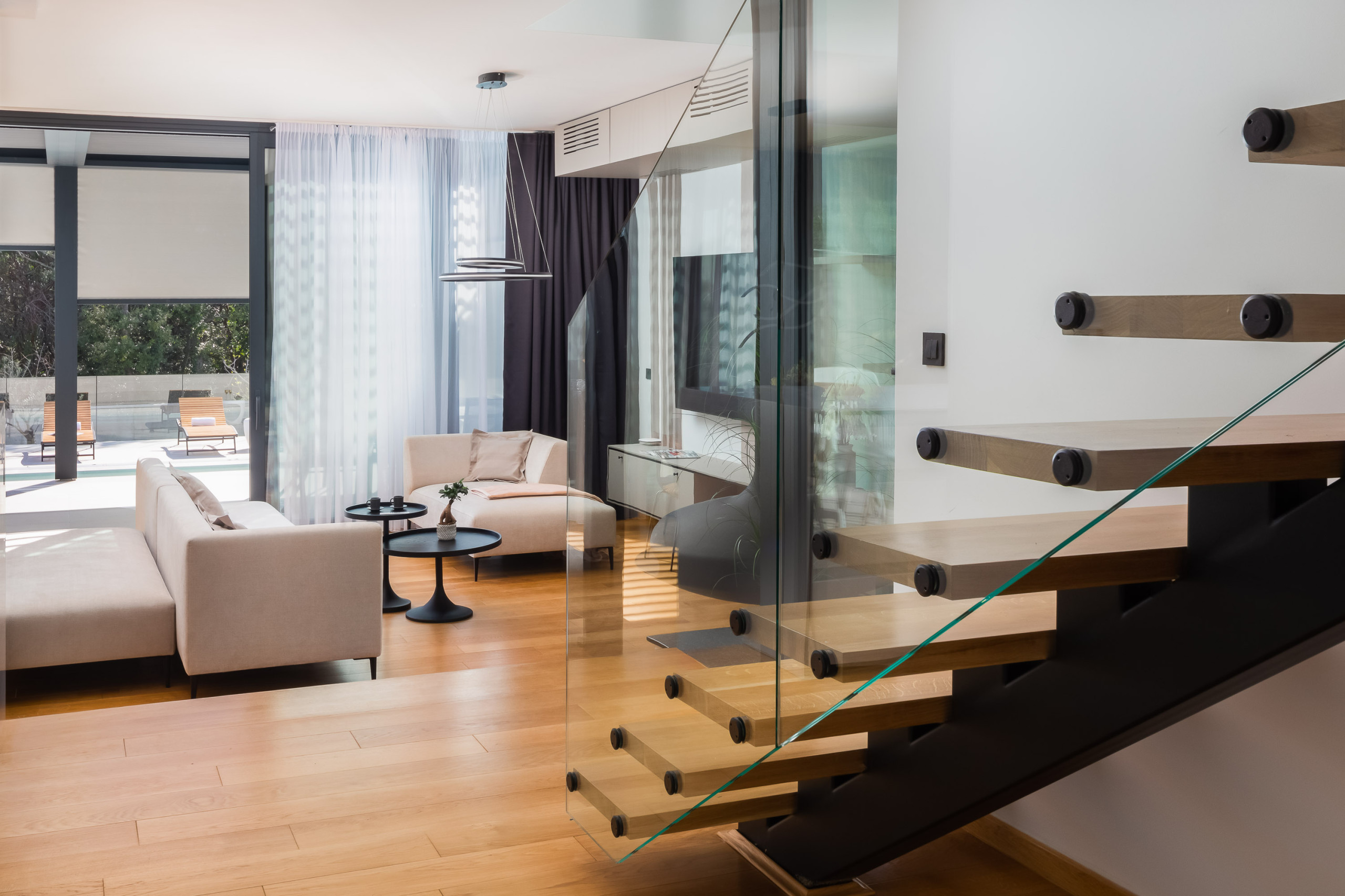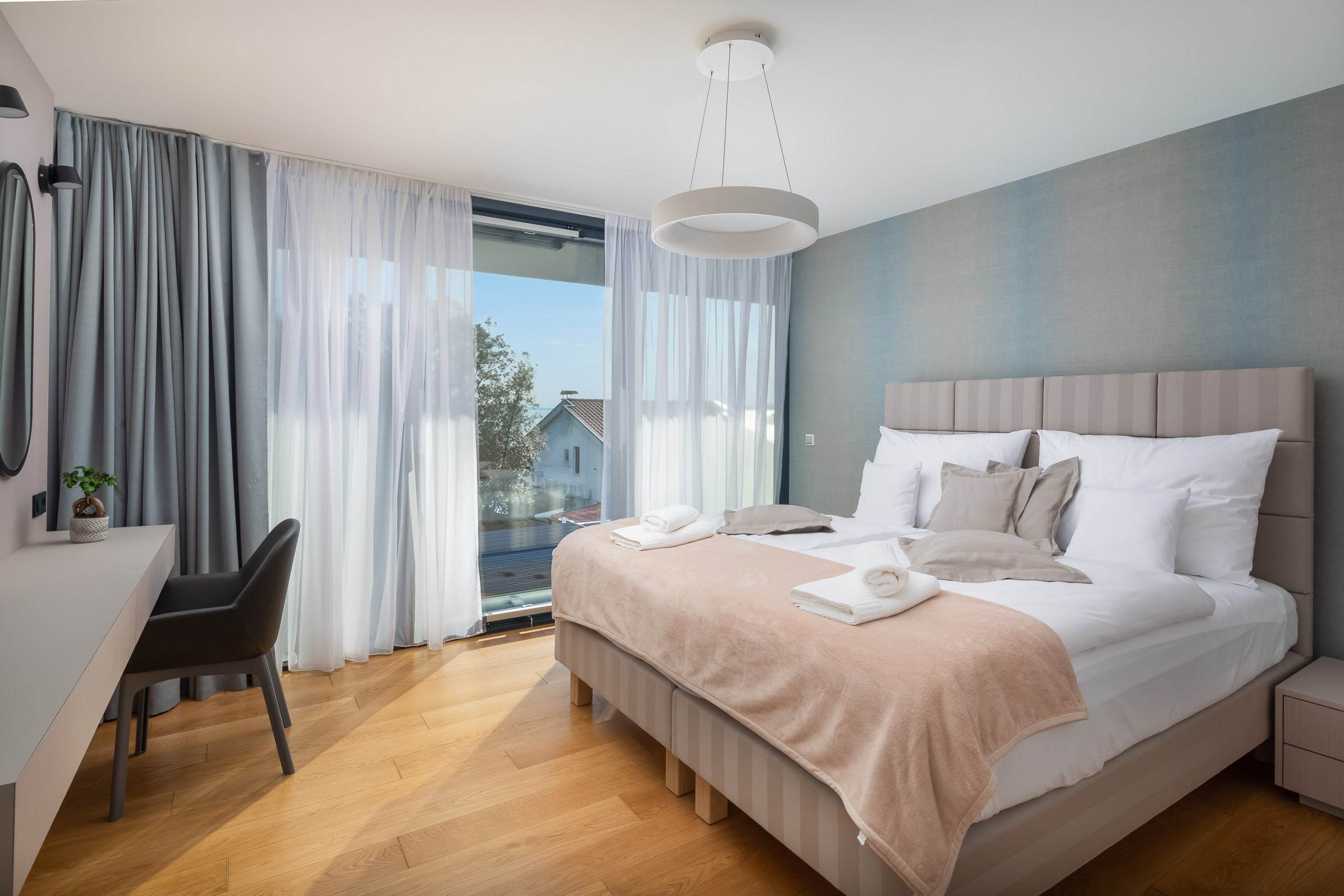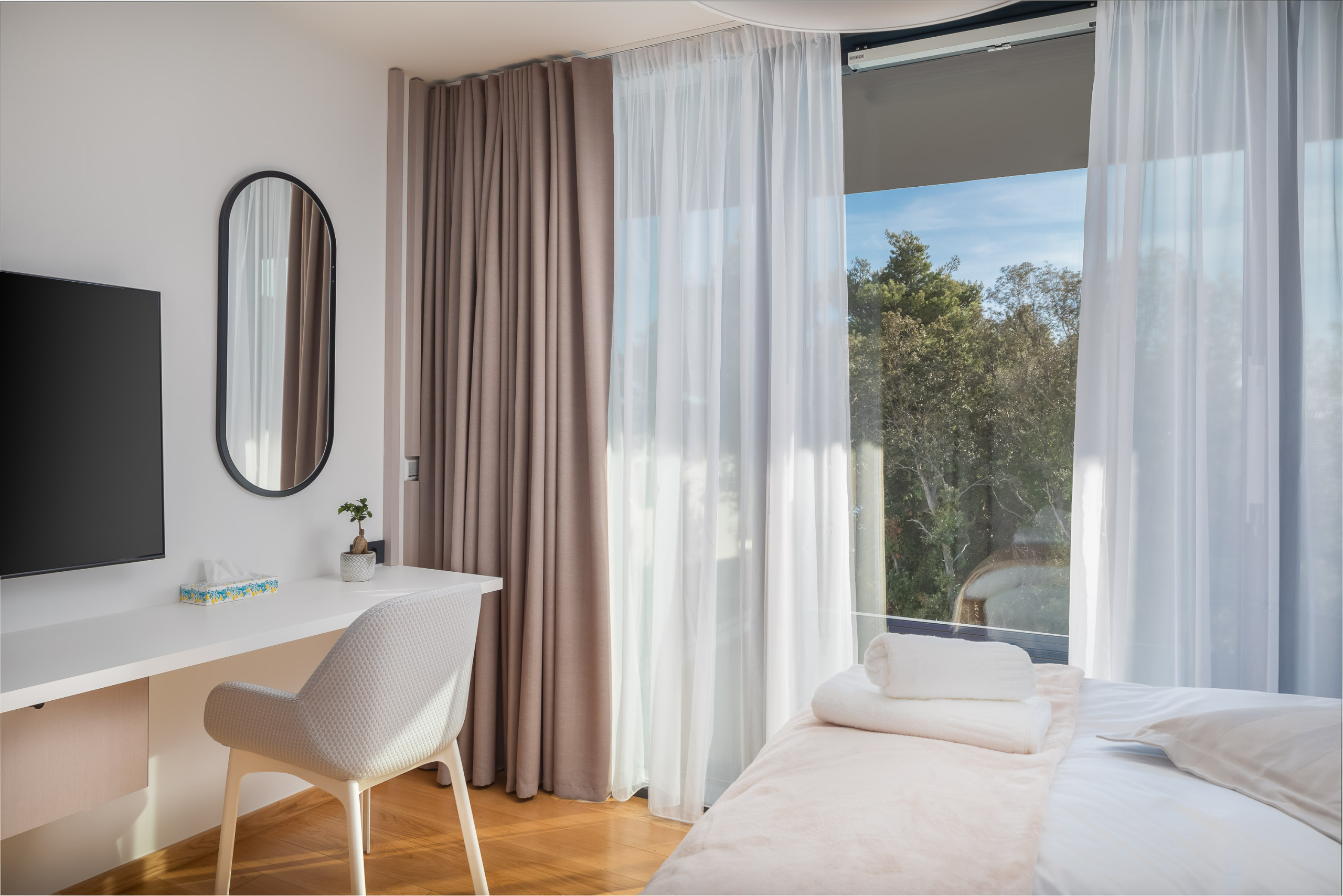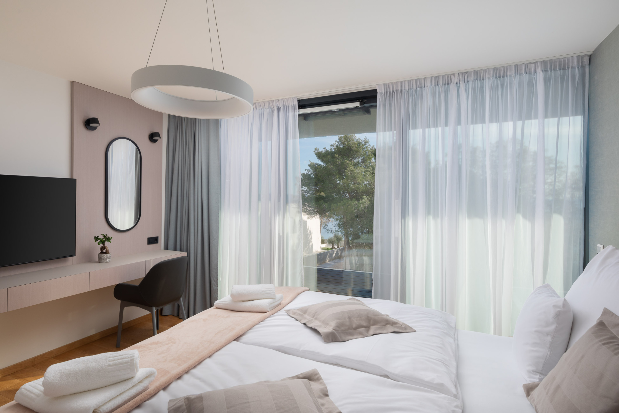 Die Villa verfügt über vier Schlafzimmer, die für maximalen Komfort konzipiert sind. Drei geräumige Zimmer sind mit Doppelbetten ausgestattet, während die Dachsuite zusätzlichen Luxus mit eigenem Badezimmer und atemberaubenden Ausblicken bietet. Die Villa kann bis zu 8 Erwachsene und 2 Kinder beherbergen, was sie ideal für Familien oder größere Gruppen macht.