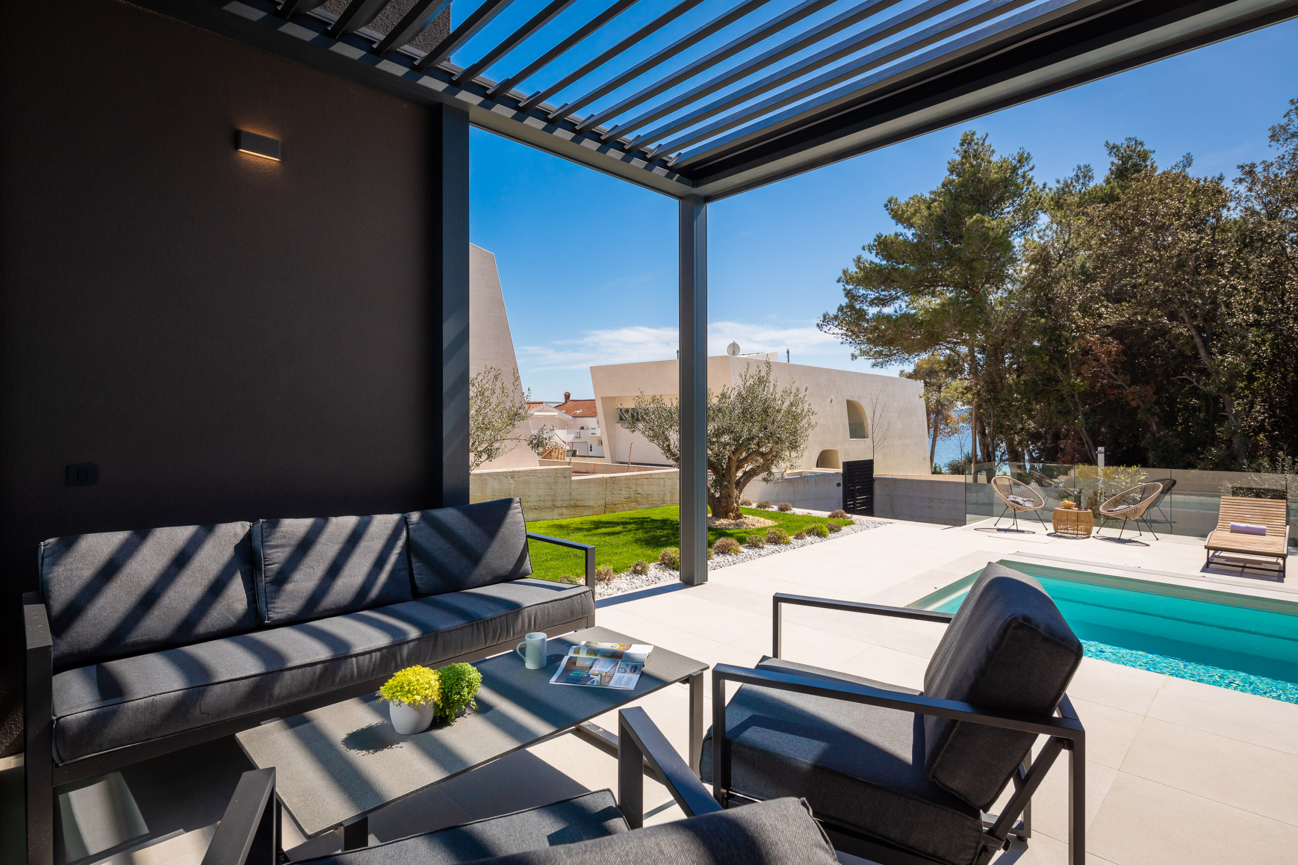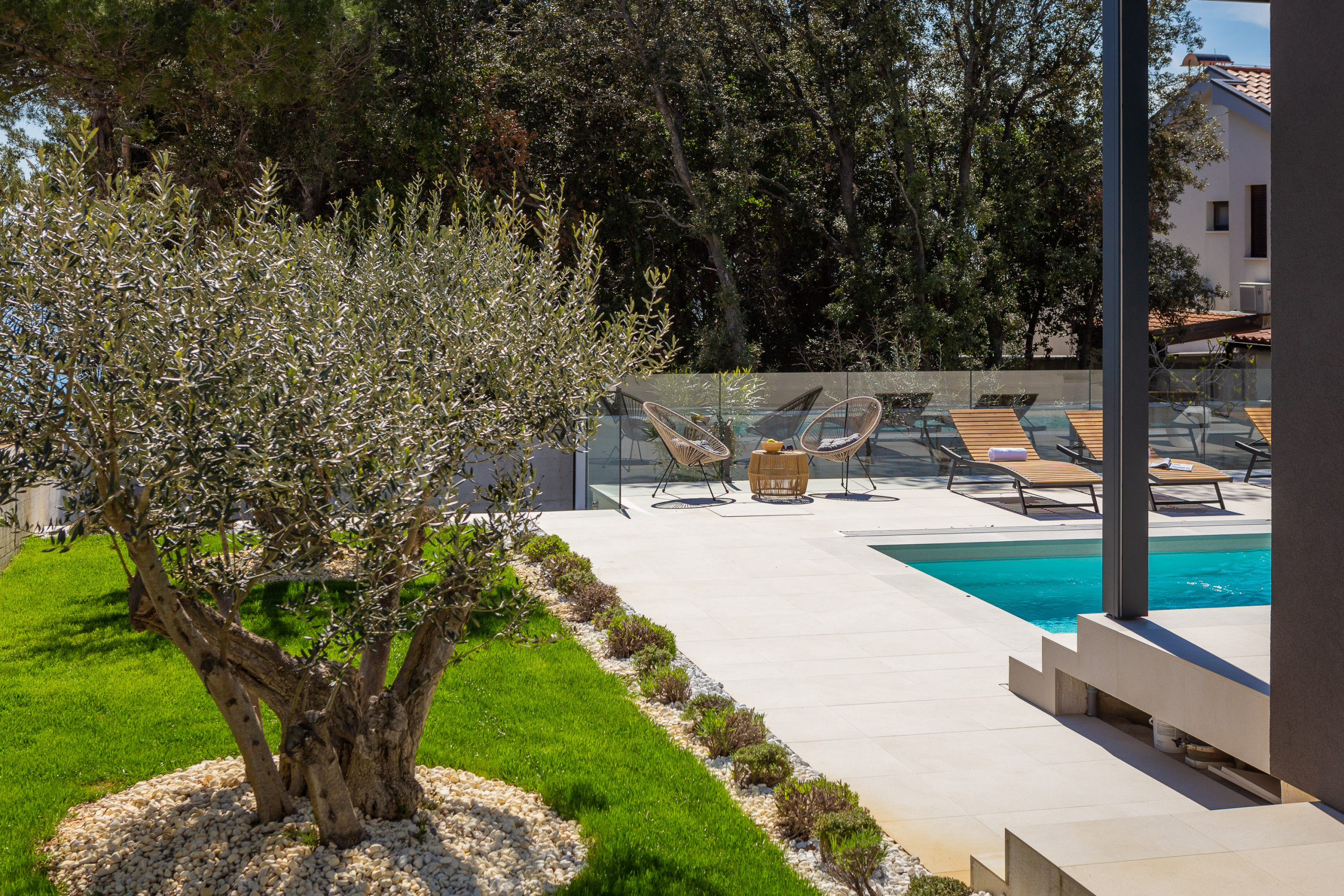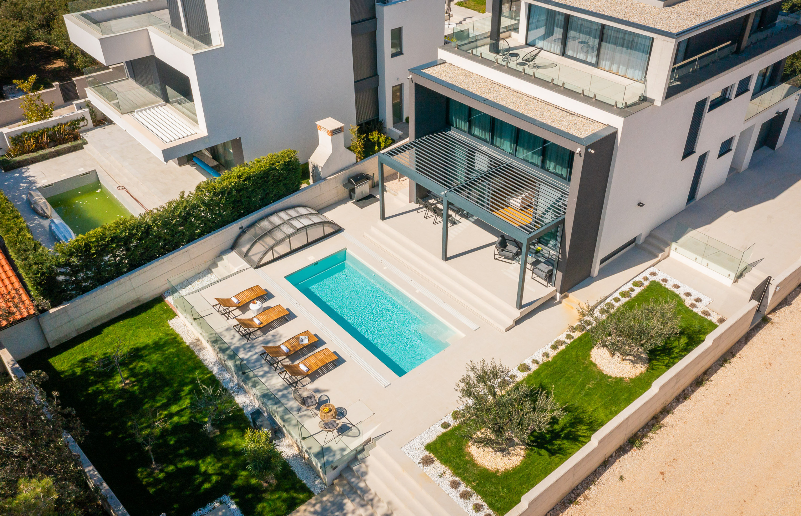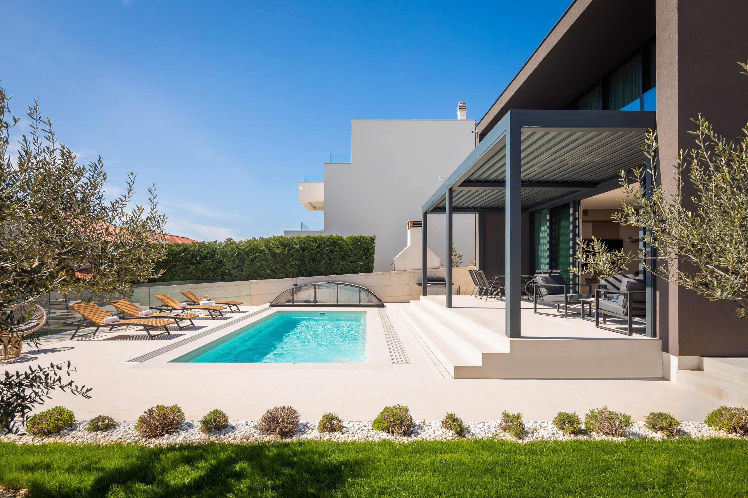 Die weitläufige Terrasse mit einem imposanten, beheizten Whirlpool von 26 m² und bequemen Sonnenliegen lädt Sie ein, sich zu entspannen und die ruhige mediterrane Atmosphäre zu genießen. Mit einem Außengrill ausgestattet, ist die Terrasse perfekt, um sich zu treffen und die frische Luft zu genießen.