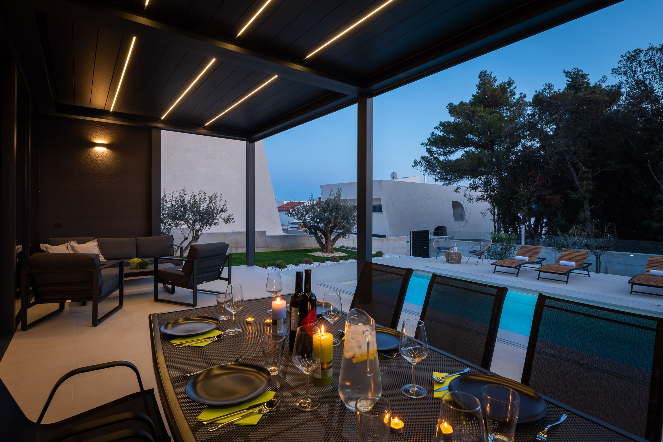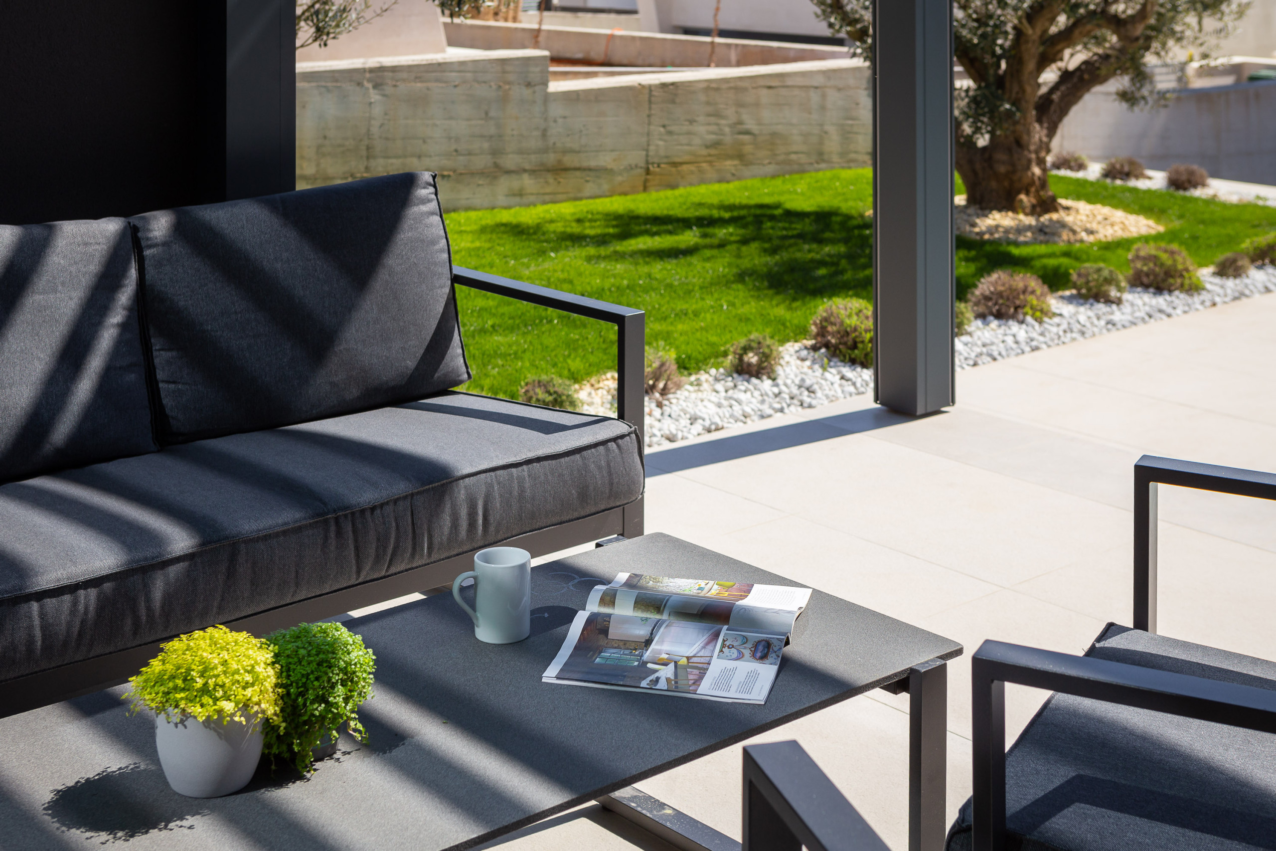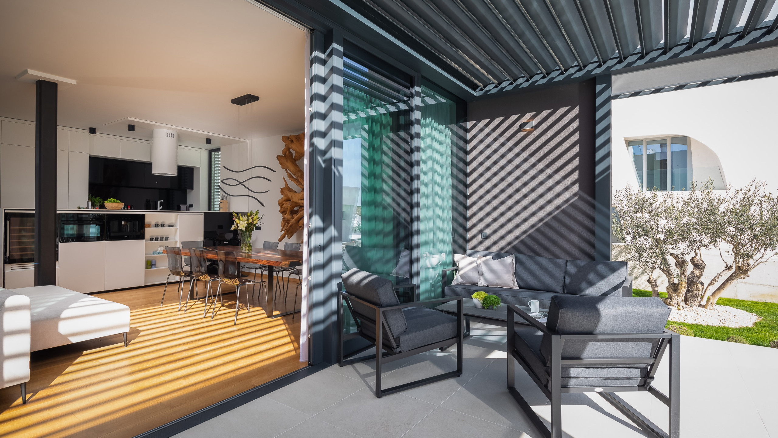 Die weitläufige Terrasse mit einem imposanten, beheizten Whirlpool von 26 m² und bequemen Sonnenliegen lädt Sie ein, sich zu entspannen und die ruhige mediterrane Atmosphäre zu genießen. Mit einem Außengrill ausgestattet, ist die Terrasse perfekt, um sich zu treffen und die frische Luft zu genießen.