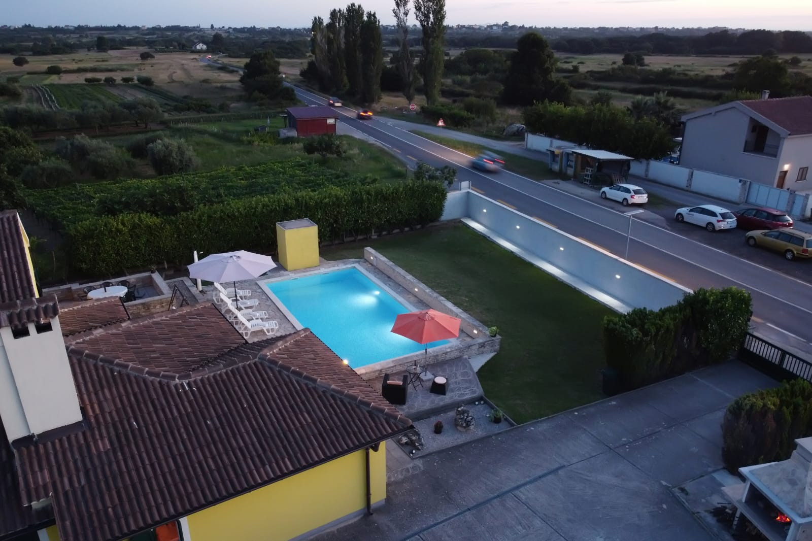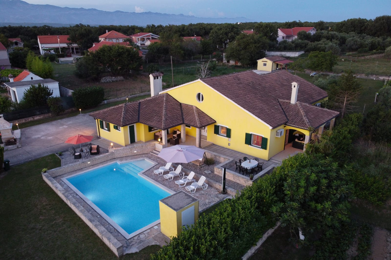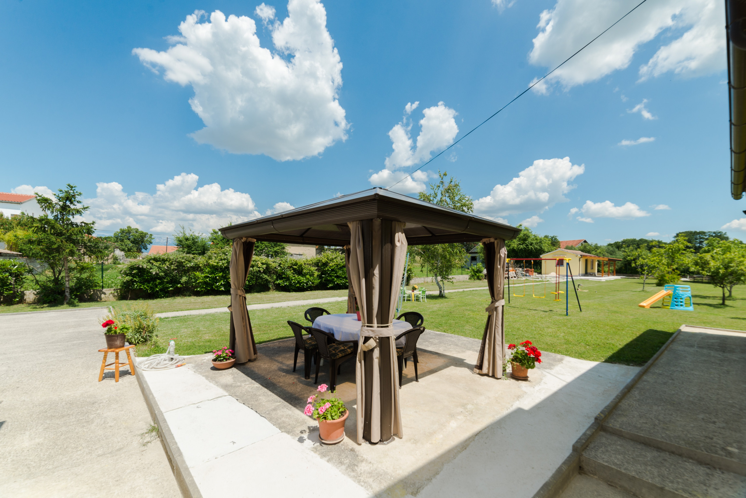 Der 2700 Quadratmeter große Innenhof der Villa Ana entfaltet sich wie ein grünes Paradies mit einem bezaubernden 50 Quadratmeter großen Pool als Herzstück – ein erfrischender Rückzugsort, wenn die Temperaturen auf 30 °C steigen. Dieser von Sonnenliegen umgebene Raum lädt zum gemütlichen Sonnenbaden ein und liegt auf dem vollständig umzäunten Gelände der Villa Ana. Der Außengrill, eingebettet in eine überdachte Holzbalkenküche, erleichtert die Zubereitung herzhafter Mahlzeiten. Dieser externe kulinarische Zufluchtsort bietet auch einen riesigen Essbereich für 10 Personen, während ein Spielplatz für die Unterhaltung der Kinder sorgt. Die von einem Vordach beschattete Terrasse mit Blick auf den Spielplatz ist ein idyllischer Ort, um Ihren Morgenkaffee zu genießen. Für Gäste, die mit dem Auto anreisen, stehen bequem private Parkplätze zur Verfügung.