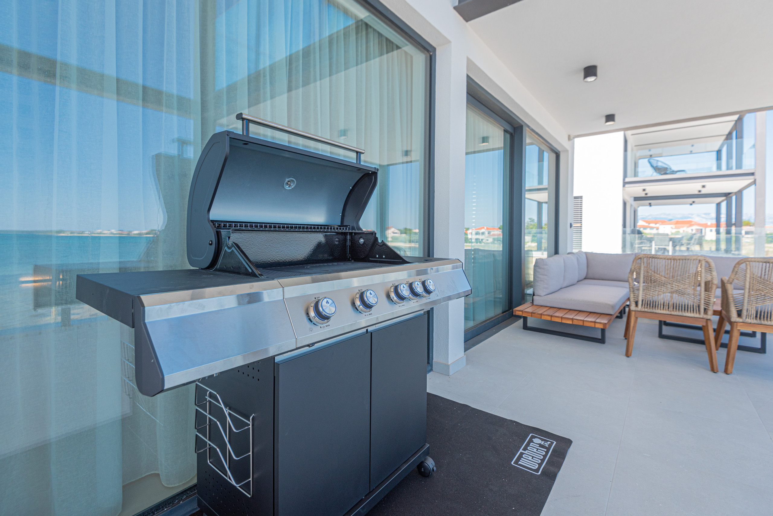 Die Villa umfasst 544 m² Wohnfläche und einen 169 m² großen Garten. Sie verfügt über vier geräumige Schlafzimmer, jedes mit einem Kingsize-Bett (180x200 cm), einem eigenen Badezimmer mit Dusche, einer Klimaanlage und einem Smart-TV. Alle Schlafzimmer bieten einen spektakulären Blick auf das Meer, während die beiden Schlafzimmer im dritten Stock auch über begehbare Kleiderschränke und private Terrassen verfügen. Im Erdgeschoss befinden sich zwei Schlafzimmer und ein Spielzimmer. Im ersten Stock gibt es eine voll ausgestattete Küche, ein großes Wohnzimmer mit einem zusätzlichen Schlafsofa und eine schöne Terrasse, auf der man Mahlzeiten und Sonnenuntergänge genießen kann.