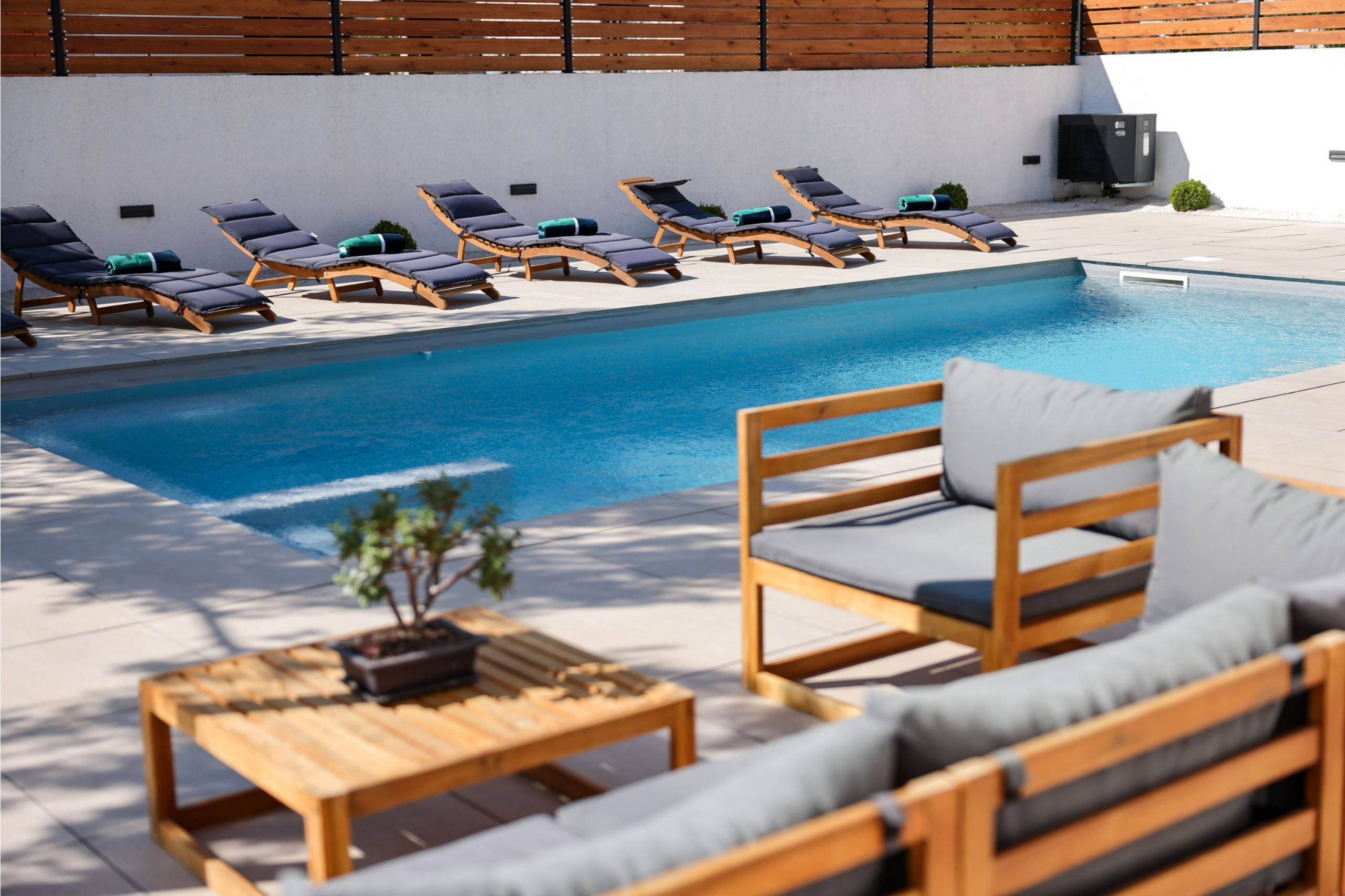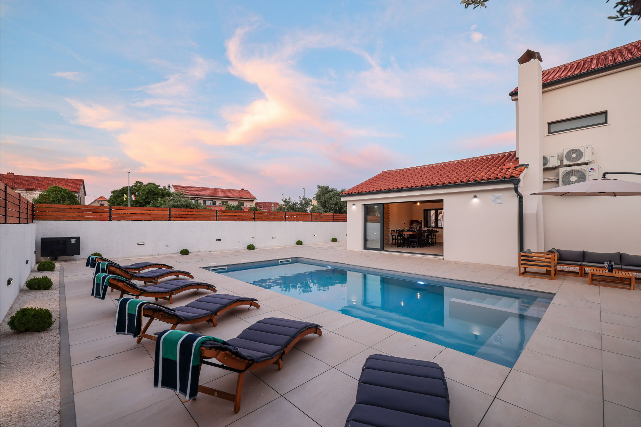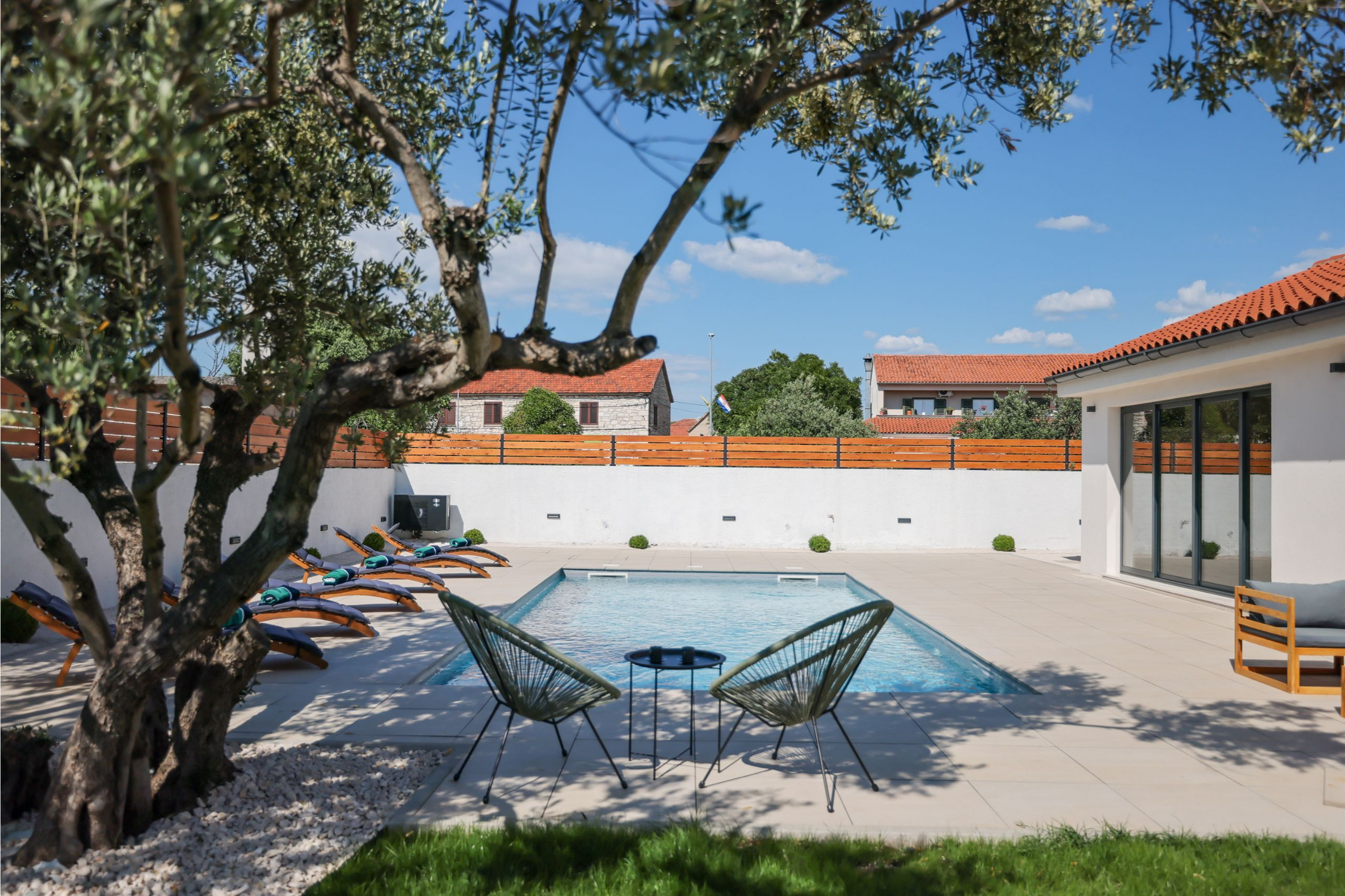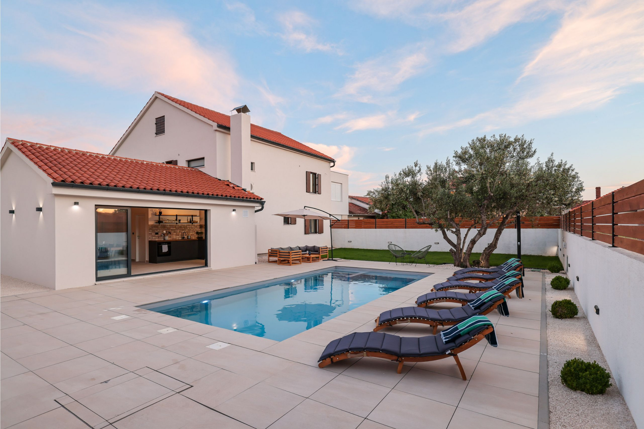 Der Außenbereich der Villa ist gleichermaßen einladend. Der Garten ist vollständig eingezäunt und bietet Privatsphäre und Sicherheit, insbesondere für Familien mit Kindern oder Haustieren. Im Herzen des Gartens befindet sich ein beheizter Swimmingpool (32 m²), der von Sonnenliegen umgeben ist. Es gibt auch eine Outdoor-Dusche neben dem Pool und eine überdachte Terrasse mit bequemen Outdoor-Möbeln - perfekt, um den Morgenkaffee zu genießen oder im Freien zu speisen. Ein Grillbereich steht Gästen zur Verfügung, die gerne im Freien kochen und essen.