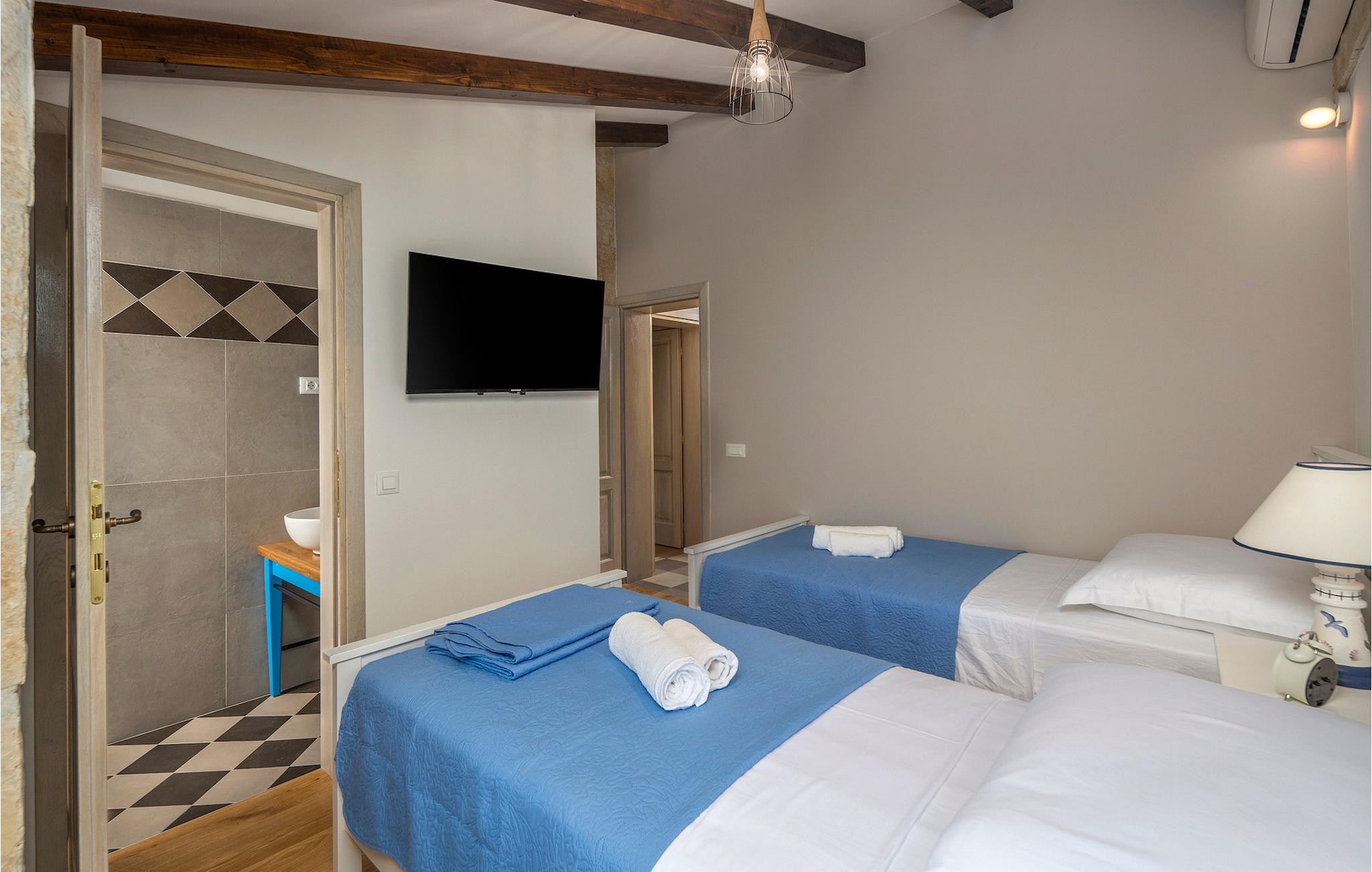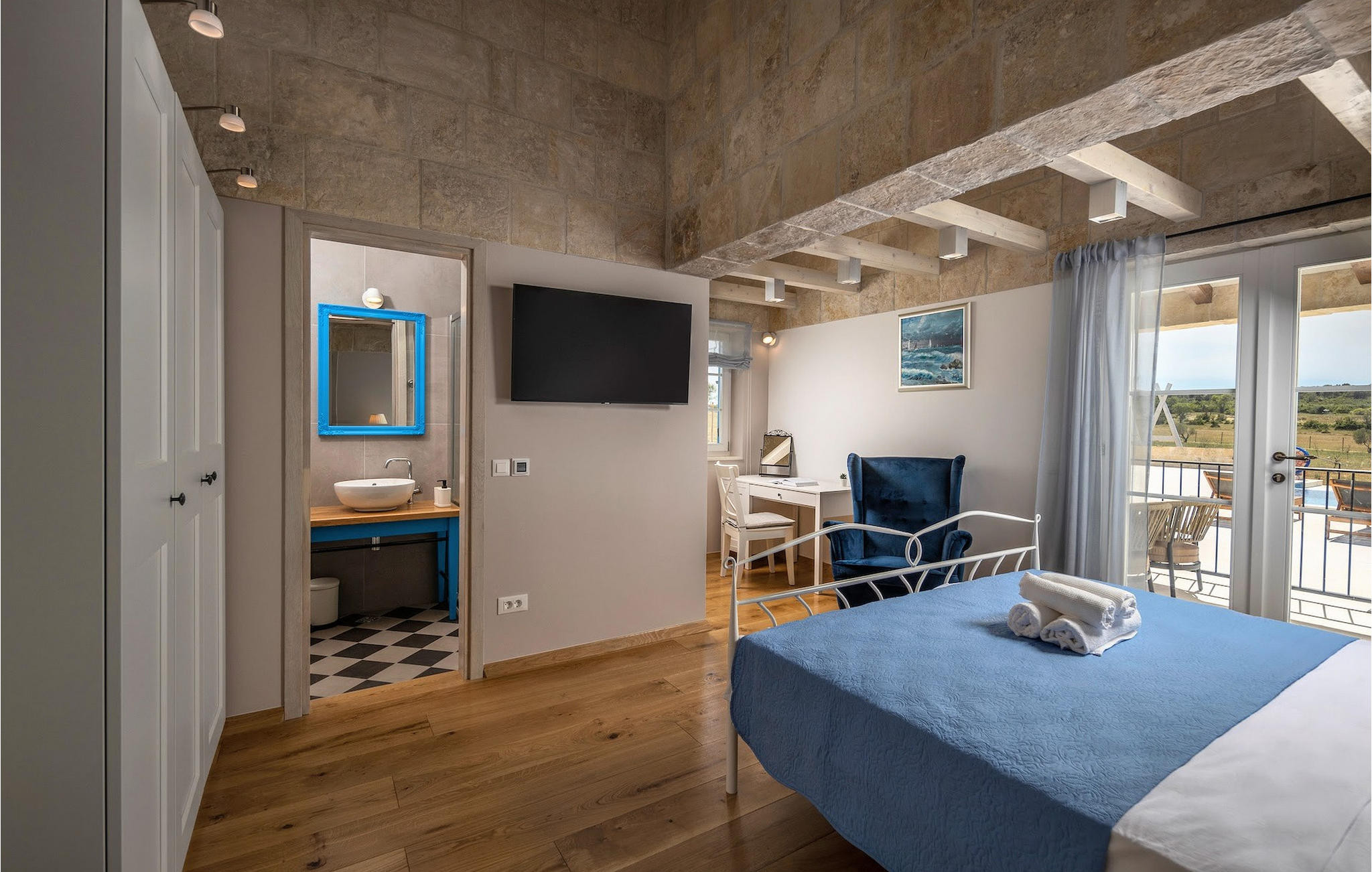 Die Innenräume sind auf einen komfortablen Aufenthalt für bis zu sechs Personen ausgelegt. Die Villa verfügt über drei geräumige Schlafzimmer mit Doppelbetten, drei private Badezimmer sowie zwei zusätzliche WCs. Der Grundriss ist funktional und angenehm – ideal für Familien oder Freundesgruppen.