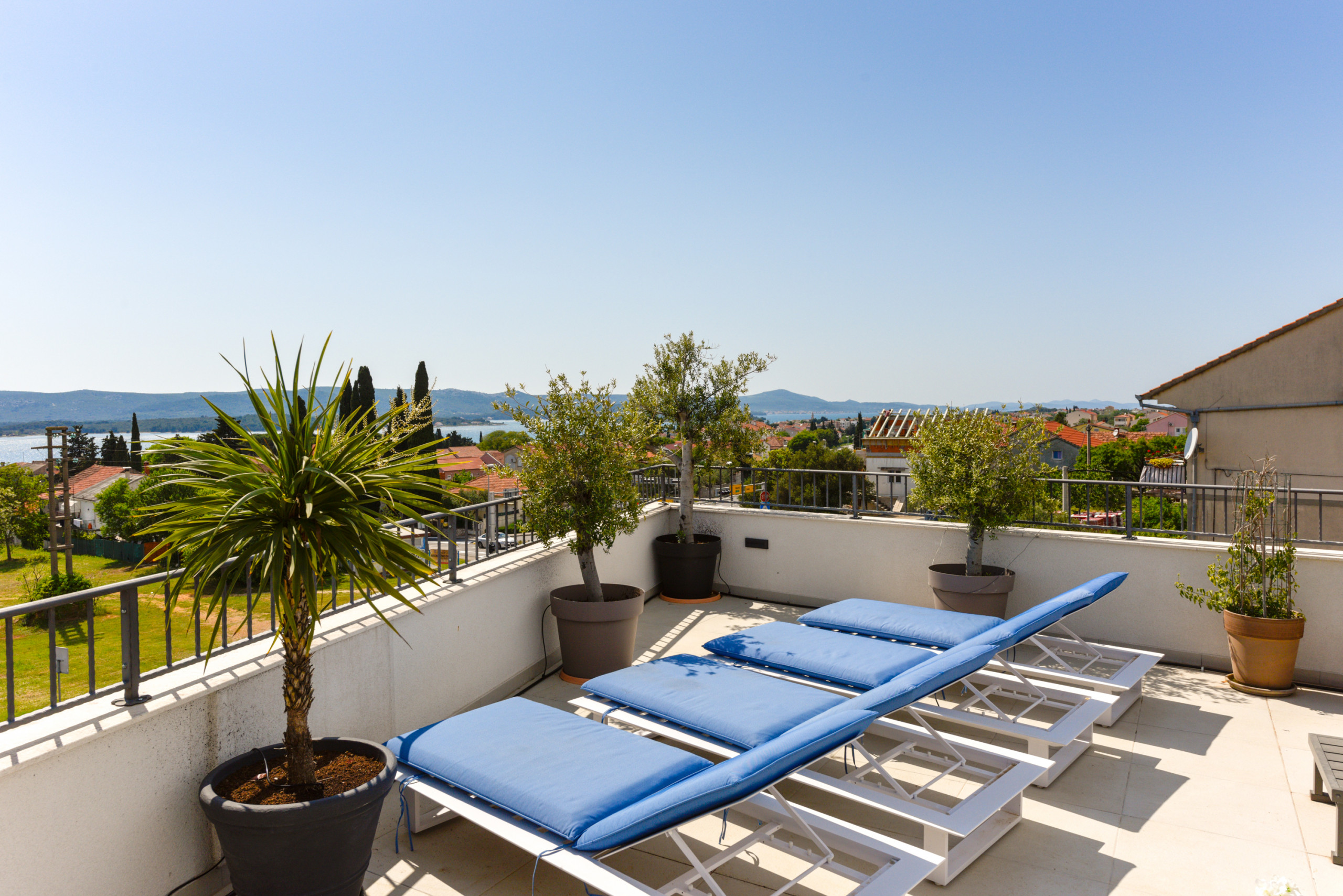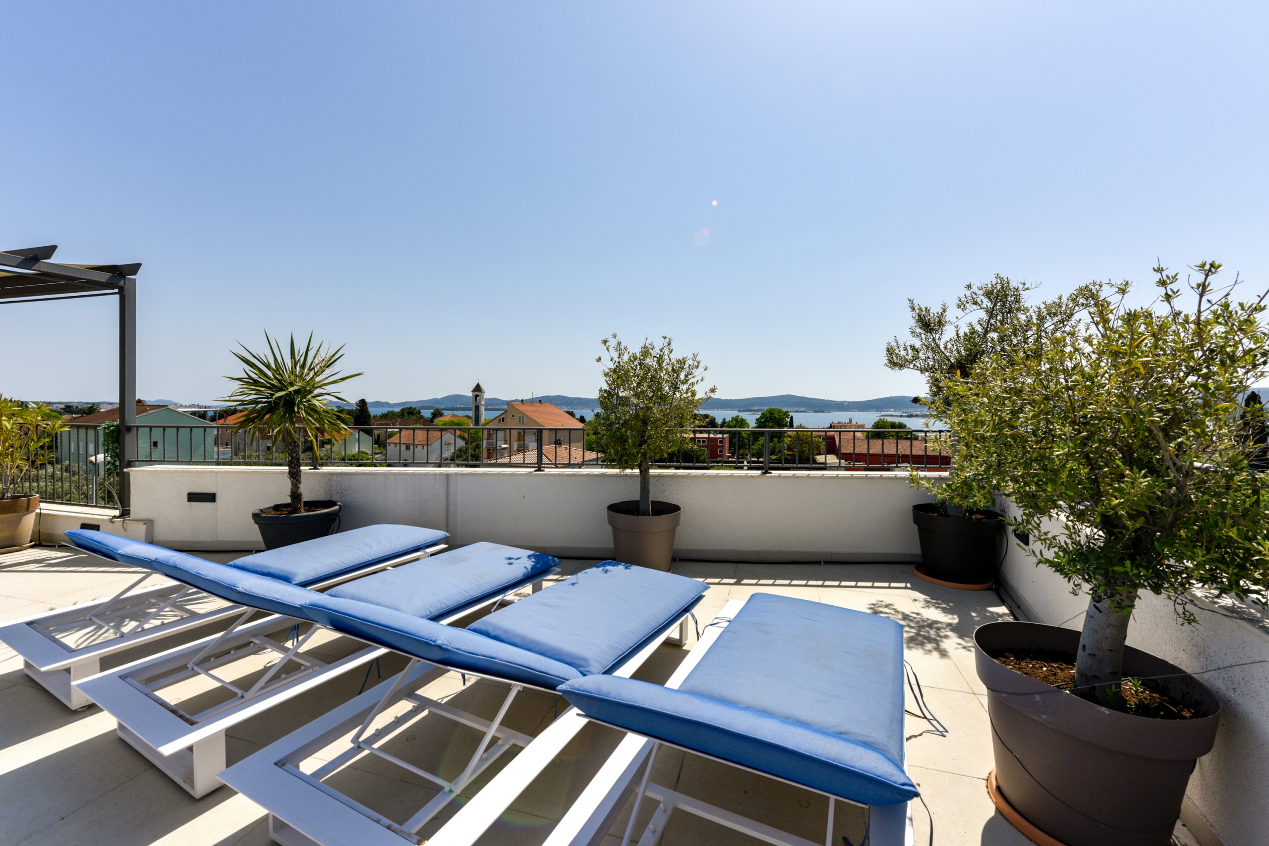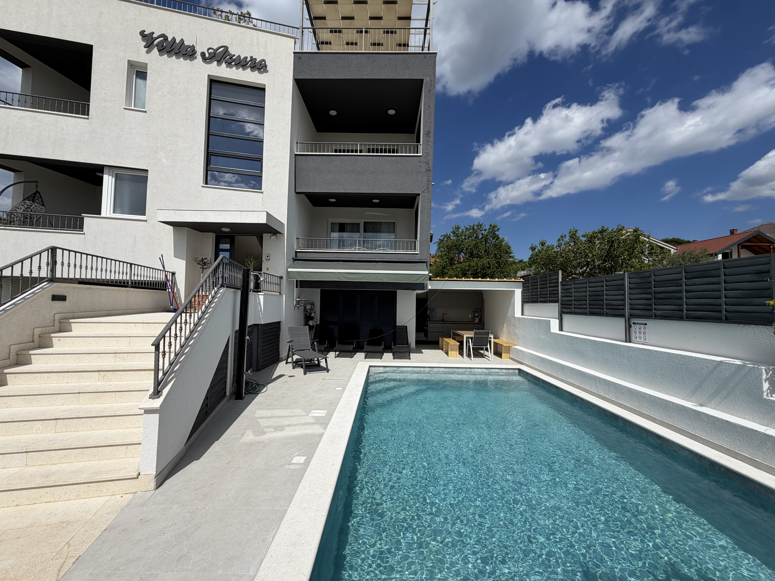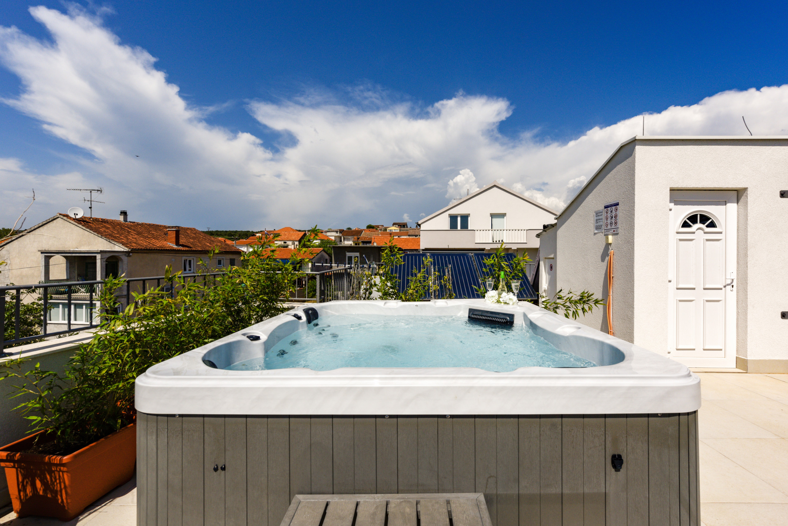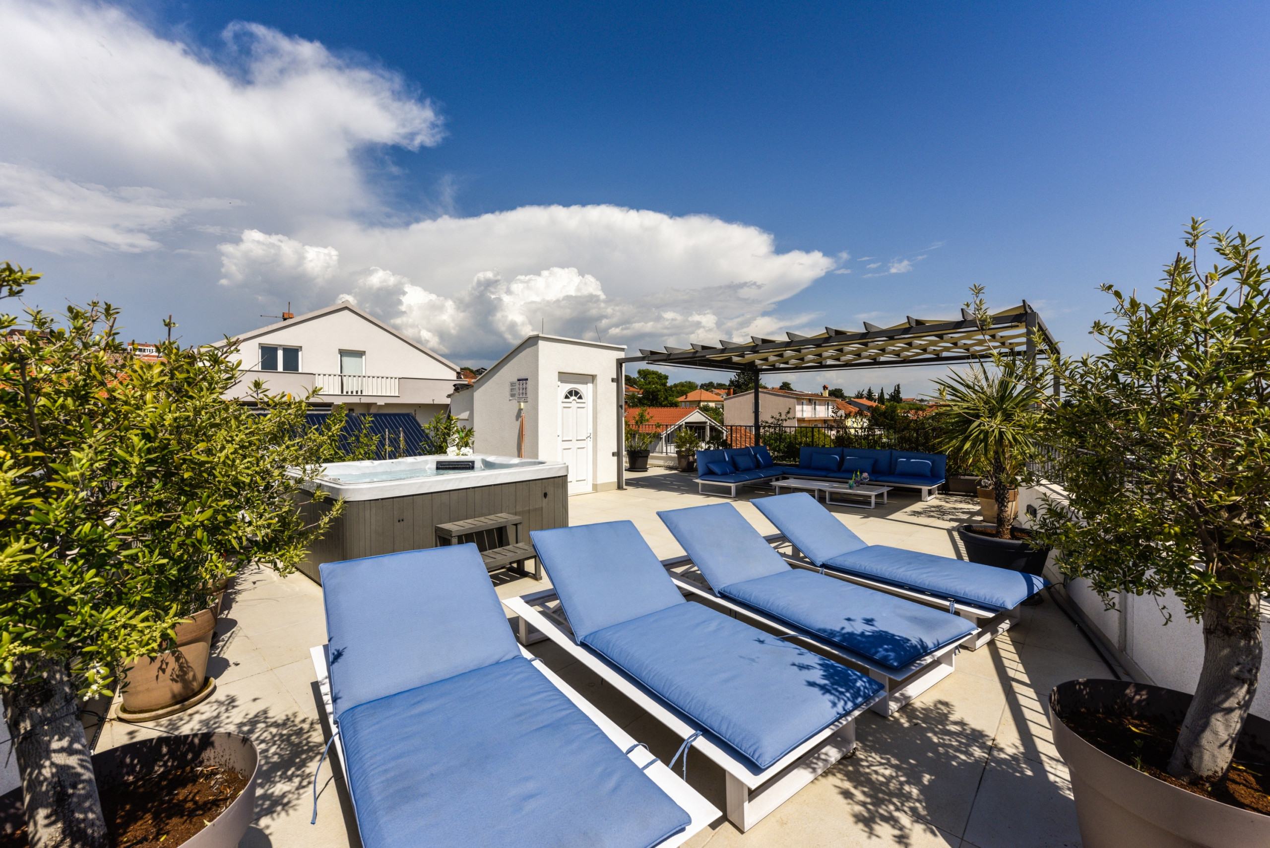 Auf der obersten Etage befindet sich eine schöne Dachterrasse mit Whirlpool, Meerblick, Loungebereich und Liegestühlen. uxuriöse Villa "Azuro" befindet sich in Sveti Filip i Jakov , nur 3 km von Biograd und 25 km südlich der historischen Stadt Zadar . Die neue und moderne Villa verfügt über insgesammt 6 Schlafzimmer sowie 6 Duschbäder, 3 offenen Wohnbereichen mit Esstischen, gut ausgestatteten Küchen sowie insgesammt 4 möblierten überdachten Balkonen mit herrlichem Meerblick.