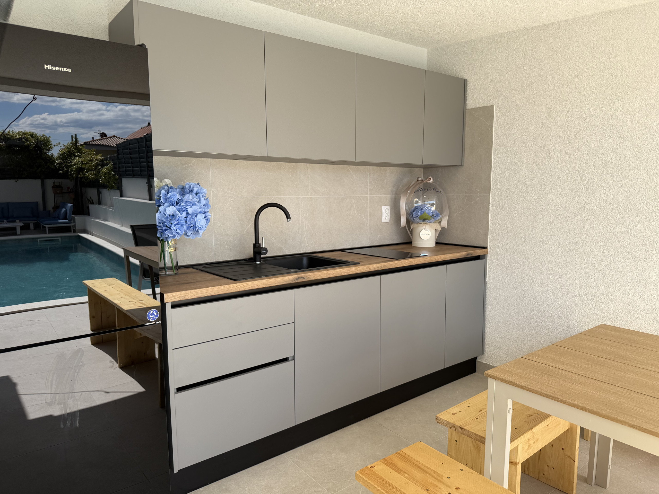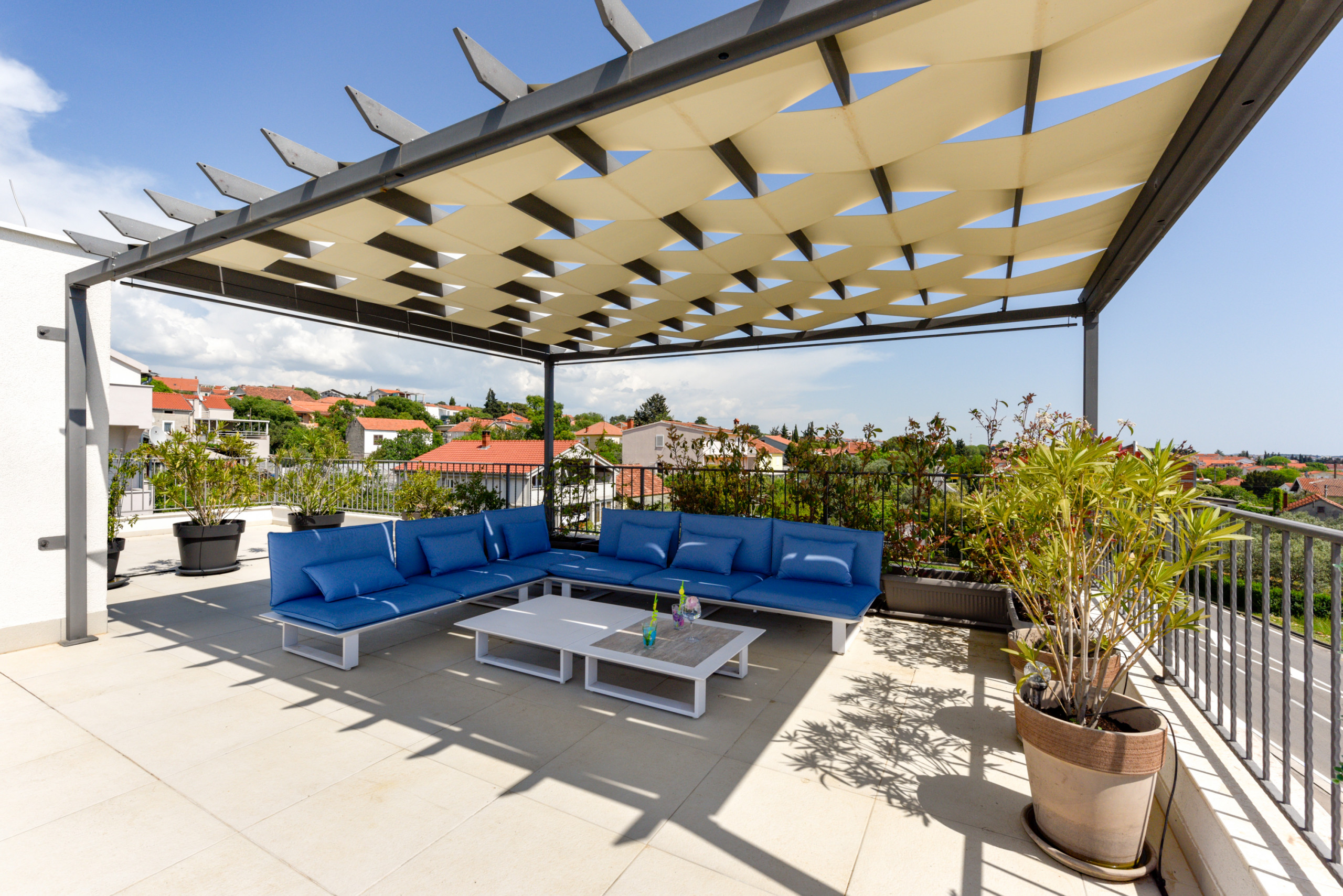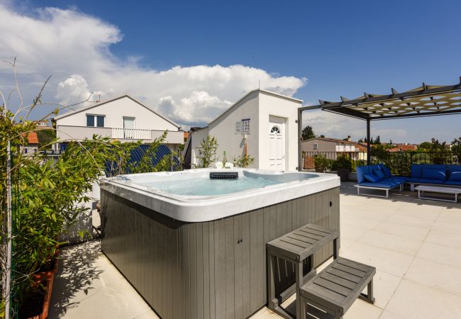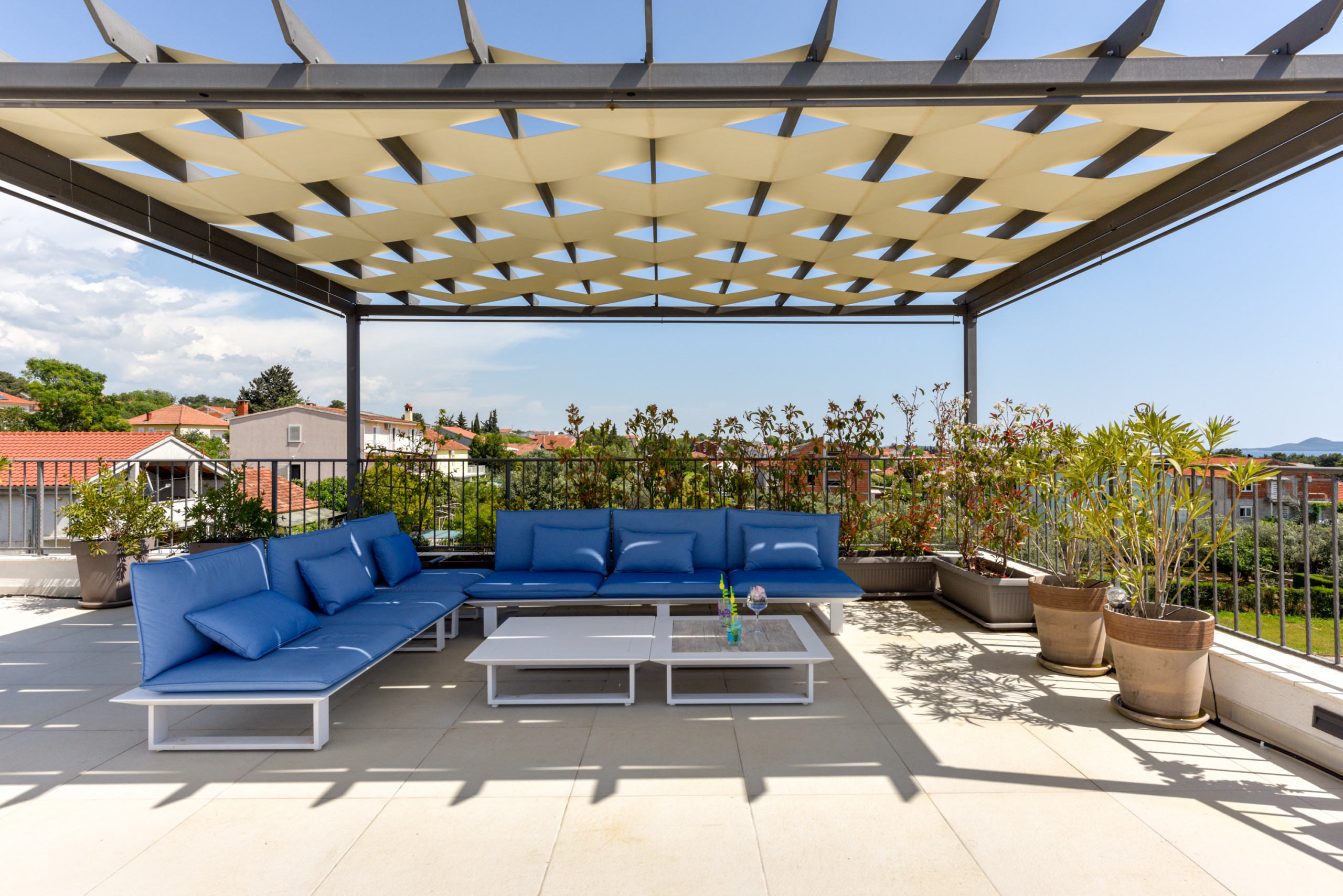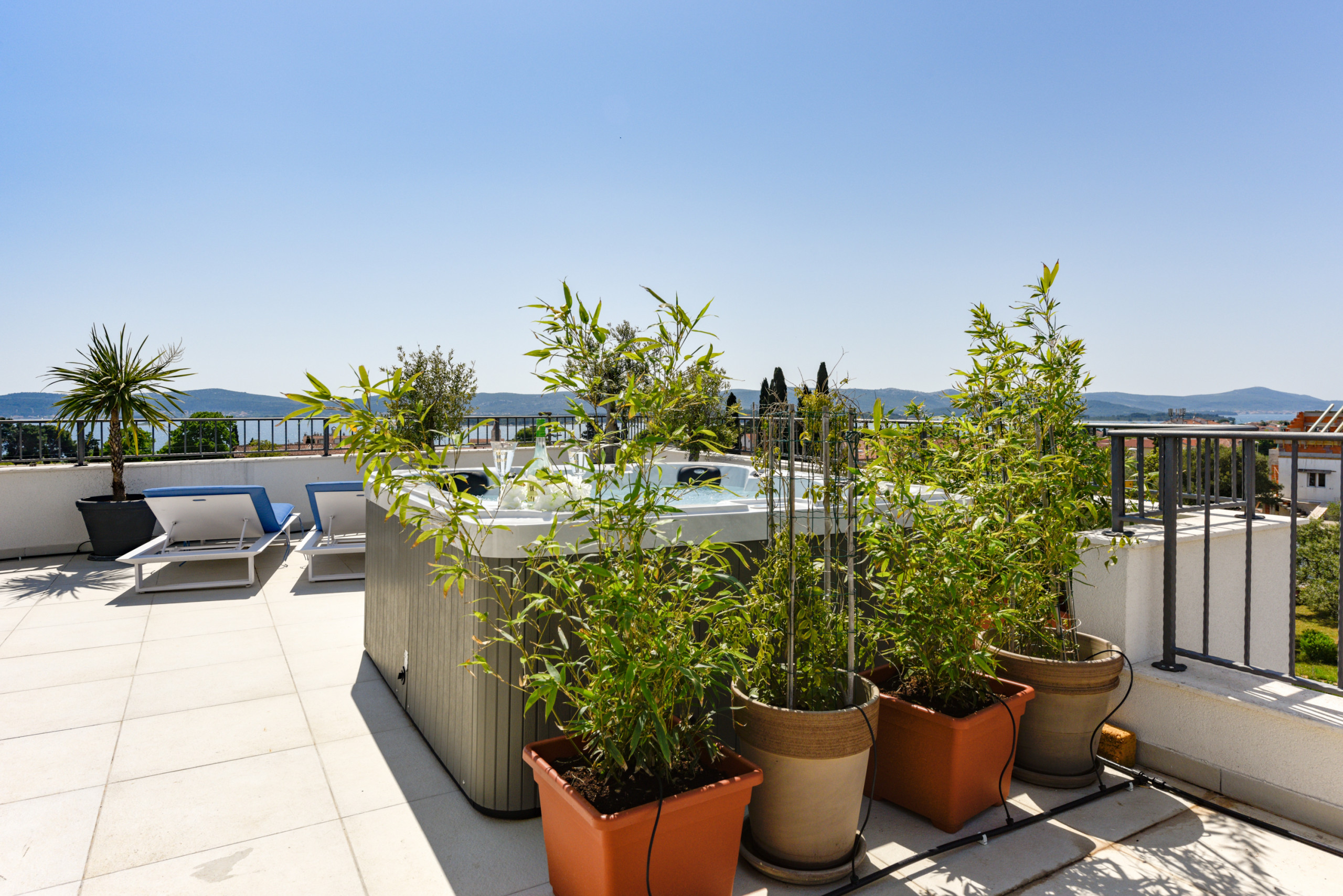 Auf der obersten Etage befindet sich eine schöne Dachterrasse mit Whirlpool, Meerblick, Loungebereich und Liegestühlen. uxuriöse Villa "Azuro" befindet sich in Sveti Filip i Jakov , nur 3 km von Biograd und 25 km südlich der historischen Stadt Zadar . Die neue und moderne Villa verfügt über insgesammt 6 Schlafzimmer sowie 6 Duschbäder, 3 offenen Wohnbereichen mit Esstischen, gut ausgestatteten Küchen sowie insgesammt 4 möblierten überdachten Balkonen mit herrlichem Meerblick.