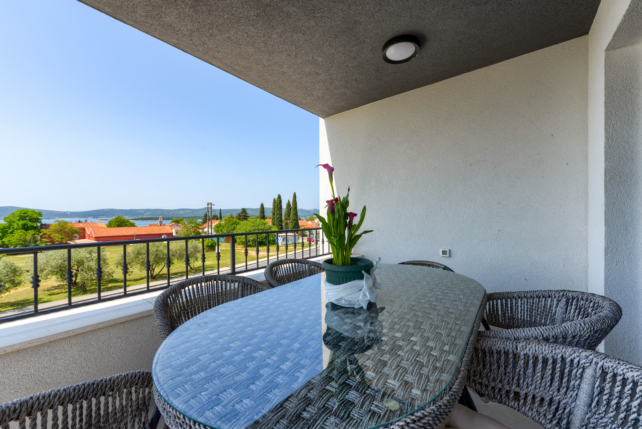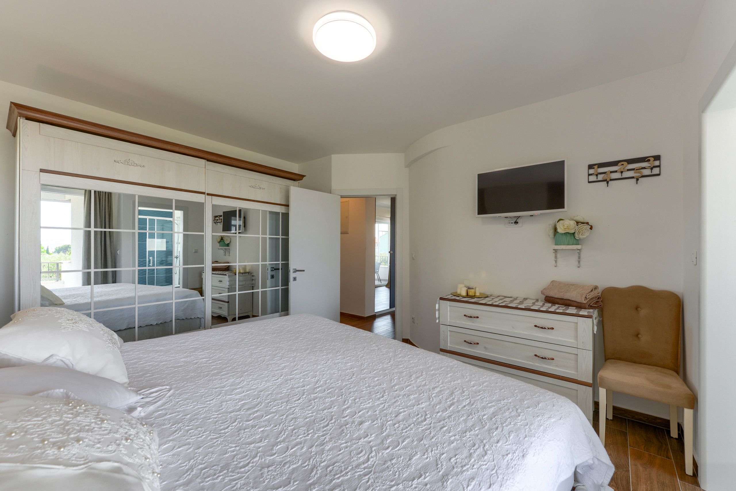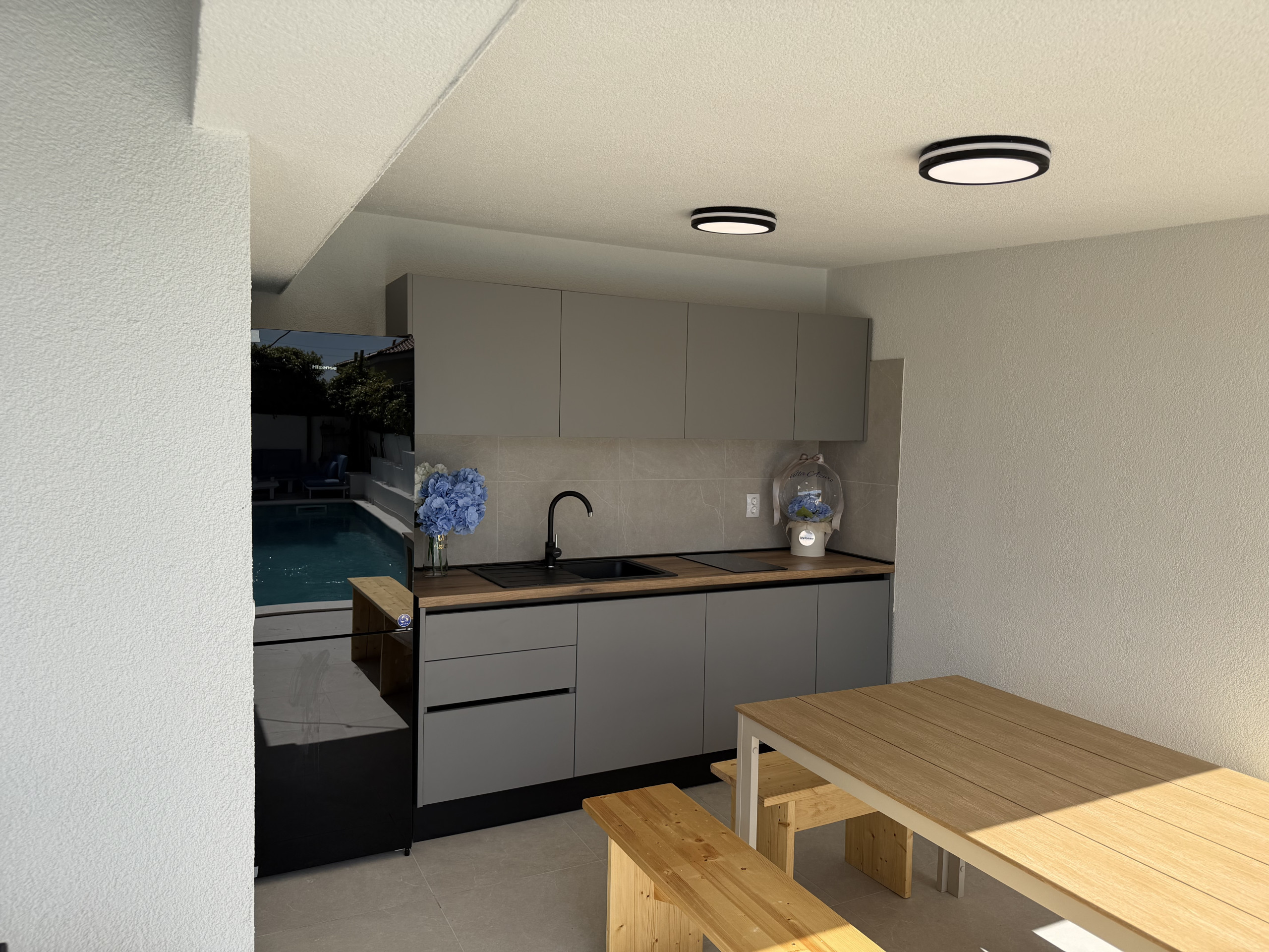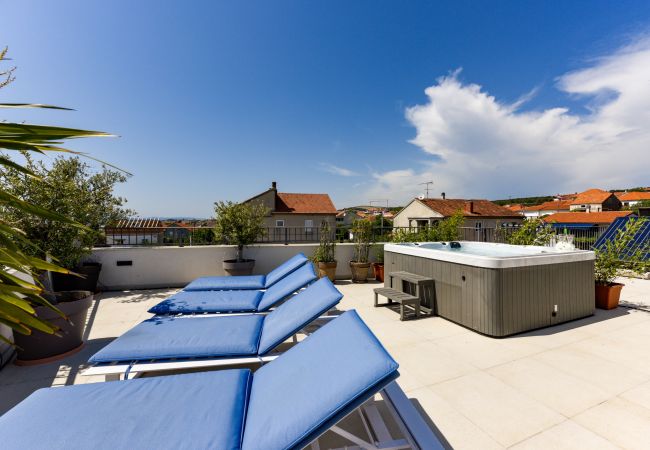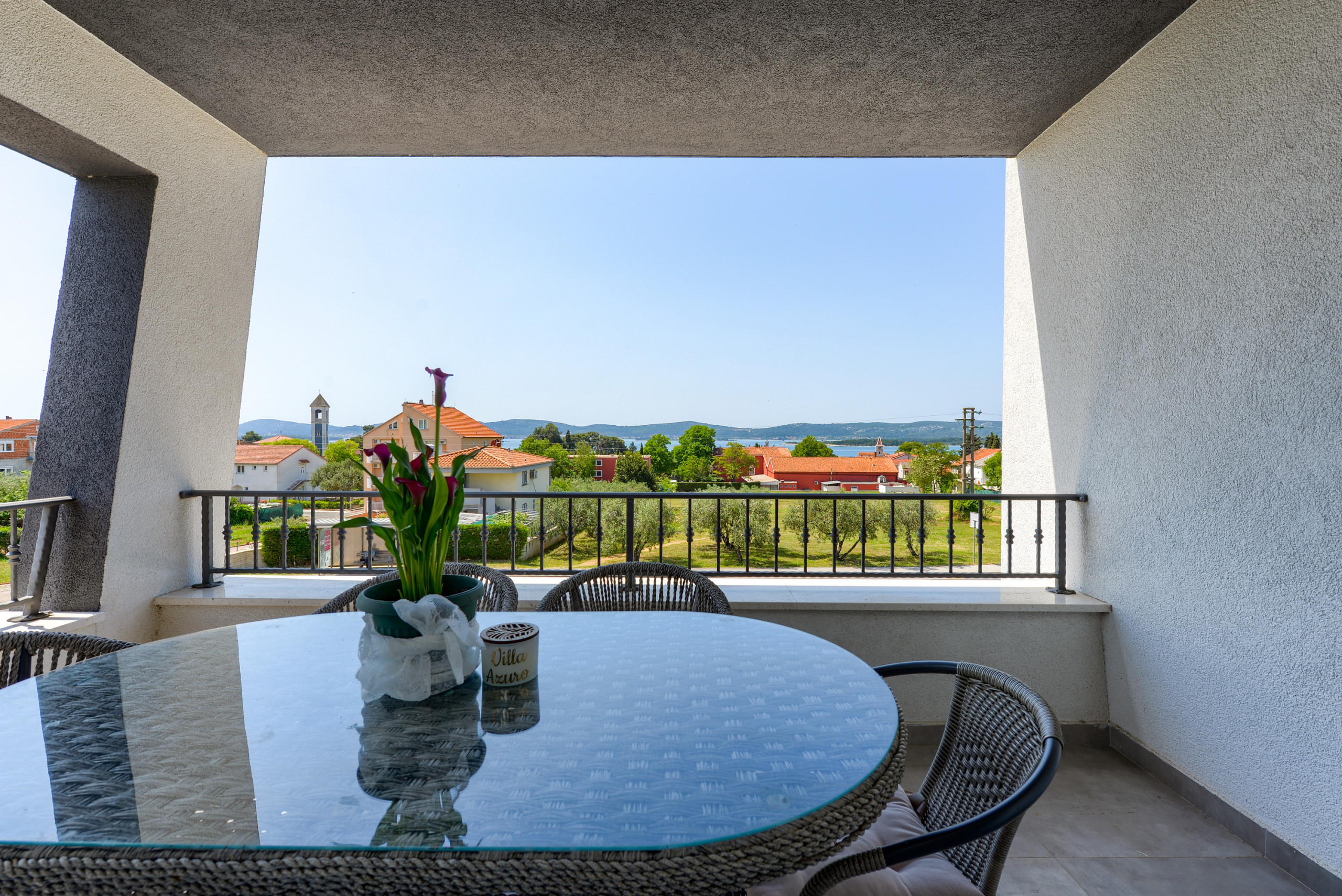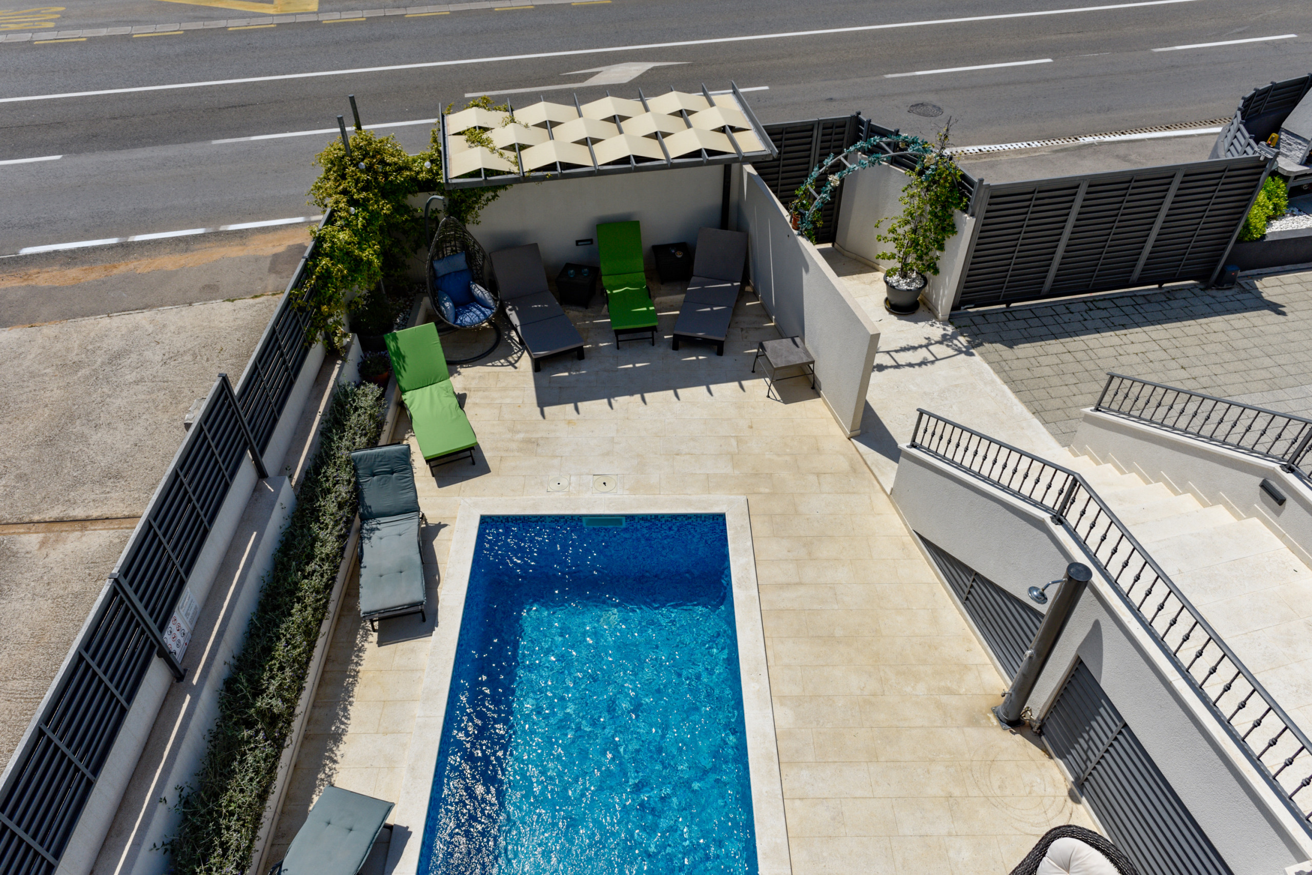 Auf der obersten Etage befindet sich eine schöne Dachterrasse mit Whirlpool, Meerblick, Loungebereich und Liegestühlen. uxuriöse Villa "Azuro" befindet sich in Sveti Filip i Jakov , nur 3 km von Biograd und 25 km südlich der historischen Stadt Zadar . Die neue und moderne Villa verfügt über insgesammt 6 Schlafzimmer sowie 6 Duschbäder, 3 offenen Wohnbereichen mit Esstischen, gut ausgestatteten Küchen sowie insgesammt 4 möblierten überdachten Balkonen mit herrlichem Meerblick.