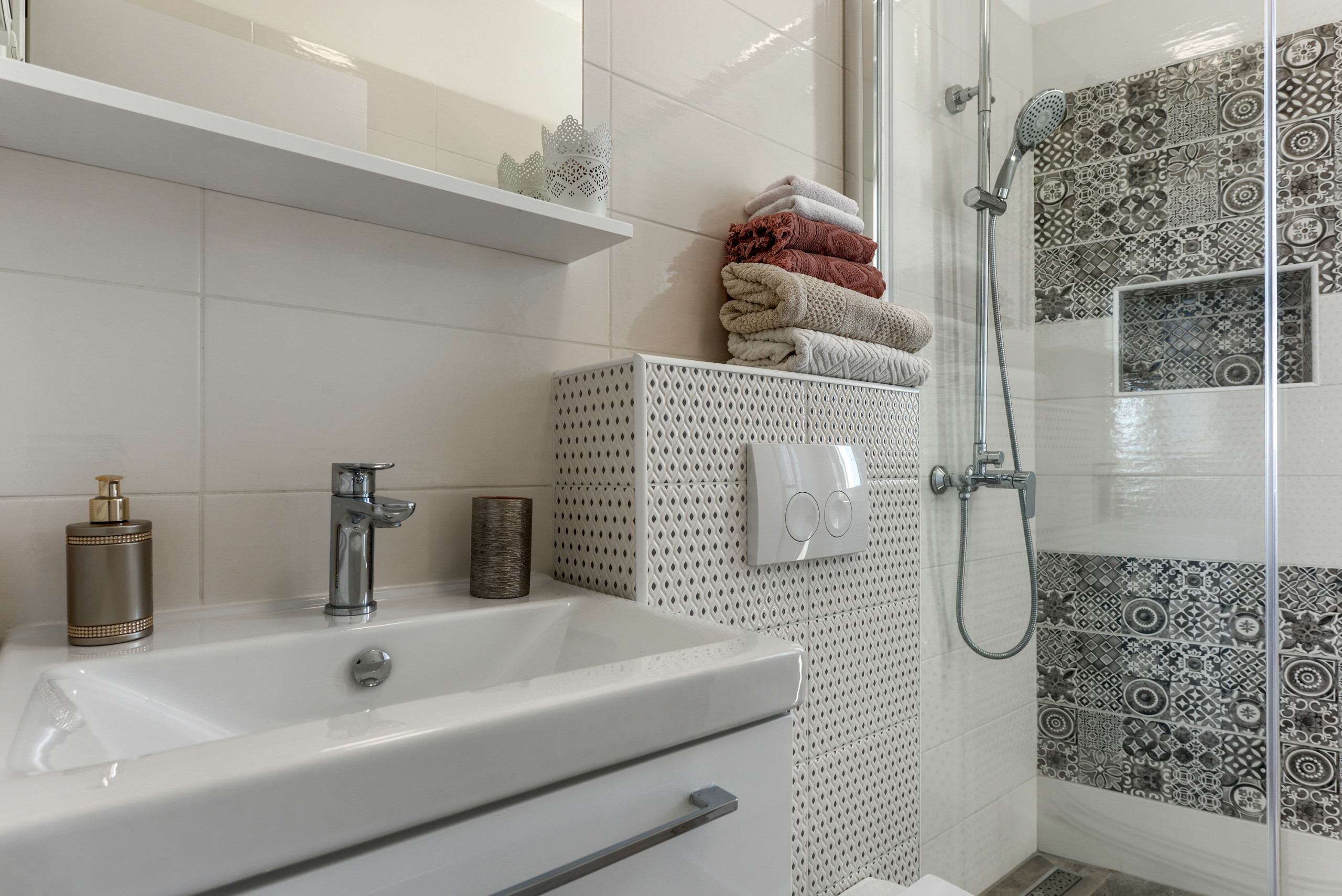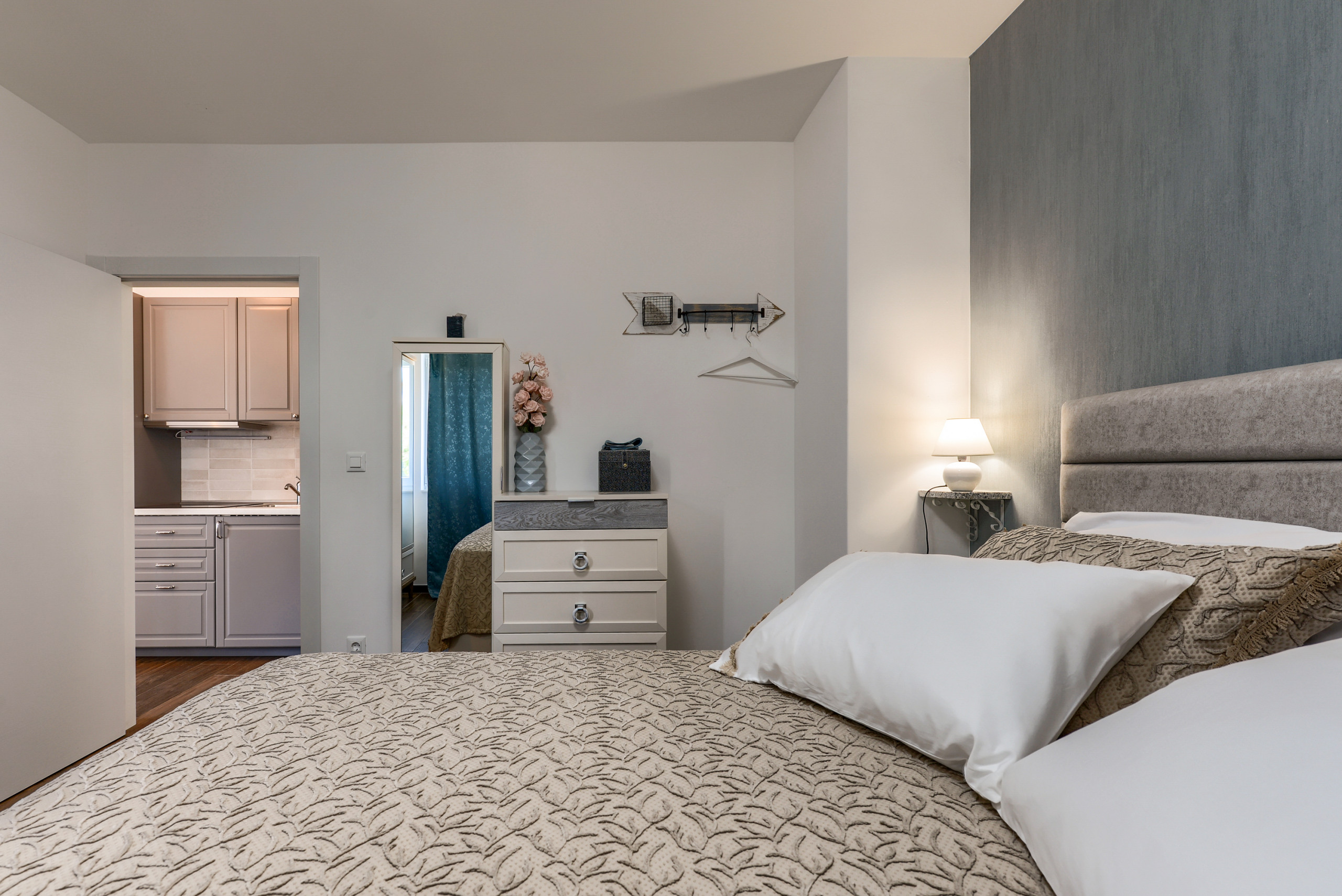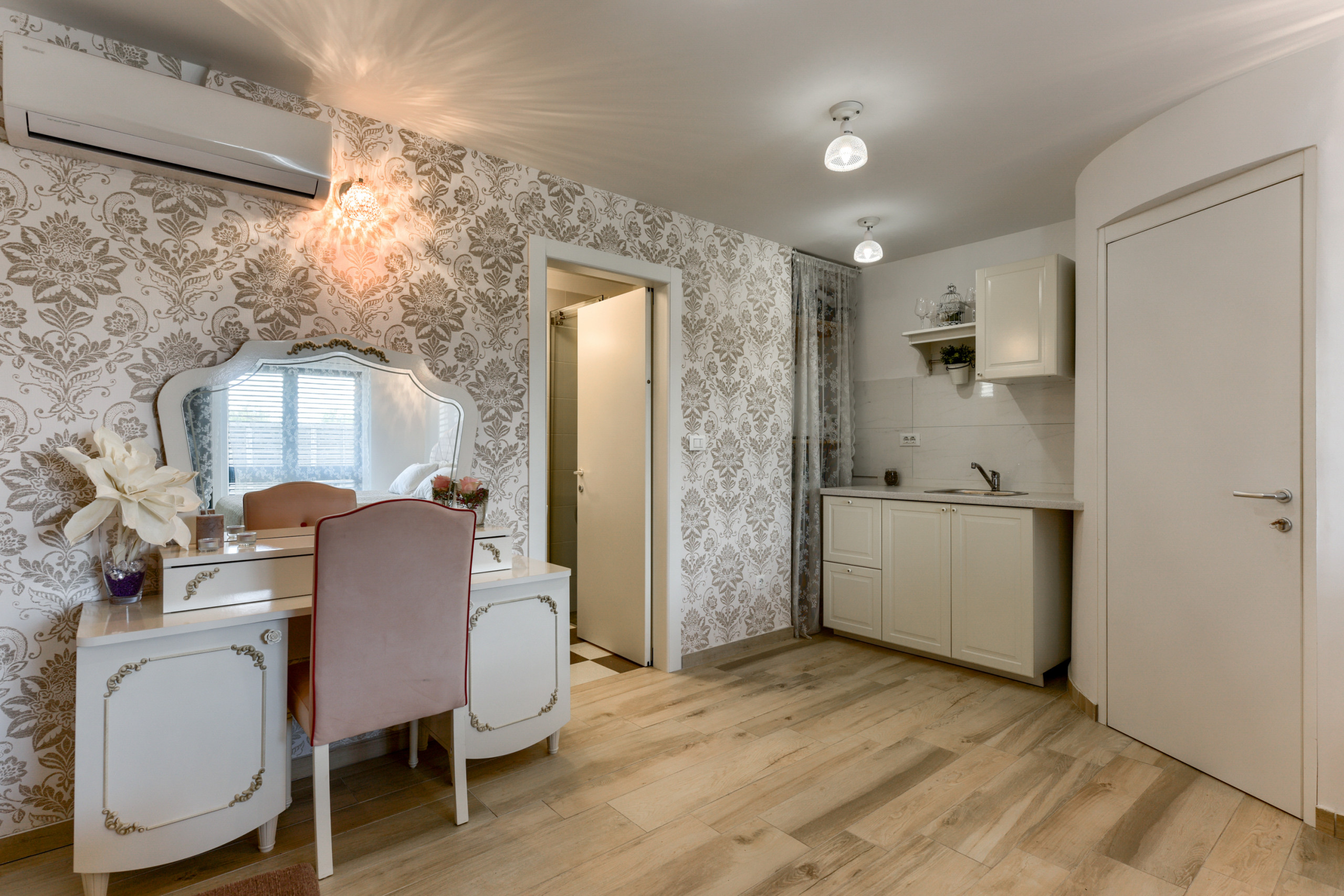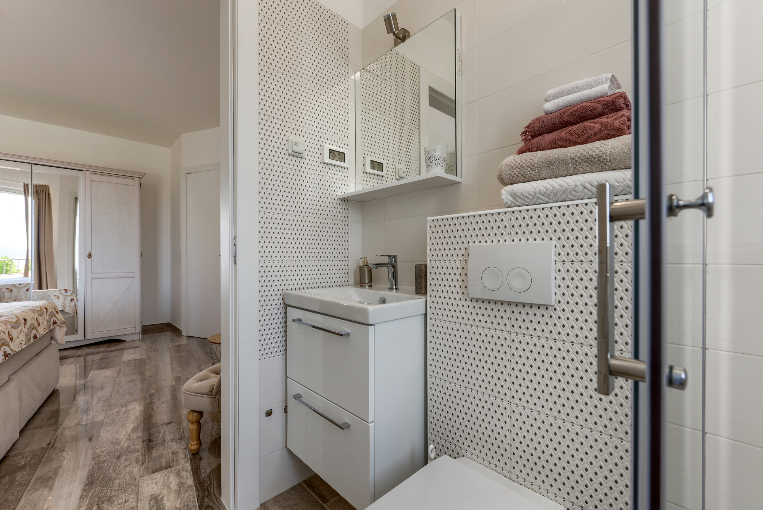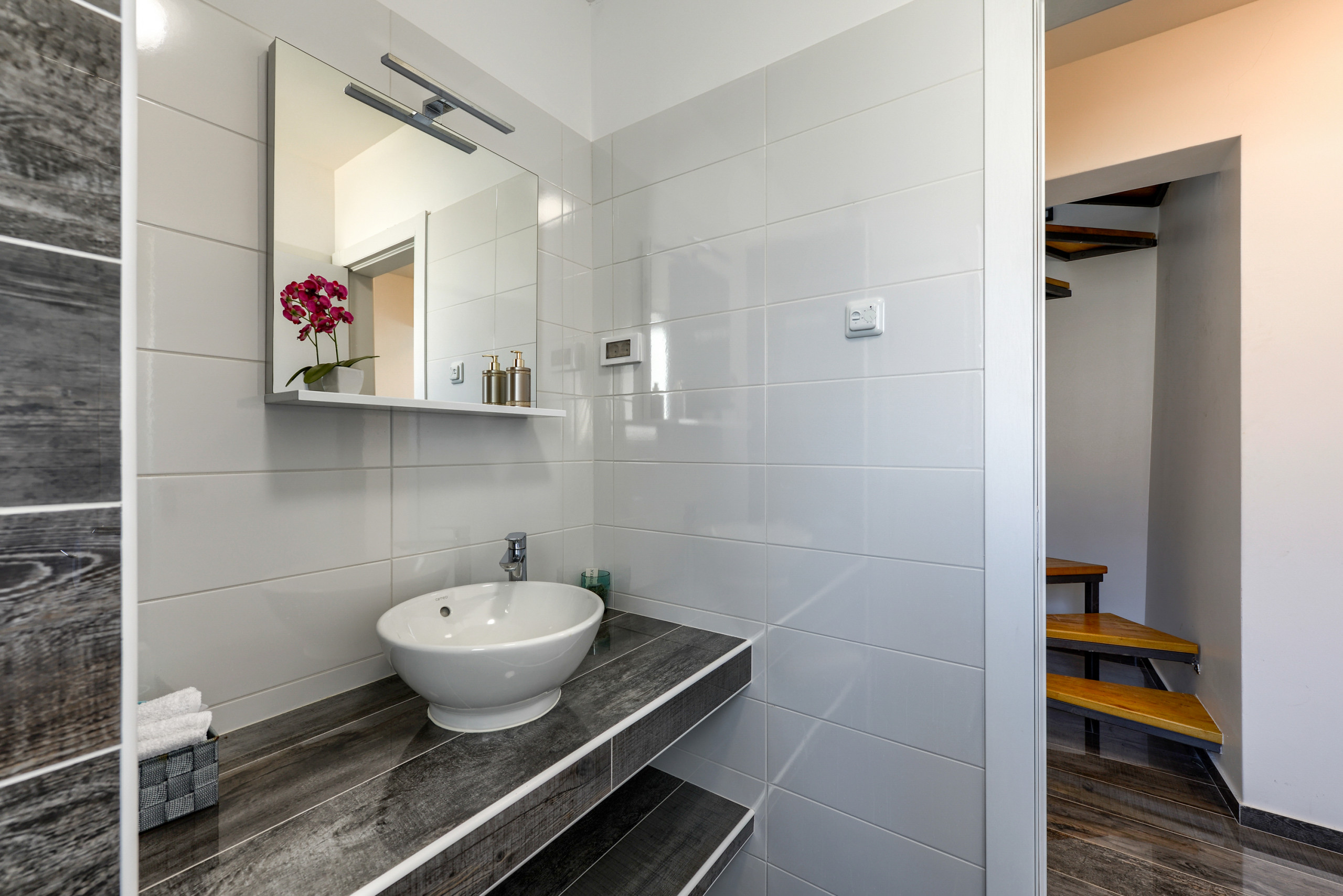Im ersten Stock befinden sich weitere 3 Doppelzimmer, jedes mit eigenem Bad, kleinerer Küche, Wohn- und Didin-Bereich.