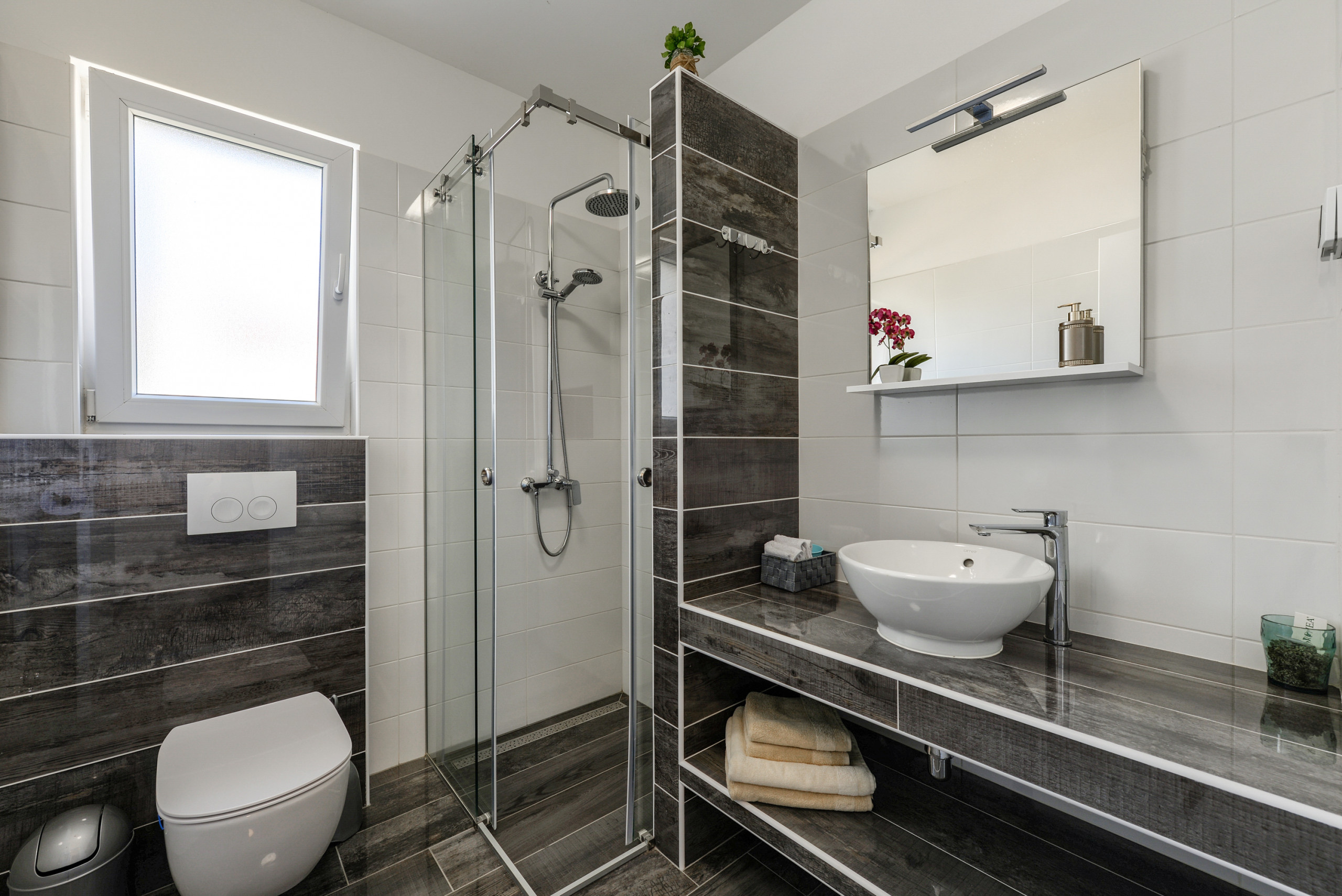 Im Erdgeschoss befinden sich 3 Doppelzimmer, jedes mit eigenem Bad, kicthen, Ess- und Wohnen in einem, exitz zur Terrasse.