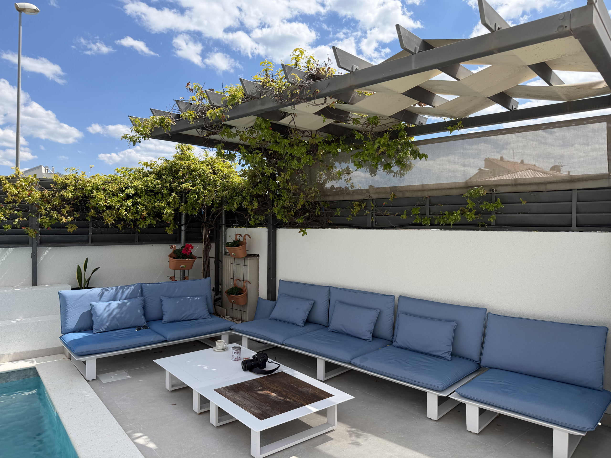 Eine Pergola mit gemütlicher hochwertiger Lounchgarnitur ist ebenfalls auf der Dachterrasse untergebracht. Hier lässt es sich wunderbar entspannen bei einem Glas Wein und mann kann die schönsten Sonnenuntergänge geniessen.